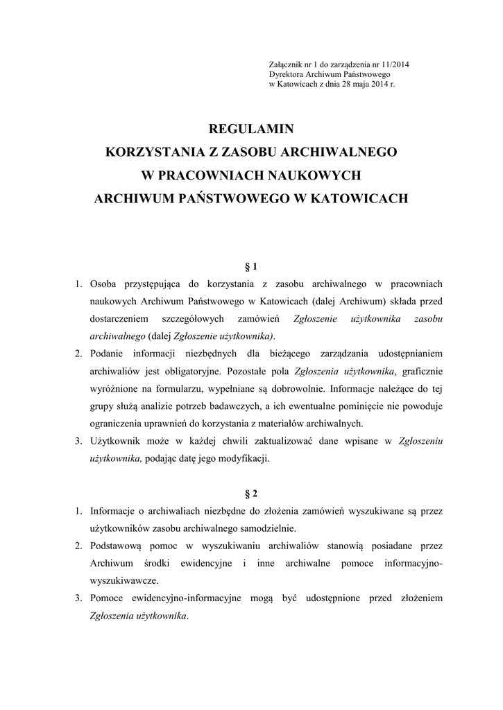 Załącznik nr 1 do zarządzenia nr 11/2014 Dyrektora Archiwum Państwowego w Katowicach z dnia 28 maja 2014 r. REGULAMIN KORZYSTANIA Z ZASOBU ARCHIWALNEGO W PRACOWNIACH NAUKOWYCH ARCHIWUM PAŃSTWOWEGO W KATOWICACH §1 1. Osoba przystępująca do korzystania z zasobu archiwalnego w pracowniach naukowych Archiwum Państwowego w Katowicach (dalej Archiwum) składa przed dostarczeniem szczegółowych zamówień Zgłoszenie użytkownika zasobu archiwalnego (dalej Zgłoszenie użytkownika). 2. Podanie informacji niezbędnych dla bieżącego zarządzania udostępnianiem archiwaliów jest obligatoryjne. Pozostałe pola Zgłoszenia użytkownika, graficznie wyróżnione na formularzu, wypełniane są dobrowolnie. Informacje należące do tej grupy służą analizie potrzeb badawczych, a ich ewentualne pominięcie nie powoduje ograniczenia uprawnień do korzystania z materiałów archiwalnych. 3. Użytkownik może w każdej chwili zaktualizować dane wpisane w Zgłoszeniu użytkownika, podając datę jego modyfikacji. §2 1. Informacje o archiwaliach niezbędne do złożenia zamówień wyszukiwane są przez użytkowników zasobu archiwalnego samodzielnie. 2. Podstawową pomoc w wyszukiwaniu archiwaliów stanowią posiadane przez Archiwum środki ewidencyjne i inne archiwalne pomoce informacyjno- wyszukiwawcze. 3. Pomoce ewidencyjno-informacyjne mogą być udostępnione przed złożeniem Zgłoszenia użytkownika. 2 4. Dostęp do pomocy ewidencyjno-informacyjnych może być ograniczony ze względu na przeszkody prawne, w szczególności w zakresie ochrony informacji niejawnych, danych osobowych albo dóbr osobistych, w trybie odmowy dostępu do materiałów archiwalnych. 5. Ogólnych informacji o zasobie Archiwum, dostępnych pomocach ewidencyjnoinformacyjnych i o zasadach udostępniania zasobu udzielają pracownicy Archiwum dyżurujący w pracowni naukowej. §3 Udostępnieniu w pracowni naukowej podlegają archiwalia: 1. Zewidencjonowane, tzn. wyposażone w środki ewidencyjne, które umożliwiają identyfikację poszczególnych jednostek archiwalnych o określonej zawartości lub jednorodnych pod względem zawartości grup jednostek. 2. Opatrzone paginacją lub foliacją. 3. Będące w stanie fizycznym niepowodującym istotnych przeciwwskazań konserwatorskich do ich użytkowania. §4 Dostęp do archiwaliów może zostać ograniczony ze względu na zły stan fizyczny archiwaliów lub prawną ochronę określonych informacji, poprzez: 1. Uzasadniony wymóg złożenia przez użytkownika wyjaśnień bądź oświadczeń albo udokumentowania szczególnych uprawnień do zapoznania się z treścią żądanych przezeń materiałów archiwalnych, w szczególności poprzez przedłożenie upoważnienia zleceniodawcy, na którego rzecz użytkownik działa, albo zgody dysponenta dokumentacji deponowanej lub przekazanej do archiwum z zastrzeżeniem jej ograniczonej dostępności, itp. 2. Wymóg podpisania zobowiązania użytkownika do wykorzystania informacji uzyskanych na podstawie udostępnionych materiałów archiwalnych, a mających znamiona aktualności, w sposób nienaruszający wolności albo praw, wynikających w szczególności z przepisów chroniących dobra osobiste lub dane osobowe. 3. Ograniczenie korzystania z materiałów archiwalnych do poszczególnych jednostek archiwalnych bądź do określonych dokumentów (fragmentów dokumentów) w obrębie jednostki archiwalnej. 3 4. Ograniczenie lub wykluczenie reprodukowania udostępnionych materiałów archiwalnych. 5. Całkowitą albo częściową odmowę udostępniania materiałów archiwalnych. §5 1. Archiwalia lub ich reprodukcje udostępniane są na podstawie zamówienia-rewersu. Zamówienia wypełnia się osobno dla każdej jednostki archiwalnej. Powinny one być wypełnione czytelnie (drukowanymi literami) długopisem, piórem lub w formie wydruku. 2. Do udostępnianych jednostek archiwalnych dołączane są druki rejestru udostępniania (metryczki). Użytkownik zasobu zobowiązany jest wpisać w odpowiednich polach datę korzystania z jednostki oraz swoje imię i nazwisko; może też podać temat swojej pracy (przedmiot badań). §6 1. Zamówione materiały archiwalne wydawane są uprawnionemu użytkownikowi z podręcznego depozytu pracowni naukowej przy każdorazowym podjęciu przezeń korzystania z archiwaliów. 2. Wydane materiały archiwalne rejestrowane są przez obsługującego użytkownika pracownika w Księdze wizyt użytkowników w pracowni naukowej, w której użytkownik potwierdza ich odbiór własnym podpisem. 3. W przypadku materiałów szczególnie cennych (dokumenty pergaminowe i papierowe) użytkownik przerywający pracę nad udostępnionymi mu archiwaliami i na krótki czas opuszczający pracownię naukową jest zobowiązany do każdorazowego deponowania ich u dyżurnego. 4. Użytkownik może zamówić jednorazowo 5 jednostek archiwalnych, po ich otrzymaniu może zamówić kolejne. W szczególnie uzasadnionych przypadkach limit ten może zostać zmieniony. Ograniczenie wynika z wymogu zabezpieczenia zasobu. 5. Zamówienia na archiwalia w Pracowni Naukowej im. dr. Michała Antonowa Centrali w Katowicach realizowane są cztery razy dziennie: a) zamówienia złożone do godz. 9.30 są realizowane o godz. 10.30 b) zamówienia złożone między 9.30 a 10.30 realizowane są o godz. 11.30 c) zamówienia złożone między 10.30 a 11.30 realizowane są o godz. 12.30 d) zamówienia złożone między 11.30 a 12.30 realizowane są o godz. 13.30. 4 Zamówienia złożone po godz. 12.30 realizowane są w następnym dniu roboczym. W wyjątkowych wypadkach (np. duża ilość zamówień, akta wymagające dłuższego przygotowania, konieczność konserwacji) czas realizacji zamówienia może ulec wydłużeniu. O przybliżonym okresie realizacji takiego zamówienia Archiwum zawiadomi korzystającego w możliwie najkrótszym czasie. 6. Szczególnie cenne archiwalia (dokumenty pergaminowe i papierowe) udostępniane są wyłącznie do godziny 14.00 i