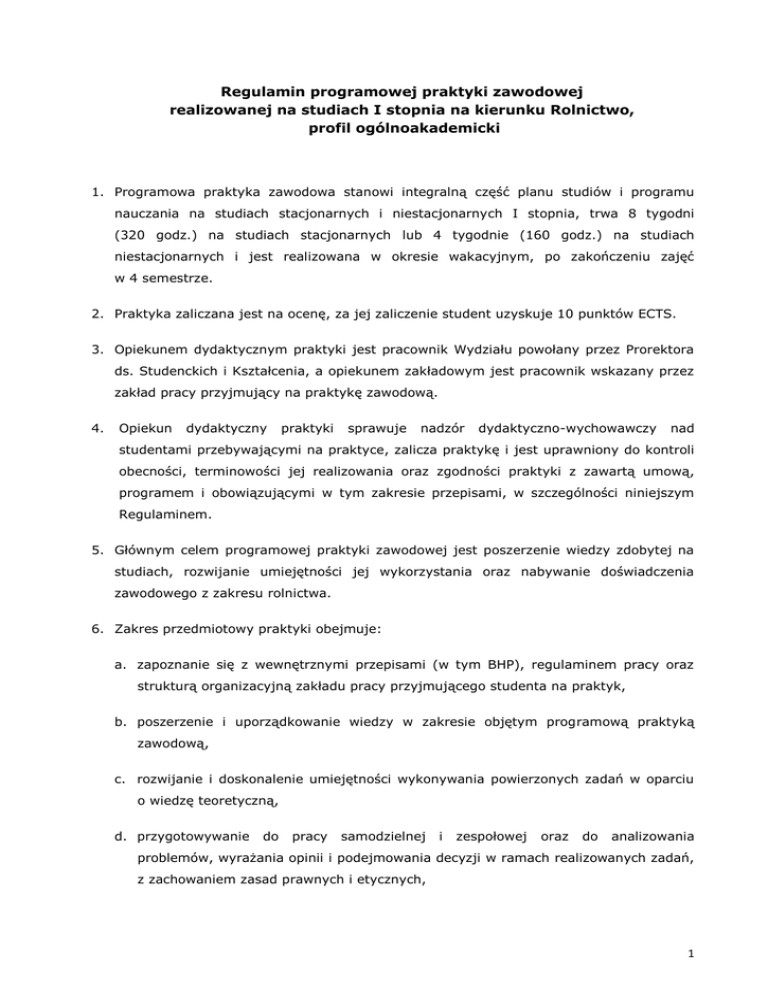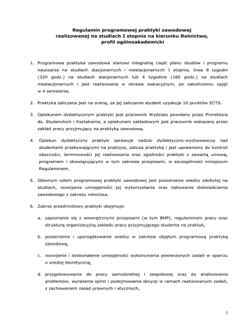 Regulamin programowej praktyki zawodowej realizowanej na studiach I stopnia na kierunku Rolnictwo, profil ogólnoakademicki 1. Programowa praktyka zawodowa stanowi integralną część planu studiów i programu nauczania na studiach stacjonarnych i niestacjonarnych I stopnia, trwa 8 tygodni (320 godz.) na studiach stacjonarnych lub 4 tygodnie (160 godz.) na studiach niestacjonarnych i jest realizowana w okresie wakacyjnym, po zakończeniu zajęć w 4 semestrze. 2. Praktyka zaliczana jest na ocenę, za jej zaliczenie student uzyskuje 10 punktów ECTS. 3. Opiekunem dydaktycznym praktyki jest pracownik Wydziału powołany przez Prorektora ds. Studenckich i Kształcenia, a opiekunem zakładowym jest pracownik wskazany przez zakład pracy przyjmujący na praktykę zawodową. 4. Opiekun dydaktyczny praktyki sprawuje nadzór dydaktyczno-wychowawczy nad studentami przebywającymi na praktyce, zalicza praktykę i jest uprawniony do kontroli obecności, terminowości jej realizowania oraz zgodności praktyki z zawartą umową, programem i obowiązującymi w tym zakresie przepisami, w szczególności niniejszym Regulaminem. 5. Głównym celem programowej praktyki zawodowej jest poszerzenie wiedzy zdobytej na studiach, rozwijanie umiejętności jej wykorzystania oraz nabywanie doświadczenia zawodowego z zakresu rolnictwa. 6. Zakres przedmiotowy praktyki obejmuje: a. zapoznanie się z wewnętrznymi przepisami (w tym BHP), regulaminem pracy oraz strukturą organizacyjną zakładu pracy przyjmującego studenta na praktyk, b. poszerzenie i uporządkowanie wiedzy w zakresie objętym programową praktyką zawodową, c. rozwijanie i doskonalenie umiejętności wykonywania powierzonych zadań w oparciu o wiedzę teoretyczną, d. przygotowywanie do pracy samodzielnej i zespołowej oraz do analizowania problemów, wyrażania opinii i podejmowania decyzji w ramach realizowanych zadań, z zachowaniem zasad prawnych i etycznych, 1 e. zapoznanie się z techniką oraz procesami technologicznymi w zakresie uprawy roślin, zbioru oraz konserwacji pasz i produkcji zwierzęcej, f. nabycie i doskonalenie umiejętności z zakresu podstaw prowadzenia produkcji roślinnej, zwierzęcej, mechanizacji prac oraz organizacji i zarządzania gospodarstwem rolnym, g. poznanie współzależności pomiędzy produkcją roślinną i zwierzęcą a pozostałymi działami produkcji rolniczej. 7. Zakład pracy przyjmujący studenta na praktykę zawodową może zawęzić lub poszerzyć zakres przedmiotowy praktyki, zgodnie ze specyfiką pracy zakładu, jeśli zmiany nie ograniczą możliwości osiągnięcia głównego celu praktyki. 8. Instytucja przyjmująca studentów na praktykę podpisuje z UR porozumienie o przyjęcie na praktykę - ze strony UR porozumienie podpisuje osoba upoważniona przez Rektora. 9. Studenci mają pełną możliwość wyboru miejsca praktyki, z zastrzeżeniem że powinny się one odbywać w gospodarstwach rolnych lub w jednostkach, których zakres działalności jest zbieżny z programem studiów na kierunku Rolnictwo i ma wyraźny związek z szeroko pojętą produkcją rolniczą. 10. Student ma możliwość realizacji praktyki zawodowej za granicą, z zastrzeżeniem, że będzie ona zgodna z kierunkiem studiów i umożliwi osiągnięcie głównego celu praktyki. Warunkiem podjęcia praktyki zagranicznej jest złożenie promesy (zobowiązania do przyjęcia na praktykę) z informacją o profilu zakładu pracy przyjmującego na praktykę. 11. Miejscem odbywania praktyk mogą być także jednostki Wydziału Biologiczno-Rolniczego UR prowadzące badania naukowe w zakresie produkcji rolniczej. 12. Podstawą zaliczenia praktyki zawodowej może być praca w gospodarstwie rolnym własnym lub rodziców, a także praca zawodowa, trwająca nie krócej niż 3 miesiące, jeśli jest zbieżna z kierunkiem studiów. 13. Odbywanie praktyki przez studenta w jednostkach nie będących gospodarstwem rolnym lub w miejscach wskazanych w pkt. 9 - 11, wymaga pozytywnej opinii opiekuna dydaktycznego praktyk. 14. Praktyka realizowana w gospodarstwie rolnym własnym, w jednostkach Wydziału Biologiczno–Rolniczego Uniwersytetu Rzeszowskiego lub wykonywana jako praca zawodowa, nie wymaga zawierania umowy (porozumienia). 2 15. Warunkiem zaliczenia praktyki zawodowej jest jej zrealizowanie, przedstawienie zakresu realizowanych obowiązków i miejsca odbywania praktyki oraz przedłożenie następujących dokumentów: a. oświadczenia zakładowego opiekuna praktyk o wyrażeniu zgody na przyjęcie na praktykę na podstawie ramowego planu praktyki, b. dziennika praktyk zawierającego opis działań i zadań wykonywanych przez studenta ujętych w tygodniowych kartach pracy, potwierdzonych podpisem zakładowego opiekuna praktyk, c. opinii z przebiegu praktyki zawodowej, wystawionej przez zakładowego opiekuna praktyk, d. sprawozdania sporządzonego przez studenta, zawierającego opis praktyki, nabytych i doskonalonych umiejętności oraz ocenę własną praktyki i jej przydatności w nabywaniu kompetencji zawodowych. 16. Zaliczenia praktyki zawodowej realizowanej we własnym gospodarstwie rolnym wykonywanej jako praca zawodowa, odbywa się po przedłożeniu następujących dokumentów: a. potwierdzenia posiadania gospodarstwa rolnego lub w przypadku pracy zawodowej zaświadczenia o zatrudnieniu w zakładzie pracy na określonym stanowisku, b. sprawozdania, sporządzonego przez studenta zgodnie z „zaleceniami do sprawozdania z praktyki zawodowej”. 3