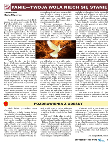 PANIE—TWOJA WOLA NIECH SIĘ STANIE świadectwo Beata Filipowicz Doskonale pamiętam dzień, kiedy zaczęło się moje nawrócenie. To było 8 grudnia 2008 roku –w Godzinie Łaski. Był to jeden z najtrudniejszych okresów w moim życiu. Straciłam pracę, a przy okazji grunt pod nogami i poczucie bezpieczeństwa. Ale właśnie wtedy dowiedziałam się o Godzinie Łaski i dzięki temu, że nie pracowałam, mogłam tego dnia pójść do kościoła. Sama nie wiem czego oczekiwałam, ale to nabożeństwo zmieniło całe moje życie. Wtedy pierwszy raz tak naprawdę wsłuchałam się w słowa wypowiadane przez kapłana i … przeżyłam prawdziwy zachwyt. Byłam bardzo letnią katoliczką, ale tego dnia zakochałam się w Kościele. Dotąd bywałam na mszy kilka razy w roku, teraz pragnęłam tego coraz częściej. Powrót do wiary nie jest jednak łatwy. Wiele razy przeżywałam bardzo trudne chwile; różnego rodzaju cierpienia, zniechęcenia, lęki, smutki. Chociaż tego nie wiedziałam, bardzo potrzebowałam wspólnoty. Pan Jezus jednak wie, co dla nas dobre i prowadzi nas swoimi ścieżkami. Mnie zaprowadził do Odnowy w Duchu Świętym „Miłosierdzie Boże” u Braci Mniejszych Kapucynów. Ta wspólnota jest dla mnie prawdziwym wsparciem już od 1,5 roku. Z niedowierzaniem coraz częściej odkrywałam obecność Pana Boga przy mnie. Kiedy pierwszy raz zobaczyłam „Spoczynek w Duchu Świętym” – przeraziłam się utraty kontroli nad ciałem. Gdy jednak po raz pierwszy doświadczyłam dotknięcia Ducha Świętego, ogarnęło mnie cudowne uczucie, którego dotąd nie znałam, a potem poczucie wielkiego szczęścia. I to przeżycie warte było wszystkich wcześniejszych trudów i prób, przez które musiałam przechodzić. Pierwsze poruszenie Duchem Świętym przeżyłam jednak w naszym kościele podczas adoracji grupy „Odważni z Duchem”. Kiedy popłynęły mi łzy, nie wiedziałam, co się ze mną dzieje – dziś rozumiem jak cudowny jest Dar Łez, jak oczyszcza człowieka – jest łaską. Takie porusze- nia widziałam potem u wielu osób – kobiet i mężczyzn. Niezapomnianym przeżyciem była dla mnie adoracja młodzieży w duchu Taize. Dziś bardzo brakuje mi tych adoracji, bo one naprawdę potrafiły otworzyć moje serce na działanie Pana Boga. Każdy z nas ma swoją niepowtarzalną drogę. Ciągle jeszcze zadziwia mnie sposób, w jaki Pan Bóg prowadzi mnie do siebie. Często zastanawiałam się, czego Bóg oczekuje ode mnie? Ewangelizacji? – przecież ja nie potrafię. Jestem chyba ostatnią osobą, która mogłaby ewangelizować. Sama od niedawna chodzę do kościoła. Kiedy jednak widzę, jak moi znajomi, którzy podśmiewali się z mojej przemiany, sami zaczynają się zmieniać, zaczynają pościć w piątki, zaglądać do kościoła, kiedy koleżanki oglądając mój różaniec na palcu mówią – też sobie taki kupię; a ktoś inny mówi mi, że mobilizuję go do wstawania na Roraty – cieszę się i myślę sobie - Panie Boże, Ty potrafisz wykorzystać każdą sytuację, przemówić przez każdego człowieka. Pamiętam, jak jeden z księży mówił na kazaniu, że Pan Bóg posyła do nas aniołów w osobach ludzi. To mogą być rodzice, nauczyciele, koleżanka, ksiądz. I ja oglądając się wstecz widzę tych aniołów, widzę, ile pracy włożyli w moją przemianę. Bardzo im za to dziękuję, za cierpliwość, wyrozumiałość, za to, że byli. Modlę się za nich, staram się ich wspierać duchowo i ich także proszę o modlitwę i wsparcie. Kiedy już napisałam to świadectwo, nagle zaczęłam mieć wątpliwości. Świadectwo to bardzo osobiste wyznanie. I kiedy już chciałam się wycofać, wzięłam do ręki stary numer gazetki „Apostoł Miłosierdzia Bożego” i pierwsze słowa, które przeczytałam były takie: „ nie dał nam Bóg ducha bojaźni, ale mocy i miłości i trzeźwego myślenia. Nie wstydź się zatem świadectwa Pana naszego, lecz weź udział w trudach i przeciwnościach znoszonych dla Ewangelii, według mocy Boga (2Tm 1,7-8). Bóg i świat oczekują od nas, że będziemy dawać świadectwo Ewangelii, dawać świadectwo prawdzie. To złych rzeczy trzeba się wstydzić, ze złymi rzeczami trzeba się ukrywać. Prawda o Bożej miłości nie jest do ukrywania, ale do stawiania jej na świeczniku”. Tak więc niech będzie tak, jak śpiewamy często w Odnowie w Duchu Świętym: Panie – Twoja wola niech się stanie. POZDROWIENIA Z ODESSY Niech będzie pochwalony Jezus Chrystus. Niedawno minęły Święta Bożego Narodzenia, które udało nam się przeżyć w uroczystej atmosferze kościoła katedralnego w Odessie. Wszystko rozpoczęło się bardzo po polsku - wspólną wieczerzą wigilijną w gronie sióstr, księży i kleryków. Później była Msza Święta Pasterska. Po raz pierwszy w historii była ona transmitowana przez miejscową telewizję. Można było oglądać tę transmisję w całym województwie odeskim, a do tego przez Internet na całym świecie. W czasie pasterki jeden z kleryków naszej die- cezji przyjął sutannę, co jest widomym znakiem jego drogi do kapłaństwa i daje nadzieję, że diecezja się będzie dalej rozwijać. Tuż przed Wigilią udało się zakończyć remont nowego mieszkania dla Księdza Biskupa Bronisława Bernackiego – Biskupa Odesko-Symferopolskiego. Do tej pory (11 lat) mieszkał w jednym pokoju nad zakrystią katedry; bez własnej toalety i łazienki. Było z tym remontem dużo problemów i chyba tylko cudem udało się wszystko zakończyć przed wieczerzą wigilijną tak, że Ksiądz Biskup mógł przeżywać Święta już w lepszych warunkach. Większość ludzi w tym okresie poświątecznym trochę odpoczywa, u nas zaś praca wre. Trwają przygotowania do mających się odbyć 5 stycznia 2013 roku święceń biskupich J.E. ks. Bpa Jacka Pyla, OMI, nowego biskupa pomocniczego naszej diecezji. A przygotowań jest dużo i to nie tylko liturgicznych. Jak dożyjemy do 5 stycznia, t