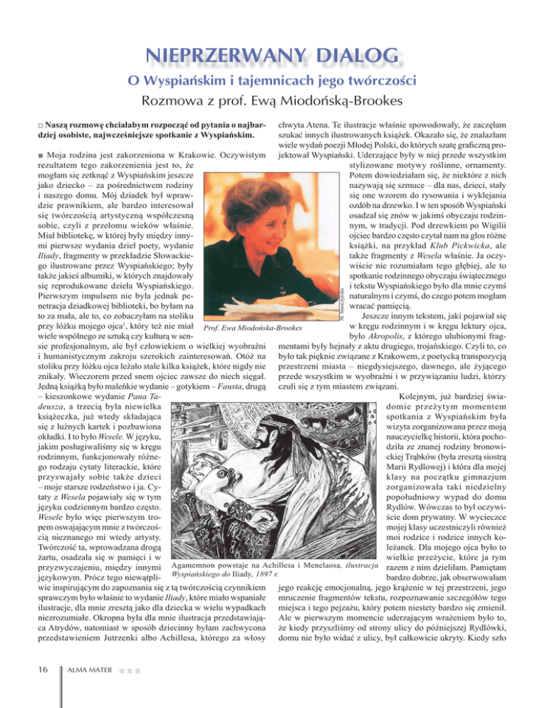 NIEPRZERWANY DIALOG O Wyspiańskim i tajemnicach jego twórczości Rozmowa z prof. Ewą Miodońską-Brookes chwyta Atena. Te ilustracje właśnie spowodowały, że zaczęłam szukać innych ilustrowanych książek. Okazało się, że znalazłam wiele wydań poezji Młodej Polski, do których szatę graficzną pro■ Moja rodzina jest zakorzeniona w Krakowie. Oczywistym jektował Wyspiański. Uderzające były w niej przede wszystkim rezultatem tego zakorzenienia jest to, że stylizowane motywy roślinne, ornamenty. mogłam się zetknąć z Wyspiańskim jeszcze Potem dowiedziałam się, że niektóre z nich jako dziecko – za pośrednictwem rodziny nazywają się szmuce – dla nas, dzieci, stały i naszego domu. Mój dziadek był wprawsię one wzorem do rysowania i wyklejania dzie prawnikiem, ale bardzo interesował ozdób na drzewko. I w ten sposób Wyspiański się twórczością artystyczną współczesną osadzał się znów w jakimś obyczaju rodzinsobie, czyli z przełomu wieków właśnie. nym, w tradycji. Pod drzewkiem po Wigilii Miał bibliotekę, w której były między innyojciec bardzo często czytał nam na głos różne mi pierwsze wydania dzieł poety, wydanie książki, na przykład Klub Pickwicka, ale Iliady, fragmenty w przekładzie Słowackietakże fragmenty z Wesela właśnie. Ja oczygo ilustrowane przez Wyspiańskiego; były wiście nie rozumiałam tego głębiej, ale to także jakieś albumiki, w których znajdowały spotkanie rodzinnego obyczaju świątecznego się reprodukowane dzieła Wyspiańskiego. i tekstu Wyspiańskiego było dla mnie czymś Pierwszym impulsem nie była jednak penaturalnym i czymś, do czego potem mogłam netracja dziadkowej biblioteki, bo byłam na wracać pamięcią. to za mała, ale to, co zobaczyłam na stoliku Jeszcze innym tekstem, jaki pojawiał się przy łóżku mojego ojca1, który też nie miał Prof. Ewa Miodońska-Brookes w kręgu rodzinnym i w kręgu lektury ojca, wiele wspólnego ze sztuką czy kulturą w senbyło Akropolis, z którego ulubionymi fragsie profesjonalnym, ale był człowiekiem o wielkiej wyobraźni mentami były hejnały z aktu drugiego, trojańskiego. Czyli to, co i humanistycznym zakroju szerokich zainteresowań. Otóż na było tak pięknie związane z Krakowem, z poetycką transpozycją stoliku przy łóżku ojca leżało stale kilka książek, które nigdy nie przestrzeni miasta – niegdysiejszego, dawnego, ale żyjącego znikały. Wieczorem przed snem ojciec zawsze do niech sięgał. przede wszystkim w wyobraźni i w przywiązaniu ludzi, którzy Jedną książką było maleńkie wydanie – gotykiem – Fausta, drugą czuli się z tym miastem związani. – kieszonkowe wydanie Pana TaKolejnym, już bardziej świadeusza, a trzecią była niewielka domie przeżytym momentem książeczka, już wtedy składająca spotkania z Wyspiańskim była się z luźnych kartek i pozbawiona wizyta zorganizowana przez moją okładki. I to było Wesele. W języku, nauczycielkę historii, która pochojakim posługiwaliśmy się w kręgu dziła ze znanej rodziny bronowirodzinnym, funkcjonowały różneckiej Trąbków (była zresztą siostrą go rodzaju cytaty literackie, które Marii Rydlowej) i która dla mojej przyswajały sobie także dzieci klasy na początku gimnazjum – moje starsze rodzeństwo i ja. Cyzorganizowała taki niedzielny taty z Wesela pojawiały się w tym popołudniowy wypad do domu języku codziennym bardzo często. Rydlów. Wówczas to był oczywiWesele było więc pierwszym troście dom prywatny. W wycieczce pem oswajającym mnie z twórczośmojej klasy uczestniczyli również cią nieznanego mi wtedy artysty. moi rodzice i rodzice innych koTwórczość ta, wprowadzana drogą leżanek. Dla mojego ojca było to żartu, osadzała się w pamięci i w wielkie przeżycie, które ja tym przyzwyczajeniu, między innymi Agamemnon powstaje na Achillesa i Menelaosa, ilustracja razem z nim dzieliłam. Pamiętam językowym. Prócz tego niewątpli- Wyspiańskiego do Iliady, 1897 r. bardzo dobrze, jak obserwowałam wie inspirującym do zapoznania się z tą twórczością czynnikiem jego reakcję emocjonalną, jego krążenie w tej przestrzeni, jego sprawczym było właśnie to wydanie Iliady, które miało wspaniałe mruczenie fragmentów tekstu, rozpoznawanie szczegółów tego ilustracje, dla mnie zresztą jako dla dziecka w wielu wypadkach miejsca i tego pejzażu, który potem niestety bardzo się zmienił. niezrozumiałe. Okropna była dla mnie ilustracja przedstawiają- Ale w pierwszym momencie uderzającym wrażeniem było to, ca Atrydów, natomiast w sposób dziecinny byłam zachwycona że kiedy przyszliśmy od strony ulicy do późniejszej Rydlówki, przedstawieniem Jutrzenki albo Achillesa, którego za włosy domu nie było widać z ulicy, był całkowicie ukryty. Kiedy szło M. Smoczyńska □ Naszą rozmowę chciałabym rozpocząć od pytania o najbardziej osobiste, najwcześniejsze spotkanie z Wyspiańskim. 16 ALMA MATER się ścieżką, wyboistą, troszkę pod górę, ponad chodnikiem, ten □ Wyspiański nie tylko fascynuje, także niepokoi. Jest dom nagle wyłaniał się z drzew. Było piękne późne wrześniowe w nim coś, co nie pozwala oderwać się od pewnych tematów, popołudnie. Niesamowite kolory, szczególny rodzaj światła, ja- motywów, wątków. Chciałabym zapytać o takie najgłębsze kieś maleńkie mgiełki, dymy, które dochodziły z pobliskich pól, tajemnice Wyspiańskiego, które pomału odsłaniały się Pani bo wtedy tam były jeszcze pola, i pojawiający się nagle w tym już w trakcie samodzielnych studiów nad jego twórczością, otoczeniu niewielki dom, troszkę jakby wkopany w ten teren, od nie w czasie dziecięcych spotkań, ale w latach trochę późrazu wprawił nas w zupełnie wyjątkowy nastrój. Zwiedzaliśmy niejszych. ten dom, rozmawialiśmy z mieszkańcami i z naszą nauczycielką, która potem poprowadziła nas ■ Myślę, że był to proces długi, polną dro