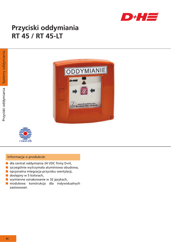 Przyciski oddymiania Systemy oddymiania Przyciski oddymiania RT 45 / RT 45-LT Informacja o produkcie: N N N N N N 34 dla central oddymiania 24 VDC firmy D+H, szczególnie wytrzymała aluminiowa obudowa, opcjonalna integracja przycisku wentylacji, dostępny w 5 kolorach, wymienne oznakowanie w 32 językach, modułowa konstrukcja dla indywidualnych zastosowań. Wybór produktów: Systemy oddymiania wymiary (S×W×G: 129×138×39 mm) RT BE45-ST RT GEH02-LT-ALU RT BE45-1 RT BE45-1-LT RT LT45 Przyciski oddymiania RT GEH02-ALU Standardowy kolor: pomarańczowy = RAL 2011* Na indywidualne zamówienie dostępne kolory: szary = RAL 7035* czerwony = RAL 3000 niebieski = RAL 5009 żółty = RAL 1004 Parametry: – atest wg EN 12101-9 i VdS 2592 (tylko RT 45 i obudowa z RT BE45-1-LT), – dostępny w wykonaniu standardowym lub jako indywidualne zestawienie obudowy i panela obsługi, – zamykana obudowa wykonana z odlewu aluminiowego z wybijaną szybką, kluczem i etykietami opisowymi w 32 językach. * kolor zgodny z Rozporządzeniem Ministra Spraw Wewnętrznych i Administracji z 7 czerwca 2010 w sprawie wykazu wyrobów służących zapewnieniu bezpieczeństwa publicznego. Typ Nr art. Waga [kg] Uwagi RT 45 30.438.25 0,31 kompletny panel obsługi - kolor pomarańczowy RT 45-LT 30.438.30 0,31 kompletny przycisk oddym. z LT - pomarańczowy – przycisk z sygnalizatorem akustycznym (70 dB, 400 Hz) - kolor pomarańczowy RT 45-ST ALU Pl.000.50 Funkcje: – otwarcie-zamknięcie (przycisk zamknięcia osłonięty obudową), – informacja o stanie pracy (alarmu, uszkodzenia systemu), – RT 45-ST z dodatkową akustyczną sygnalizacją zadziałania i uszkodzenia, – przycisk ze zintegrowanymi klawiszami do przewietrzania (opcja-LT). 35
