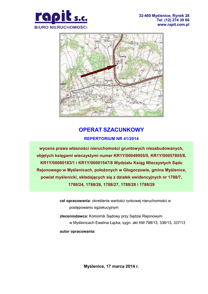 32-400 Myślenice, Rynek 28 Tel. (12) 274 30 60 www.rapit.com.pl OPERAT SZACUNKOWY REPERTORIUM NR 41/2014 wycena prawa własności nieruchomości gruntowych niezabudowanych, objętych księgami wieczystymi numer KR1Y/00049955/5, KR1Y/00057805/8, KR1Y/00080183/1 i KR1Y/00081547/8 Wydziału Ksiąg Wieczystych Sądu Rejonowego w Myślenicach, położonych w Głogoczowie, gmina Myślenice, powiat myślenicki, składających się z działek ewidencyjnych nr 1788/7, 1788/24, 1788/26, 1788/27, 1788/28 i 1788/29 cel opracowania: określenie wartości rynkowej nieruchomości w postępowaniu egzekucyjnym zleceniodawca: Komornik Sądowy przy Sądzie Rejonowym w Myślenicach Ewelina Łącka, sygn. akt KM 798/13, 336/13, 337/13 autor opracowania: Myślenice, 17 marca 2014 r. Wycena nieruchomości gruntowych – działki ewidencyjne nr 1788/7, 1788/24, 1788/26, 1788/27, 1788/28 i 1788/29, Głogoczów gm. Myślenice WYCIĄG Z OPERATU SZACUNKOWEGO Rep. nr 41/2014 Opis nieruchomości: Nieruchomości gruntowe niezabudowane, będące przedmiotem wyceny, stanowią działki ewidencyjne nr 1788/7, 1788/24, 1788/26, 1788/27, 1788/28 i 1788/29 o łącznej powierzchni 0,3327 ha, położone w Głogoczowie, gmina Myślenice, powiat myślenicki, województwo małopolskie. Dane z ewidencji gruntów i ksiąg wieczystych: - Jednostka ewidencyjna: - Obręb: - Numer arkusza mapy: - Numery ewidencyjne działek: - Numery ksiąg wieczystych: Myślenice - Gmina [120903_5] Głogoczów [Nr 0005] 16 1788/7, 1788/24, 1788/26, 1788/27, 1788/28 i 1788/29 KR1Y/00049955/5, KR1Y/00057805/8, KR1Y/00080183/1, KR1Y/00081547/8 Cel wyceny: Celem sporządzenia operatu szacunkowego jest opis i oszacowanie wartości rynkowej nieruchomości w postępowaniu egzekucyjnym. Określono wartość rynkową nieruchomości dla najbardziej prawdopodobnego sposobu użytkowania, zgodnego z przeznaczeniem wyznaczonym w miejscowym planie zagospodarowania przestrzennego. Metoda wyceny: podejście porównawcze, metoda korygowania ceny średniej Wartość rynkowa nieruchomości 355 000 zł Słownie: trzysta pięćdziesiąt pięć tysięcy złotych Data sporządzenia operatu szacunkowego: 17 marca 2014 r. Autor operatu szacunkowego: Biuro Nieruchomości „RAPIT” s.c., Myślenice marzec 2014 r. 2/25 Wycena nieruchomości gruntowych – działki ewidencyjne nr 1788/7, 1788/24, 1788/26, 1788/27, 1788/28 i 1788/29, Głogoczów gm. Myślenice SPIS TREŚCI WYCIĄG Z OPERATU SZACUNKOWEGO 2 1. CZĘŚĆ OGÓLNA OPRACOWANIA 4 1.1. 1.2. 1.3. 1.4. 4 4 4 5 Przedmiot i zakres wyceny Cel wyceny Podstawy opracowania operatu szacunkowego Daty związane z przygotowaniem operatu szacunkowego 2. CZĘŚĆ SZCZEGÓŁOWA OPRACOWANIA 6 2.1. Stan prawny nieruchomości 6 2.2. 2.3. 2.4. 2.5. 2.6. Przeznaczenie nieruchomości Opis nieruchomości Metodyka wyceny Analiza i charakterystyka rynku Określenie wartości nieruchomości 15 16 17 18 22 3. WYNIK KOŃCOWY WYCENY 24 4. KLAUZULE I ZASTRZEŻENIA 25 5. ZAŁĄCZNIKI DO OPERATU SZACUNKOWEGO 25 Biuro Nieruchomości „RAPIT” s.c., Myślenice marzec 2014 r. 3/25 Wycena nieruchomości gruntowych – działki ewidencyjne nr 1788/7, 1788/24, 1788/26, 1788/27, 1788/28 i 1788/29, Głogoczów gm. Myślenice 1. CZĘŚĆ OGÓLNA OPRACOWANIA 1.1. PRZEDMIOT I ZAKRES WYCENY Przedmiot wyceny Przedmiotem wyceny są nieruchomości gruntowe niezabudowane, składające się z działek ewidencyjnych nr 1788/7, 1788/24, 1788/26, 1788/27, 1788/28 i 1788/29 o łącznej powierzchni 0,3327 ha, położone w Głogoczowie, gmina Myślenice, powiat myślenicki, województwo małopolskie. Dane z ewidencji gruntów i ksiąg wieczystych: - Jednostka ewidencyjna: Obręb: Numer arkusza mapy: Numery ewidencyjne działek: Myślenice - Gmina [120903_5] Głogoczów [Nr 0005] 16 1788/7, 1788/24, 1788/26, 1788/27, 1788/28 i 1788/29 - Numery ksiąg wieczystych: KR1Y/00049955/5, KR1Y/00057805/8, KR1Y/00080183/1, KR1Y/00081547/8 Zakres wyceny Zakres wyceny obejmuje określenie wartości rynkowej prawa własności nieruchomości gruntowych niezabudowanych, którą stanowią działki ewidencyjne nr 1788/7 o powierzchni 0,07 ha, nr 1788/24 o powierzchni 0,0138 ha, nr 1788/26 o powierzchni 0,0013 ha, nr 1788/27 o powierzchni 0,0192 ha, nr 1788/28 o powierzchni 0,2133 ha, nr 1788/29 o powierzchni 0,0151 ha, położone w Głogoczowie, gmina Myślenice, według stanu aktualnego. 1.2. CEL WYCENY Celem sporządzenia operatu szacunkowego jest opis i oszacowanie wartości rynkowej nieruchomości w postępowaniu egzekucyjnym. Określono wartość rynkową nieruchomości dla najbardziej prawdopodobnego sposobu użytkowania, zgodnego z przeznaczeniem wyznaczonym w miejscowym planie zagospodarowania przestrzennego. 1.3. PODSTAWY OPRACOWANIA OPERATU SZACUNKOWEGO Podstawa formalna Podstawę formalną opracowania niniejszego operatu szacunkowego stanowi zlecenie wykonania opisu i oszacowania nieruchomości – postanowienie Komornika Sądowego przy Sądzie Rejonowym w Myślenicach Eweliny Łąckiej w postępowaniu egzekucyjnym z nieruchomości z dnia 13 listopada 2013 r., sygn. akt KM 798/13, 336/13, 337/13. Biuro Nieruchomości „RAPIT” s.c., Myślenice marzec 2014 r. 4/25 Wycena nieruchomości gruntowych – działki ewidencyjne nr 1788/7, 1788/24, 1788/26, 1788/27, 1788/28 i 1788/29, Głogoczów gm. Myślenice Podstawy prawne i merytoryczne - USTAWA z dnia 21 sierpnia 1997 r. o gospodarce nieruchomościami - - (Dz. U. nr 102, poz. 651 z 2010 r. wraz z późniejszymi zmianami), USTAWA z dnia 23 kwietnia 1964 r. Kodeks Cywilny (Dz. U. Nr 16 poz. 93 wraz z późniejszymi zmianami), USTAWA z dnia 17 listopada 1964 r. Kodeks Postępowania Cywilnego (Dz. U. Nr 43 poz. 296 wraz z późniejszymi zmianami), ROZPORZĄDZENIE RADY MINISTRÓW z dnia 21 września 2004 r. w sprawie wyceny nieruchomości i sporządzania operatu szacunkowego (Dz. U. nr 207 poz. 2109 wraz z późniejszymi zmianami), ROZPORZĄDZENIE MINISTRA SPRAWIEDLIWOŚCI z dnia 9 marca 1968 r. w sprawie czynności komorników (Dz. U