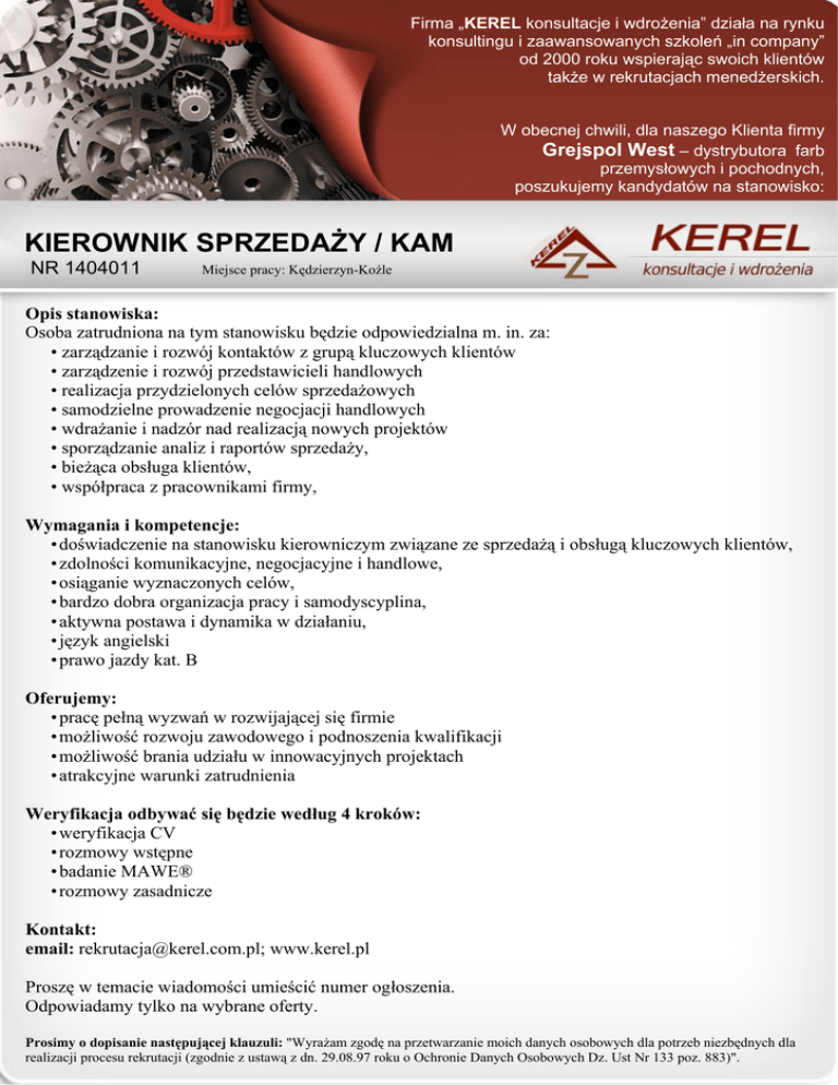 Firma „KEREL konsultacje i wdrożenia” działa na rynku konsultingu i zaawansowanych szkoleń „in company” od 2000 roku wspierając swoich klientów także w rekrutacjach menedżerskich. W obecnej chwili, dla naszego Klienta firmy Grejspol West – dystrybutora farb przemysłowych i pochodnych, poszukujemy kandydatów na stanowisko: KIEROWNIK SPRZEDAŻY / KAM NR 1404011 Miejsce pracy: Kędzierzyn-Koźle Opis stanowiska: Osoba zatrudniona na tym stanowisku będzie odpowiedzialna m. in. za: • zarządzanie i rozwój kontaktów z grupą kluczowych klientów • zarządzenie i rozwój przedstawicieli handlowych • realizacja przydzielonych celów sprzedażowych • samodzielne prowadzenie negocjacji handlowych • wdrażanie i nadzór nad realizacją nowych projektów • sporządzanie analiz i raportów sprzedaży, • bieżąca obsługa klientów, • współpraca z pracownikami firmy, Wymagania i kompetencje: • doświadczenie na stanowisku kierowniczym związane ze sprzedażą i obsługą kluczowych klientów, • zdolności komunikacyjne, negocjacyjne i handlowe, • osiąganie wyznaczonych celów, • bardzo dobra organizacja pracy i samodyscyplina, • aktywna postawa i dynamika w działaniu, • język angielski • prawo jazdy kat. B Oferujemy: • pracę pełną wyzwań w rozwijającej się firmie • możliwość rozwoju zawodowego i podnoszenia kwalifikacji • możliwość brania udziału w innowacyjnych projektach • atrakcyjne warunki zatrudnienia Weryfikacja odbywać się będzie według 4 kroków: • weryfikacja CV • rozmowy wstępne • badanie MAWE® • rozmowy zasadnicze Kontakt: email: [email protected]; www.kerel.pl Proszę w temacie wiadomości umieścić numer ogłoszenia. Odpowiadamy tylko na wybrane oferty. Prosimy o dopisanie następującej klauzuli: "Wyrażam zgodę na przetwarzanie moich danych osobowych dla potrzeb niezbędnych dla realizacji procesu rekrutacji (zgodnie z ustawą z dn. 29.08.97 roku o Ochronie Danych Osobowych Dz. Ust Nr 133 poz. 883)".