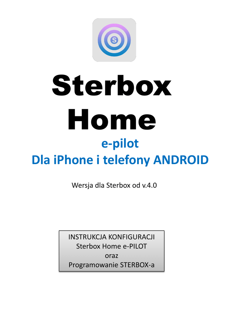 Sterbox Home e-pilot Dla iPhone i telefony ANDROID Wersja dla Sterbox od v.4.0 INSTRUKCJA KONFIGURACJI Sterbox Home e-PILOT oraz Programowanie STERBOX-a Sterbox Home e-Pilot Aplikacja współpracuje z uniwersalnym sterownikiem STERBOX. Nadaje się do sterowania oświetleniem, roletami, temperaturą, podlewaniem, bramami wjazdowymi, dowolnymi odbiornikami zarówno w domu jak i w biurze. To uniwersalna, konfigurowalna aplikacja przeznaczona dla telefonów z oprogramowaniem iOS i android ( od ver 5,0), która współpracuje ze Sterbox-em od ver.4.0.0 Aplikacja jest łatwa i intuicyjna w obsłudze oraz konfiguracji. Od tej pory sterowanie domem stanie się przyjemnością. Cechy: - Sześć dowolnie konfigurowanych ekranów - W każdym oknie można wybierać wygląd przycisku oraz dowolnie go konfigurować. - Każdy klawisz ekranowy może być dowolnie opisany, może posiadać własną ikonę. - Każdy klawisz może być indywidualnie skonfigurowany do konkretnego Sterboxa (konkretny adres IP - jeden z pięciu dostępnych), i można wpisać dowolną nazwę powiązania, które wykona komendę „zmiana” w dedykowanym urządzeniu. - Każdy ekran może być dowolnie opisany, może posiadać własne zdjęcie zrobione bezpośrednio z aparatu urządzenia lub pobrane z galerii. Aplikacja współpracuje ze sterownikami Sterbox seria WP. INSTALACJA I KONFIGURACJA Aby zainstalować aplikację na naszym urządzeniu Należy pobrać ją z : Następnie postępować wg. zasad instalacji dla danego urządzenia. Po zainstalowaniu Aplikacji pojawi się ikona. Sterbox Gdy klikniemy w ikonę rozpocznie się otwieranie programu z ekranem startowym. Sterbox Home Ekrany sterowania. Ekrany nawigacji i konfiguracji. Po wpisaniu parametrów do połączenia ze Sterbox-em przechodzimy do konfiguracji powiązań. Każdy klawisz można w Sterbox-ie powiązać z dowolnym wejściem/wyjściem czy obwodem cyfrowym. Klawisz wykonuje funkcje zmiana stanu. Przy każdym klawiszu znajduje się opis do jakiego obwodu będzie się odnosił dany klawisz ( czyli jakie powiązanie wpisać w wejście/wyjście czy obwód cyfrowy). Nazwę tę możemy zmienić w edycji klawisza Poniżej przykład konfiguracji w Sterbox bezpośrednio do obwodu wyjściowego portu cyfrowego. Należy pamiętać, iż obwód wysyłany przez e-pilot nie może być powiązany bezpośrednio z innym obwodem. Jeżeli chcemy danym obwodem sterować z innych wejść czy klawiszy ekranowych najlepiej obwód z e-pilot połączyć przez bramkę BUF zmieniając nazwę obwodu. Poniżej przykład. Jeżeli z klawisza e-pilota chcemy uzyskać impuls np. do sterowania przerzutnikiem T lub inną funkcją na wyjściu bramki BUF konfigurujemy impuls. Przykład poniżej. W przypadku standardowej konfiguracji dostrczanej fabrycznie jeżeli na wyjściu bramki BUF wpiszemy obwody sterujące przerzutnikami T od razu mamy skonfigurowane sterowanie. Poniżej przykład. itd. itd. itd.