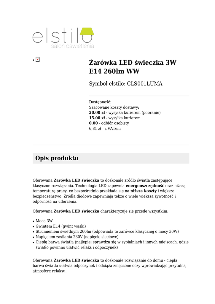 Żarówka LED świeczka 3W E14 260lm WW ● Symbol elstilo: CLS001LUMA Dostępność: Szacowane koszty dostawy: 20.00 zł - wysyłka kurierem (pobranie) 15.00 zł - wysyłka kurierem 0.00 - odbiór osobisty 6,81 zł z VATem Opis produktu Oferowana Żarówka LED świeczka to doskonałe źródło światła zastępujące klasyczne rozwiązania. Technologia LED zapewnia energooszczędność oraz niższą temperaturę pracy, co bezpośrednio przekłada się na niższe koszty i większe bezpieczeństwo. Źródła diodowe zapewniają tekże o wiele większą żywotność i odporność na uderzenia. Oferowana Żarówka LED świeczka charakteryzuje się przede wszystkim: ● ● ● ● ● Mocą 3W Gwintem E14 (gwint wąski) Strumieniem świetlnym 260lm (odpowiada to żarówce klasycznej o mocy 30W) Napięciem zasilania 230V (napięcie sieciowe) Ciepłą barwą światła (najlepiej sprawdza się w sypialniach i innych miejscach, gdzie światło powinno ułatwić relaks i odpoczynek) Oferowana Żarówka LED świeczka to doskonałe rozwiązanie do domu - ciepła barwa światła ułatwia odpoczynek i odciąża zmęczone oczy wprowadzając przytulną atmosferę relaksu. UWAGA! Do używania na dworze lub w pomieszczeniach o podwyższonej wilogotności konieczne są oprawy oświetleniowe o stopniu ochrony nie mniejszym niż IP44. Źródła LED nie są kompatybilne ze wszystkimi rodzajami ściemniaczy oświetleniowych, dlatego przy doborze ściemniacza warto zwrócić na to uwagę. W wrazie wątpliwości zachęcamy do zapoznania się z naszym poradnikiem dotyczącym doboru źródeł światła.Lumax LED przyszłościowe światła najbardziej ekologiczne, większa wydajność strumienia świetlnego, trwałość > 30 000 h, większa stabilność barwy światła, najmniej szkodliwe źródło światła Dane techniczne Odpowiednik żarówki o mocy [W]: 30 Strumień świetlny [lm]: 260 Trzonek: E14 Napięcie znamionowe [V]: 230 cri (ra): >80 Barwa światła [K]: 2000-3500 (ciepła) Żywotność [h]: 50000 Typ: Świeczka Strumień świetlny zakres [lm]: 251-500 Strumień świetlny dokładny [lm]: 260 Moc [W]: 3 LED: Tak
