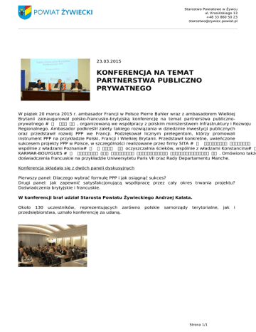 Starostwo Powiatowe w Żywcu ul. Krasińskiego 13 +48 33 860 50 23 [email protected] 23.03.2015 KONFERENCJA NA TEMAT PARTNERSTWA PUBLICZNO PRYWATNEGO W piątek 20 marca 2015 r. ambasador Francji w Polsce Pierre Buhler wraz z ambasadorem Wielkiej Brytanii zainaugurował polsko-francusko-brytyjską konferencję na temat partnerstwa publicznoprywatnego #℣佐⌡⌀倀倀倀⌡⍃倣℣, organizowaną we współpracy z polskim ministerstwem Infrastruktury i Rozwoju Regionalnego. Ambasador podkreślił zalety takiego rozwiązania w dziedzinie inwestycji publicznych oraz przedstawił rozwój PPP we Francji. Podziękował licznym prelegentom, którzy promowali instrument PPP na przykładzie Polski, Francji i Wielkiej Brytanii. Przedstawił konkretne, uwieńczone sukcesem projekty PPP w Polsce, w szczególności realizowane przez firmy SITA #℣佐⌡⌀猀瀀愀氀愀爀渀椀愀 漀搀瀀愀搀眀, wspólnie z władzami Poznania#℣䍐⌡⌀Ⰰ 匀䄀唀刀 ⌡⍏倣℣oczyszczalnia ścieków, wspólnie z władzami Konstancina#℣䍐 KARMAR-BOUYGUES #℣佐⌡⌀愀欀愀搀攀洀椀欀 搀氀愀 猀琀甀搀攀渀琀眀 唀渀椀眀攀爀猀礀琀攀琀甀 䨀愀最椀攀氀氀漁䐀猀欀椀攀最漀⌡⍃倣℣. Omówiono także doświadczenia francuskie na przykładzie Uniwersytetu Paris VII oraz Rady Departamentu Manche. Konferencja składała się z dwóch paneli dyskusyjnych Pierwszy panel: Dlaczego wybrać formułę PPP i jak osiągnąć sukces? Drugi panel: Jak zapewnić satysfakcjonującą współpracę przez cały okres trwania projektu? Doświadczenia brytyjskie i francuskie. W konferencji brał udział Starosta Powiatu Żywieckiego Andrzej Kalata. Około 130 uczestników, reprezentujących zarówno przedsiębiorstwa, uznało konferencję za udaną. polskie samorządy terytorialne, Strona 1/1 Powered by TCPDF (www.tcpdf.org) jak i