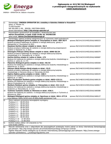Ogłoszenie nr 412/W/16/Białogard o przetargach nieograniczonych na wykonanie robót budowlanych ENERGA – OPERATOR SA. Oddział w Koszalinie 1) 2) 3) 1 2 3 4 5 6 7 8 9 10 11 4) 5) 6) Zamawiający: ENERGA-OPERATOR SA z siedzibą w Gdańsku Oddział w Koszalinie adres: ul. Morska 10, 75-950 Koszalin NIP 583-000-11-90; REGON: 190275904-00050 strona internetowa: http://bip.energa-operator.pl Pracownikiem uprawnionym do kontaktów z Wykonawcami jest: Adrian Żmudziński, w godz. 8:00-14:00, tel. 943483168 adres email: [email protected] Zamawiający ogłasza przetargi nieograniczone na wykonanie robót budowlanych: Białogard Białogard gmina miejska ul. Zwycięstwa nr dział.: 009-20/4 sprawa ZN/3141/5151MZI/2016/1600223 Budowa przyłącza kablowego do zasilania w energię elektryczną garaży w Białogardzie ul. Zwycięstwa dz.20/4. Daszewo Karlino obszar wiejski nr dział.: 36/2 sprawa ZN/3142/5151MZI/2016/1600447 Budowa przyłącza kablowego do zasilania w energię elektryczną przepompowni ścieków w Daszewie dz. nr 36/2. Dziwogóra Połczyn-Zdrój obszar wiejski nr dział.: 0090-56/34 sprawa ZN/3143/5151MZI/2016/1600379 Budowa przyłącza kablowego do zasilania w energie elektryczną budynku mieszkalnego w m. Dziwogóra dz. nr 56/34 Karlino Karlino miasto ul. Leśna nr dział.: 172 sprawa ZN/3144/5151MZI/2016/1600687 Budowa linii kablowej do zasilania w energie elektryczną budynku mieszkalnego w Karlinie ul. Leśna dz. nr 172. Pękanino Białogard gmina wiejska nr dział.: 56/23 sprawa ZN/3145/5151MZI/2016/1600260 Budowa linii kablowej do zasilania w energię elektryczna budynku mieszkalnego w Pękaninie dz. nr 56/23. Połczyn-Zdrój Połczyn-Zdrój miasto nr dział.: 23/5 sprawa ZN/3146/5151MZI/2016/1600515 Budowa przyłącza kablowego do zasilania w energię elektryczną budynku mieszkalnego w Połczynie zdroju ul. Połczyńska dz.23/5. Rąbino Rąbino gmina wiejska nr dział.: 168/1 sprawa ZN/3147/5151MZI/2016/1600229 Budowa linii kablowej do zasilania w energie elektryczną budynku mieszkalnego w Rąbinie dz. nr 168/1. Stary Przybysław Świdwin gmina wiejska nr dział.: 0033-123/11 sprawa ZN/3148/5151MZI/2016/1600135 Budowa linii kablowej do zasilania w energie elektryczną budynku mieszkalnego w Starym Przybysławiu dz. nr 123/11. Świdwin Świdwin gmina miejska ul. Połczyńska nr dział.: 011-11/5 sprawa ZN/3149/5151MZI/2016/1600817 Budowa linii kablowej do zasilania w energię elektryczną budynku mieszkalnego w Świdwinie ul. Połczyńska dz. nr 11/5. Tychowo Tychowo miasto ul. Klonowa nr dział.: 636/1 sprawa ZN/3150/5151MZI/2016/1600380 Budowa linii kablowej do zasilania w energię elektryczną budynku w Tychowie ul. Klonowa dz. 636/1. Białogard Białogard gmina miejska ul. Sportowa nr dział.: 0011-277/6 sprawa ZN/3151/5151MZI/2016/1600127 Linia kablowa YAKXs 4x120 mm2 dł.409m,Szafki pomiarowe 5 szt. Okres realizacji zamówienia bezwzględnie wymagany: Przetarg nr 1 - 08-09-2016 Przetarg nr 2 - 08-09-2016 Przetarg nr 3 - 08-09-2016 Przetarg nr 4 - 08-09-2016 Przetarg nr 5 - 31-08-2016 Przetarg nr 6 - 31-08-2016 Przetarg nr 7 - 08-09-2016 Przetarg nr 8 - 08-09-2016 Przetarg nr 9 - 08-09-2016 Przetarg nr 10 - 31-08-2016 Przetarg nr 11 - 31-08-2016 Kryteria wyboru oferty i ich znaczenie (w %): Cena brutto [100%] Warunki Zamówienia wraz z załącznikami dla poszczególnych przetargów można pobrać ze strony internetowej Zamawiającego pod adresem: http://bip.energa-operator.pl/centrala/lokalne/przetargi.xml?group=centrala Ogólne Warunki Umów dostępne są na stronie internetowej Zamawiającego pod adresem: http://www.energaoperator.pl/dostawcy_i_przetargi/regulaminy.xml Ogłoszenie nr 412/W/16/Białogard o przetargach nieograniczonych na wykonanie robót budowlanych ENERGA – OPERATOR SA. Oddział w Koszalinie 7) 8) 9) 10) 11) Do przetargu mogą przystąpić Wykonawcy zakwalifikowani do prac na rzecz ENERGA - OPERATOR SA i znajdujący się w Rejestrze Kwalifikowanych Wykonawców oraz spełniają pozostałe wymagania określone w WZ. Wniosek o umieszczenie w RKW wraz z Procedurą można pobrać ze strony: http://www.energa-operator.pl/dostawcy_i_przetargi/regulaminy.xml Miejsce i termin składania ofert: siedziba Zamawiającego, Biuro podawcze, pok. 100 parter, siedziba Oddziału Koszalin do 26-07-2016 godz. 08:00 Miejsce i termin publicznego otwarcia ofert: siedziba Zamawiającego, pok. 105 parter, siedziba Oddziału Koszalin data 2607-2016 godz. 10:00 Termin związania z ofertą: 90 dni od daty upływu terminu składania ofert. Postępowanie o udzielenie zamówienia prowadzone jest w trybie przetargu nieograniczonego, z zachowaniem zasad określonych: ustawą z dnia 23 kwietnia 1964r. Kodeks cywilny (Dz. U. z 1964 r. Nr 16, poz. 93 z późn. zmianami) oraz Regulaminem udzielania zamówień w Energa-Operator SA. Sporządził(a): Adrian Żmudziński Koszalin, 11-07-2016 r.