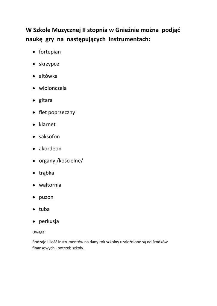 W Szkole Muzycznej II stopnia w Gnieźnie można podjąć naukę gry na następujących instrumentach: fortepian skrzypce altówka wiolonczela gitara flet poprzeczny klarnet saksofon akordeon organy /kościelne/ trąbka waltornia puzon tuba perkusja Uwaga: Rodzaje i ilość instrumentów na dany rok szkolny uzależnione są od środków finansowych i potrzeb szkoły.