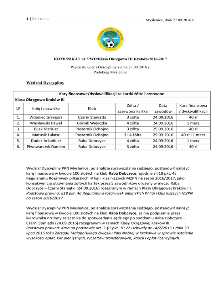 1|Strona Myślenice, dnia 27.09.2016 r. KOMUNIKAT nr 5/WD/Klasa Okręgowa III Kraków/2016-2017 Wydziału Gier i Dyscypliny z dnia 27.09.2016 r. Podokręg Myślenice Wydział Dyscypliny Kary finansowe/dyskwalifikacji za kartki żółte i czerwone Klasa Okręgowa Kraków III Żółta / Data LP Imię i nazwisko Klub czerwona kartka zawodów 1. Wdaniec Grzegorz Czarni Staniątki 3 żółta 24.09.2016 2. Wasilewski Paweł Górnik Wieliczka 4 żółta 24.09.2016 3. Bijak Mariusz Pasternik Ochojno 3 żółta 25.09.2016 4. Matusik Łukasz Pasternik Ochojno 3 i 4 żółta 25.09.2016 5. Dudek Arkadiusz Raba Dobczyce 4 żółta 24.09.2016 6. Piwowarczyk Damian Raba Dobczyce 3 żółta 24.09.2016 Kara finansowa / dyskwalifikacji 40 zł 1 mecz 40 zł 40 zł i 1 mecz 1 mecz 40 zł Wydział Dyscypliny PPN Myślenice, po analizie sprawozdania sędziego, postanowił nałożyć karę finansową w kwocie 100 złotych na klub Raba Dobczyce, zgodnie z §18 pkt. 4a Regulaminu Rozgrywek piłkarskich IV ligi i klas niższych MZPN na sezon 2016/2017, jako konsekwencję otrzymania żółtych kartek przez 5 zawodników drużyny w meczu Raba Dobczyce – Czarni Staniątki (24.09.2016) rozegranym w ramach Klasy Okręgowej Kraków III. Podstawa prawna: §18 pkt. 4a Regulaminu rozgrywek piłkarskich IV ligi i klas niższych MZPN na sezon 2016/2017 Wydział Dyscypliny PPN Myślenice, po analizie sprawozdania sędziego, postanowił nałożyć karę finansową w kwocie 100 złotych na klub Raba Dobczyce, za nie podpisanie przez kierownika drużyny załącznika do sprawozdania sędziego po spotkaniu Raba Dobczyce – Czarni Staniątki (24.09.2016) rozegranym w ramach Klasy Okręgowej Kraków III. Podstawa prawna: Kara na podstawie art. 2 §1 pkt. 10.22 Uchwały nr 14/Z/2015 z dnia 23 lipca 2015 roku Zarządu Małopolskiego Związku Piłki Nożnej w Krakowie w sprawie ustalenia wysokości opłat, kar pieniężnych, ryczałtów transferowych, kaucji i opłat licencyjnych. 2|Strona Wydział Dyscypliny PPN Myślenice, po analizie sprawozdania sędziego, postanowił nałożyć karę dyskwalifikacji w wymiarze 2 meczów na trenera Piotra Żuka (Raba Dobczyce), za zachowanie wobec sędziego po spotkaniu Raba Dobczyce – Czarni Staniątki (24.09.2016) rozegranym w ramach Klasy Okręgowej Kraków III. Podstawa prawna: Kara na podstawie art. 61 §1 pkt. Regulaminu Dyscyplinarnego PZPN Od powyższych decyzji przysługuje prawo odwołania do Związkowej Komisji Odwoławczej przy MZPN w terminie 14 dni od otrzymania powiadomienia i wpłacenie kaucji. Nieopłacony protest nie będzie rozpatrywany. Odwołanie należy złożyć poprzez Komisję Gier Podokręgu Myślenice.