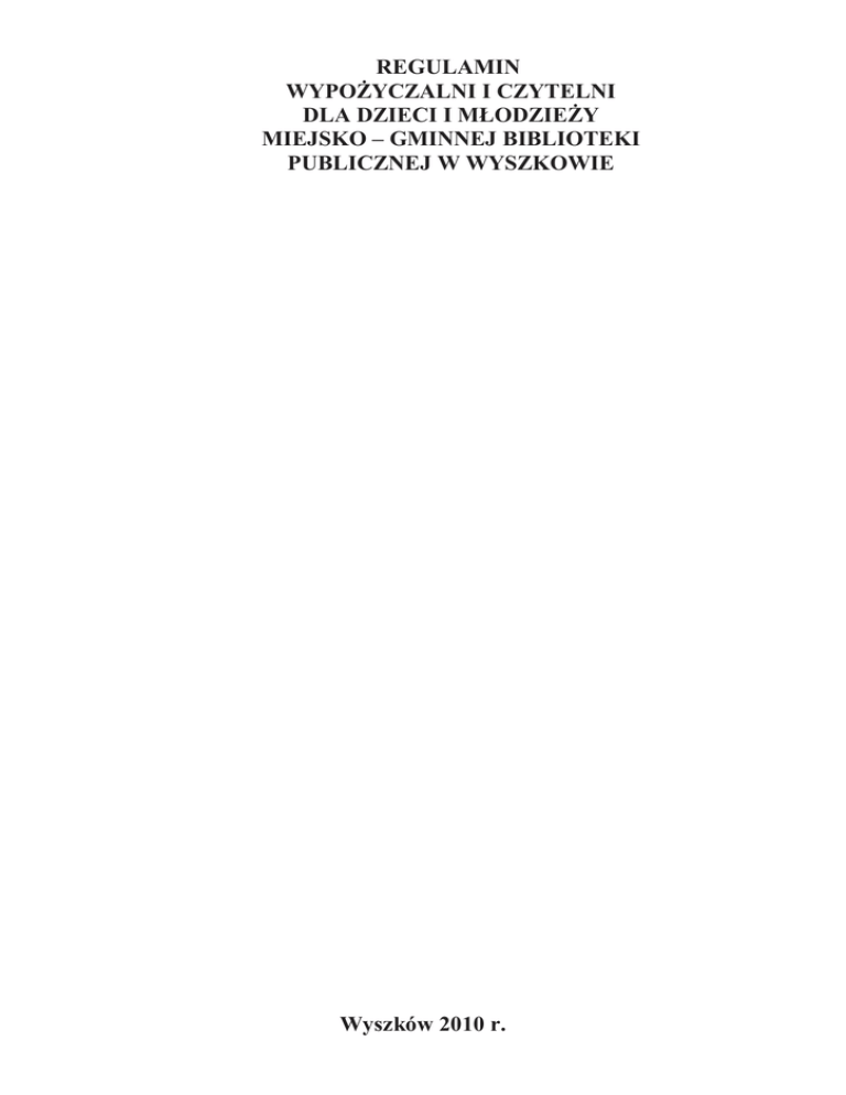 REGULAMIN WYPOŻYCZALNI I CZYTELNI DLA DZIECI I MŁODZIEŻY MIEJSKO – GMINNEJ BIBLIOTEKI PUBLICZNEJ W WYSZKOWIE Wyszków 2010 r. I. POSTANOWIENIA OGÓLNE 1. Prawo do korzystania z Wypożyczalni i Czytelni dla Dzieci i Młodzieży mają stali mieszkańcy powiatu wyszkowskiego. 2. Przy zapisie do Wypożyczalni zgłaszający się jest zobowiązany: a) okazać dokument tożsamości stwierdzający miejsce stałego zamieszkania, b) wypełnić kartę zapisu i zobowiązać się podpisem do przestrzegania Regulaminu. Karta zapisu dziecka musi być własnoręcznie poręczona podpisem rodziców lub prawnych opiekunów, którzy zobowiązują się do odpowiedzialności za wypożyczone książki. 3. Ze zbiorów Czytelni można korzystać po zapoznaniu się z Regulaminem i przedłożeniu dokumentu tożsamości na czas pobytu. 4. Czytelnik jest zobowiązany do informowania bibliotekarza o każdej zmianie adresu stałego zamieszkania. 5. Czytelnik jest zobowiązany szanować wypożyczone książki, będące własnością społeczną oraz chronić je przed zniszczeniem i zagubieniem. II. ZASADY WYPOŻYCZANIA I UDOSTĘPNIANIA KSIĄŻEK 1. Czytelnik sam wybiera książki w Wypożyczalni. 2. Ze zbiorów Czytelni można korzystać tylko na miejscu – zbiory udostępnia bibliotekarz. 3. Na kopiowanie wybranych fragmentów ze zbiorów Czytelni Czytelnik jest zobowiązany uzyskać zgodę bibliotekarza. 4. Dyżurujący bibliotekarz udziela informacji o książkach, pomaga w doborze literatury oraz w korzystaniu z katalogów i wydawnictw informacyjnych. 5. Czytelnik ma prawo wypożyczyć do 5 książek na okres nie dłuższy niż jeden miesiąc. 6. Termin zwrotu książki może być przedłużony tylko w przypadku, gdy nie ma na nią zapotrzebowania ze strony innych Czytelników. 7. Bibliotekarz może prosić o zwrot książek przed terminem ustalonym w Rozdz. II pkt 5, jeżeli stanowią one szczególnie poszukiwane pozycje. 8. Bibliotekarz może, na prośbę Czytelnika, zarezerwować książkę aktualnie wypożyczoną przez innego Czytelnika. 9. W przypadku braku książki, Czytelnik może otrzymać informację, w której z najbliższych bibliotek znajduje się poszukiwana przez niego pozycja. Na prośbę Czytelnika bibliotekarz sprowadza książki z innych bibliotek w ramach wypożyczeń międzybibliotecznych na koszt Czytelnika. 10. Przy wypożyczaniu szczególnie cennych i atrakcyjnych zbiorów Czytelnik ma obowiązek wypełnić rewers. 11. Czytelnik przy zwrocie i wypożyczeniu książek podaje bibliotekarzowi swój numer biblioteczny lub dane osobowe. 12. Dyżurujący bibliotekarz rejestruje książki wybrane przez Czytelnika. 13. Czytelnikom chorym i niepełnosprawnym książki mogą być dostarczane do domu. 14. Wypożyczenie jest zapisywane w systemie komputerowym. Przed wyjściem z Wypożyczalni należy sprawdzić stan swojego konta, a ewentualne zastrzeżenia zgłosić bibliotekarzowi. 15. Zarejestrowanie wypożyczenia w systemie komputerowym stanowi dowód wypożyczenia książki – reklamacje zgłoszone po wyjściu z Wypożyczalni nie będą przyjmowane. 16. Dowodem zwrotu książki jest komputerowe zarejestrowanie tej czynności, dokonane w Wypożyczalni. 17. Przed wypożyczeniem książki Czytelnik powinien sprawdzić jej stan i zgłosić ewentualne uwagi bibliotekarzowi. W przeciwnym razie przyjmuje się, że książka nie była zniszczona. 18. W przypadku zagubienia lub zniszczenia książki Czytelnik ma obowiązek kupić taką samą książkę. Jeśli nie jest to możliwe, po uzgodnieniu z bibliotekarzem może kupić inną, potrzebną Wypożyczalni książkę albo zapłacić ekwiwalent (zał.). III. OPŁATY 1. Zbiory biblioteczne wypożyczane są bezpłatnie. 2. Opłaty są pobierane: a) od Czytelników nie spełniających warunków zawartych w Rozdz. I pkt 1 w formie kaucji wpisowej od każdego wypożyczonego woluminu w wysokości odpowiadającej aktualnej średniej cenie zakupu 1 woluminu (zał.). Kaucja podlega zwrotowi po świadczeniu Czytelnika o rezygnacji z usług Wypożyczalni. Nieodebrana kaucja, po upływie roku od dnia zaprzestania korzystania z Wypożyczalni, stanie wpłacona na rzecz Biblioteki, z przeznaczeniem na uzupełnienie księgozbioru; b) tytułem odszkodowania za zniszczone lub zagubione książki w formie ekwiwalentu pieniężnego, odpowiadającego aktualnej cenie rynkowej raconego woluminu. W przypadku zagubienia szczególnie cennej pozycji wysokość ekwiwalentu pieniężnego nie może być niższa od ceny antykwarycznej tej samej klasy wydawnictwa (zał.); c) za niezwrócone w terminie książki w wysokości 0,10 zł od jednego woluminu za każdy kolejny dzień po upływie terminu zwrotu. Czytelnik zobowiązany jest do pokrycia kosztów upomnień oraz wezwań, wysyłanych do niego drogą pocztową (zał.). 3. Dyrektor Miejsko-Gminnej Biblioteki Publicznej w Wyszkowie w uzasadnionych przypadkach na pisemny wniosek Czytelnika może odstąpić od pobierania kar za przetrzymanie książek. IV. PRZEPISY PORZĄDKOWE 1. Przed wejściem do Działu dla Dzieci i Młodzieży należy pozostawić w szatni wierzchnie okrycie i duże torby. 2. W Bibliotece obowiązuje zakaz palenia tytoniu i używania telefonów komórkowych. 3. W czasie, gdy w domu Czytelnika panuje choroba zakaźna, nie może on korzystać z Wypożyczalni i Czytelni. V. POSTANOWIENIA KOŃCOWE 1. Upomnienia za przetrzymywanie książek adresowane są do rodziców lub opiekunów Czytelnika. 2. Wobec Czytelników, którzy odmawiają, mimo upomnień, zwrotu wypożyczonych książek, Biblioteka ma prawo dochodzić należności za pośrednictwem firmy windykacyjnej, jak też przed sądem powszechnym. 3. Czytelnik nie stosujący się do przepisów niniejszego Regulaminu może być pozbawiony prawa do korzystania z Działu dla Dzieci i Młodzieży. Od decyzji bibliotekarza przysługuje Czytelnikowi prawo do odwołania się do Dyrektora Miejsko-Gminnej Biblioteki Publicznej w Wyszkowie. 4. Swoje spostrzeżenia, wnioski i 