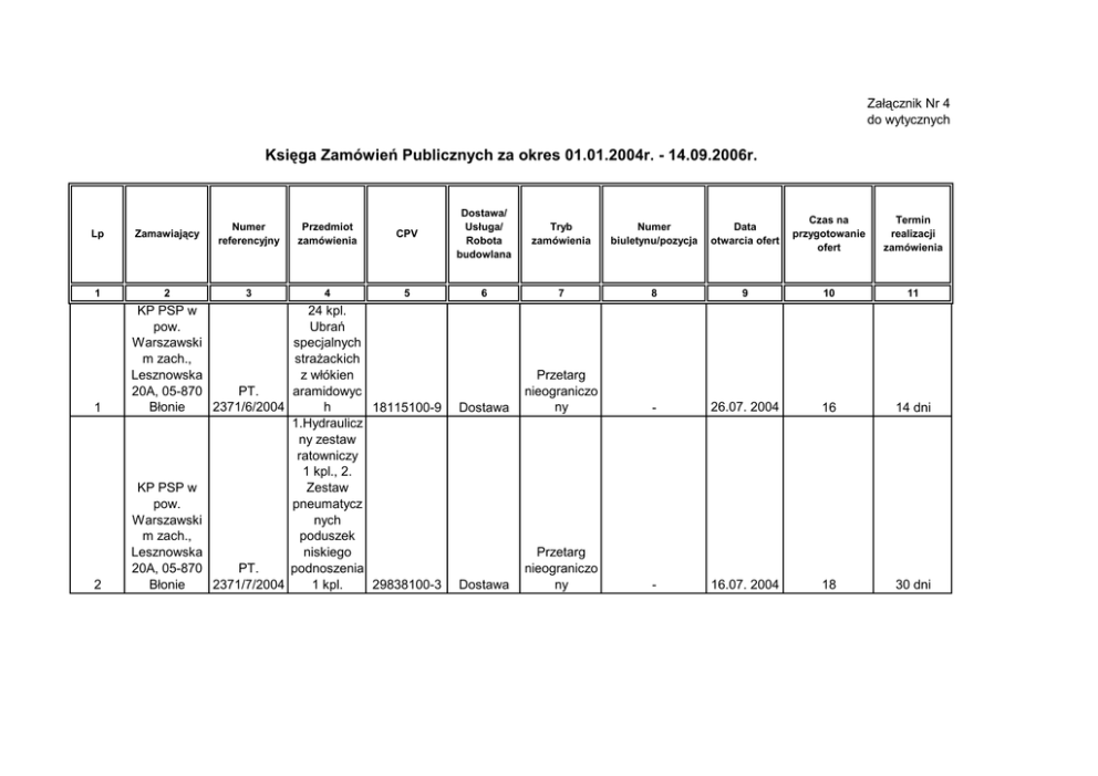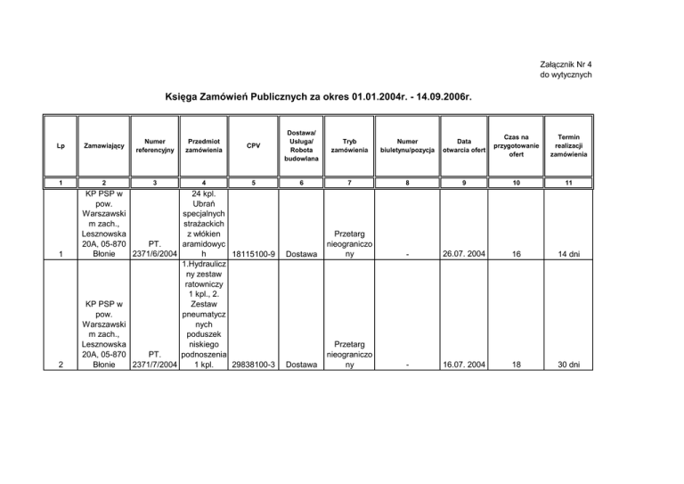Załącznik Nr 4 do wytycznych Księga Zamówień Publicznych za okres 01.01.2004r. - 14.09.2006r. Lp Zamawiający Numer referencyjny 1 2 3 1 2 Przedmiot zamówienia 4 CPV Dostawa/ Usługa/ Robota budowlana Tryb zamówienia Numer biuletynu/pozycja Data otwarcia ofert Czas na przygotowanie ofert Termin realizacji zamówienia 5 6 7 8 9 10 11 Dostawa Przetarg nieograniczo ny - 26.07. 2004 16 14 dni Dostawa Przetarg nieograniczo ny - 16.07. 2004 18 30 dni KP PSP w 24 kpl. pow. Ubrań Warszawski specjalnych m zach., straŜackich Lesznowska z włókien 20A, 05-870 PT. aramidowyc Błonie 2371/6/2004 h 18115100-9 1.Hydraulicz ny zestaw ratowniczy 1 kpl., 2. KP PSP w Zestaw pow. pneumatycz Warszawski nych m zach., poduszek Lesznowska niskiego 20A, 05-870 PT. podnoszenia Błonie 2371/7/2004 1 kpl. 29838100-3 3 4 KP PSP w pow. Warszawski m zach., samochód Lesznowska rozpoznawc 20A, 05-870 PT. zo Błonie 2371/8/2004 operacyjny 34114000-9 KP PSP w pow. Warszawski m zach., zestaw Lesznowska narzędzi 20A, 05-870 PT. hydrauliczny Błonie 2371/9/2004 ch 29838100-3 Dostawa Przetarg nieograniczo ny - 15.11. 2004 20 25 dni Dostawa Przetarg nieograniczo ny - 07.12. 2004 18 14 dni Wartość szacunkowa netto (w PLN) Liczba otrzymanych ofert w postępowaniu Wartość najkorzystniejszej oferty Wykonawca/ nr umowy 12 13 14 15 50.974,80 DEVA Poland Sp. z o.o., 3 Maja 19, 43-400 Cieszyn 2004/08/01 84.530,00 Delta Service s.j., Marecka 66, 05-220 Zielonka, 2004/08/02 48.000 85.000 1 3 Wykonawca Wartość najtańszej oferty Wykonawca Liczba protestów w postępowaniu z informacją o uznaniu lub oddaleniu 16 17 18 19 20 50.974,80 DEVA Poland Sp. z o.o., 3 Maja 19, 43-400 Cieszyn 50.974,80 DEVA Poland Sp. z o.o., 3 Maja 19, 43400 Cieszyn 0 84.530,00 Delta Service s.j., Marecka 66, 05-220 Zielonka 0 Wartość najdroŜszej oferty 96.300 S.C. Delta Service Poznań 60.000 45.000 1 1 63.613,05 FRANKCARS Sp.z.o.o., Jagiellońska 147/151, 42200 Częstocho wa, 3/11/2004 45.261,00 Delta Service s.j., Marecka 66, 05-220 Zielonka, 5/12/2004 63.613,05 FRANK-CARS Sp.z.o.o., Jagiellońska 147/151, 42-200 Częstocho wa 45.261,00 Delta Service s.j., Marecka 66, 05220 Zielonka 63.613,05 FRANKCARS Sp.z.o.o., Jagiellońska 147/151, 42200 Częstocho wa 0 45.261,00 Delta Service s.j., Marecka 66, 05-220 Zielonka 0 Liczba odwołań z informacją o uznaniu lub oddaleniu Data zawarcia umowy 21 22 Skutki finansowe realizacji postępowania w następnych latach (w PLN) Waloryzacja (Tak/Nie) Źródła finansowania (w PLN) 2005 rok 2006 rok 2007 rok 2008 rok 2009 rok 2010 rok BudŜet Fundusze pomocowe Inne 23 24 25 26 27 28 29 30 31 32 0 06.08. 2004 nie - - - - - - 26.974,80 24.000,00 - 0 16.08. 2004 nie - - - - - - 42.030,00 42.500,00 - 0 22.11. 2004 nie - - - - - - 63.613,05 - - 0 15.12. 2004 nie - - - - - - 45.261,00 - - Aneksy do umowy/ew. umowy dodatkowe związane z realizacją tego samego postępowania Suma wartości aneksów lub umów dodatkowych związanych z realizacją tego samego postępowania NaleŜyte wykonanie umów (Tak/Nie) Zastosowanie kar umownych (wartość) Data zawarcia Wartość 33 34 35 36 37 - - - TAK NIE - - - TAK NIE - - - TAK NIE - - - TAK NIE