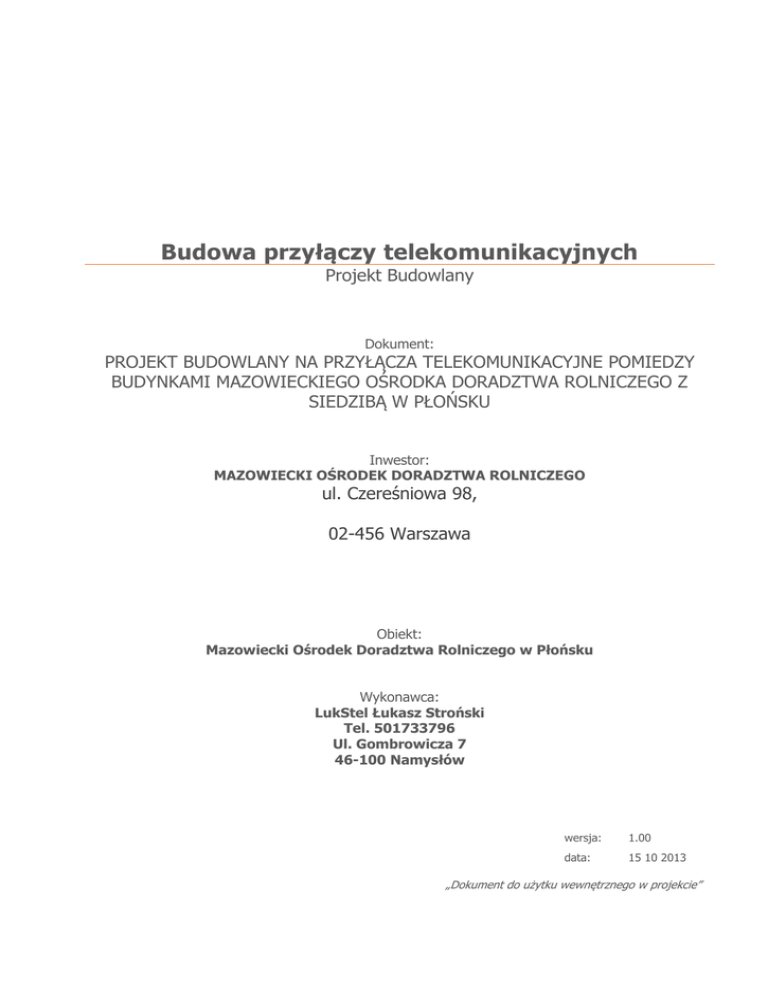 Budowa przyłączy telekomunikacyjnych Projekt Budowlany Dokument: PROJEKT BUDOWLANY NA PRZYŁĄCZA TELEKOMUNIKACYJNE POMIEDZY BUDYNKAMI MAZOWIECKIEGO OŚRODKA DORADZTWA ROLNICZEGO Z SIEDZIBĄ W PŁOŃSKU Inwestor: MAZOWIECKI OŚRODEK DORADZTWA ROLNICZEGO ul. Czereśniowa 98, 02-456 Warszawa Obiekt: Mazowiecki Ośrodek Doradztwa Rolniczego w Płońsku Wykonawca: LukStel Łukasz Stroński Tel. 501733796 Ul. Gombrowicza 7 46-100 Namysłów wersja: 1.00 data: 15 10 2013 „Dokument do użytku wewnętrznego w projekcie” Dokument: PROJEKT ZGŁOSZENIA BUDOWLANEGO Inwestor: MAZOWIECKI OŚRODEK DORADZTWA ROLNICZEGO UL. CZEREŚNIOWA 98 02-456 WARSZAWA Obiekt: PRZYŁĄCZE TELEKOMUNIKACYJNE POMIEDZY OBIEKTAMI MAZOWIECKIEGO OŚRODEK DORADZTWA ROLNICZEGO ODDZIAŁ POŚWIĘTNE W PŁOŃSKU UL. SIENKIEWICZA 11, działka 195/23 Wykonawca dokumentacji: LUKSTEL ŁUKASZ STROŃSKI Metryka dokumentu Opis Projekt / Zespół Kierownik Projektu Tytuł dokumentu Wersja dokumentu Status dokumentu Wartość Zespół Teletechniki Łukasz Stroński Projekt budowlany przyłącza telekomunikacyjnego <1.00> < zatwierdzony> Zespół Projektowy Opis Projektował imie i nazwisko dr inż. Rafał Królikowski nr uprawnień DTT-TU/02298/02/U Tytuł dokumentu: Dokumentacja budowlana. Budowa przyłącza MODR podpis Spis treści 1. Wstęp ................................................................................................................................ 4 1.1. Cel dokumentu ........................................................................................................ 4 1.2. Zakres dokumentu................................................................................................... 4 1.3. Podstawa opracowania ............................................................................................ 4 2. Założenia projektowe .......................................................................................................... 5 3. Budowa przyłączy ............................................................................................................... 5 3.1. Przyłącze do budynku hotelowego ............................................................................ 5 3.2. Przyłącze do budynku szkoleniowego ........................................................................ 5 3.3. Kanalizacja teletechniczna – wymagania ogólne ......................................................... 6 4. Montaż studni kablowej kanalizacji teletechnicznej SK-1 ......................................................... 8 5. Ustalenia końcowe .............................................................................................................. 9 6. Wykaz materiałów .............................................................................................................. 9 7. Załączniki ........................................................................................................................... 9 Tytuł dokumentu: Dokumentacja budowlana. Budowa przyłącza MODR 3 1. Wstęp 1.1. Cel dokumentu Celem niniejszego opracowania jest projekt budowlanego przyłączy telekomunikacyjnych w obiektach Mazowieckiego Ośrodka Doradztwa Rolniczego w Płońsku. W zakres projektu wchodzi budowa kanalizacji teletechnicznej oraz postawienie studni telekomunikacyjnych na terenie należącym do inwestora. 1.2. Zakres dokumentu W zakres projektu budowlanego wchodzi budowa przyłączy kanalizacyjnych do obiektów Mazowieckiego Ośrodka Doradztwa Rolniczego w Płońsku. Zakłada się instalację dwóch przyłączy kanalizacyjnych prowadzących od budynku głównego gdzie znajduje się główny węzeł sieci do hotelu oraz z hotelu do budynku szkoleniowego. Lokalizacja budynków zaznaczona na rys 1. (poniżej) 1.3. Podstawa opracowania Podstawa opracowania jest umowa nr 21/A.G.214-16/13 zawarta pomiędzy Mazowieckim Ośrodkiem Doradztwa Rolniczego a firmą Lukstel Łukasz Stroński Dokumentacja została opracowana zgodnie z: Rozporządzeniem Ministra Infrastruktury z dnia 2 września 2004r. w sprawie szczegółowego zakresu i formy dokumentacji projektowej, specyfikacji technicznych wykonania i odbioru robót budowlanych oraz programu funkcjonalno-użytkowego (Dz.U.04.202.2072 z późniejszymi zmianami), Rozporządzeniem Ministra Infrastruktury z dnia 18 maja 2004r. w sprawie określenia metod i podstaw sporządzania kosztorysu inwestorskiego, obliczania planowanych kosztów prac projektowych oraz planowanych kosztów robót budowlanych, Rozporządzeniem Ministra Infrastruktury z dnia 3 lipca 2003r. w sprawie szczegółowego zakresu i formy projektu budowlanego (Dz.U.03.120.1133 z późniejszymi zmianami), Ustawą z dnia 07.07.1994 Prawo Budowlane (Dz.U.06.129.902-j.t z późniejszymi zmianami), Ustawą Prawo ochrony środowiska, (Dz.U.06.129.902-j.t z późniejszymi zmianami), Uzgodnieniami z Mazowieckim Ośrodkiem Doradztwa Rolniczego, Tytuł dokumentu: Dokumentacja budowlana. Budowa przyłącza MODR 4 ZN-96/TPSA-002. Linie optotelekomunikacyjne. Ogólne wymagania techniczne. ZN-96/TPSA-004. Zbliżenia i skrzyżowania z innymi urządzeniami uzbrojenia terenowego. Ogólne wymagania techniczne. ZN-96/TPSA-011. Telekomunikacyjna kanalizacja kablowa. Ogólne wymagania techniczne. ZN-96/TPSA-013. Kanalizacja wtórna i rurociągi kablowe. Wymagania i badania. 2. Założenia projektowe Budowa przyłączy telekomunikacyjnych zakłada doprowadzenia kabli światłowodowych z głównego węzła sieci znajdującego się w budynku zakładowym do hotelu oraz budynku szkoleniowego. Kable światłowodowe będą ułożone w 2 odcinkach nowo wybudowanej kanalizacji. Pierwszy odcinek połączy hotel z budynkiem zakładowym. Drugi odcinek połączy budynek szkoleniowy z hotelem. Kanalizacja będzie wybudowana z rur RHDPE 40. Plan położenia budynków znajduje się na rys. 1 Zarządzającym oraz właścicielem przyłączy jest inwestor, dlatego wszystkie warunki techniczne znajdują się w poniższym dokumen