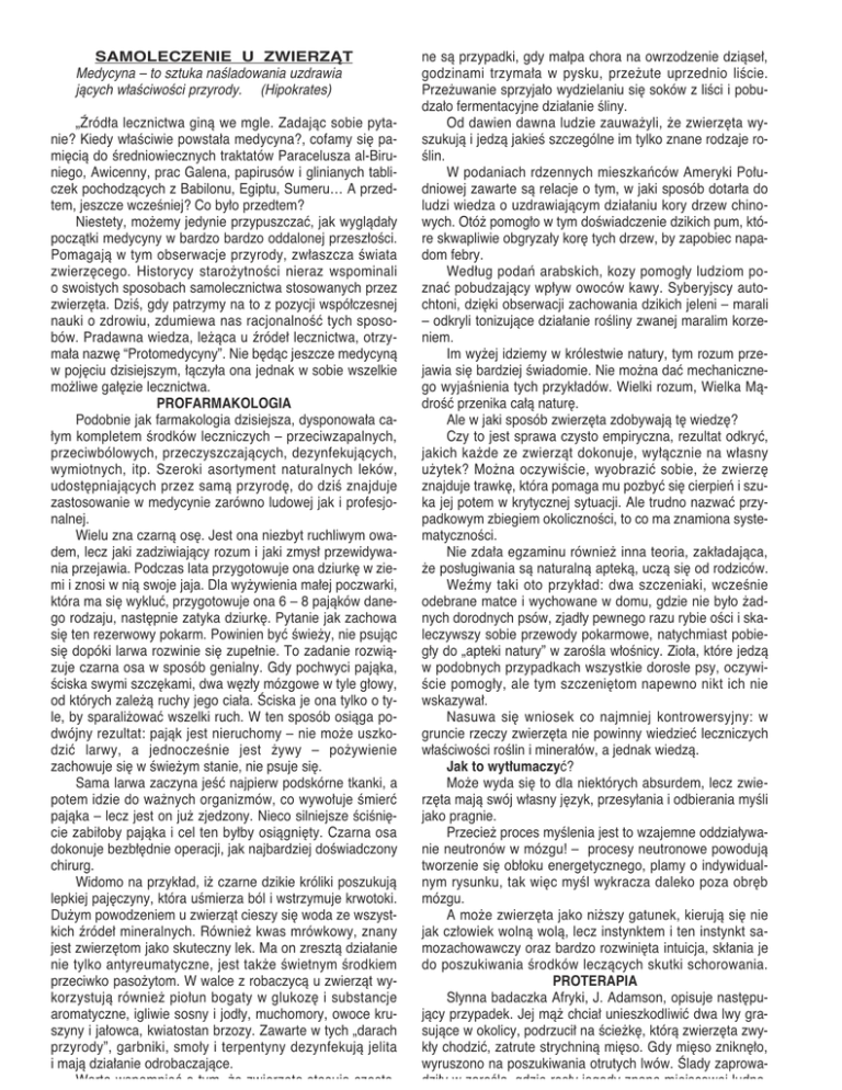 SAMOLECZENIE U ZWIERZÑT Medycyna – to sztuka naÊladowania uzdrawia jàcych w∏aÊciwoÊci przyrody. (Hipokrates) „èród∏a lecznictwa ginà we mgle. Zadajàc sobie pytanie? Kiedy w∏aÊciwie powsta∏a medycyna?, cofamy si´ pami´cià do Êredniowiecznych traktatów Paracelusza al-Biruniego, Awicenny, prac Galena, papirusów i glinianych tabliczek pochodzàcych z Babilonu, Egiptu, Sumeru… A przedtem, jeszcze wczeÊniej? Co by∏o przedtem? Niestety, mo˝emy jedynie przypuszczaç, jak wyglàda∏y poczàtki medycyny w bardzo bardzo oddalonej przesz∏oÊci. Pomagajà w tym obserwacje przyrody, zw∏aszcza Êwiata zwierz´cego. Historycy staro˝ytnoÊci nieraz wspominali o swoistych sposobach samolecznictwa stosowanych przez zwierz´ta. DziÊ, gdy patrzymy na to z pozycji wspó∏czesnej nauki o zdrowiu, zdumiewa nas racjonalnoÊç tych sposobów. Pradawna wiedza, le˝àca u êróde∏ lecznictwa, otrzyma∏a nazw´ “Protomedycyny”. Nie b´dàc jeszcze medycynà w poj´ciu dzisiejszym, ∏àczy∏a ona jednak w sobie wszelkie mo˝liwe ga∏´zie lecznictwa. PROFARMAKOLOGIA Podobnie jak farmakologia dzisiejsza, dysponowa∏a ca∏ym kompletem Êrodków leczniczych – przeciwzapalnych, przeciwbólowych, przeczyszczajàcych, dezynfekujàcych, wymiotnych, itp. Szeroki asortyment naturalnych leków, udost´pniajàcych przez samà przyrod´, do dziÊ znajduje zastosowanie w medycynie zarówno ludowej jak i profesjonalnej. Wielu zna czarnà os´. Jest ona niezbyt ruchliwym owadem, lecz jaki zadziwiajàcy rozum i jaki zmys∏ przewidywania przejawia. Podczas lata przygotowuje ona dziurk´ w ziemi i znosi w nià swoje jaja. Dla wy˝ywienia ma∏ej poczwarki, która ma si´ wykluç, przygotowuje ona 6 – 8 pajàków danego rodzaju, nast´pnie zatyka dziurk´. Pytanie jak zachowa si´ ten rezerwowy pokarm. Powinien byç Êwie˝y, nie psujàc si´ dopóki larwa rozwinie si´ zupe∏nie. To zadanie rozwiàzuje czarna osa w sposób genialny. Gdy pochwyci pajàka, Êciska swymi szcz´kami, dwa w´z∏y mózgowe w tyle g∏owy, od których zale˝à ruchy jego cia∏a. Âciska je ona tylko o tyle, by sparali˝owaç wszelki ruch. W ten sposób osiàga podwójny rezultat: pajàk jest nieruchomy – nie mo˝e uszkodziç larwy, a jednoczeÊnie jest ˝ywy – po˝ywienie zachowuje si´ w Êwie˝ym stanie, nie psuje si´. Sama larwa zaczyna jeÊç najpierw podskórne tkanki, a potem idzie do wa˝nych organizmów, co wywo∏uje Êmierç pajàka – lecz jest on ju˝ zjedzony. Nieco silniejsze ÊciÊni´cie zabi∏oby pajàka i cel ten by∏by osiàgni´ty. Czarna osa dokonuje bezb∏´dnie operacji, jak najbardziej doÊwiadczony chirurg. Widomo na przyk∏ad, i˝ czarne dzikie króliki poszukujà lepkiej paj´czyny, która uÊmierza ból i wstrzymuje krwotoki. Du˝ym powodzeniem u zwierzàt cieszy si´ woda ze wszystkich êróde∏ mineralnych. Równie˝ kwas mrówkowy, znany jest zwierz´tom jako skuteczny lek. Ma on zresztà dzia∏anie nie tylko antyreumatyczne, jest tak˝e Êwietnym Êrodkiem przeciwko paso˝ytom. W walce z robaczycà u zwierzàt wykorzystujà równie˝ pio∏un bogaty w glukoz´ i substancje aromatyczne, igliwie sosny i jod∏y, muchomory, owoce kruszyny i ja∏owca, kwiatostan brzozy. Zawarte w tych „darach przyrody”, garbniki, smo∏y i terpentyny dezynfekujà jelita i majà dzia∏anie odrobaczajàce. Warto wspomnieç o tym ˝e zwierz´ta stosujà cz´sto ne sà przypadki, gdy ma∏pa chora na owrzodzenie dziàse∏, godzinami trzyma∏a w pysku, prze˝ute uprzednio liÊcie. Prze˝uwanie sprzyja∏o wydzielaniu si´ soków z liÊci i pobudza∏o fermentacyjne dzia∏anie Êliny. Od dawien dawna ludzie zauwa˝yli, ˝e zwierz´ta wyszukujà i jedzà jakieÊ szczególne im tylko znane rodzaje roÊlin. W podaniach rdzennych mieszkaƒców Ameryki Po∏udniowej zawarte sà relacje o tym, w jaki sposób dotar∏a do ludzi wiedza o uzdrawiajàcym dzia∏aniu kory drzew chinowych. Otó˝ pomog∏o w tym doÊwiadczenie dzikich pum, które skwapliwie obgryza∏y kor´ tych drzew, by zapobiec napadom febry. Wed∏ug podaƒ arabskich, kozy pomog∏y ludziom poznaç pobudzajàcy wp∏yw owoców kawy. Syberyjscy autochtoni, dzi´ki obserwacji zachowania dzikich jeleni – marali – odkryli tonizujàce dzia∏anie roÊliny zwanej maralim korzeniem. Im wy˝ej idziemy w królestwie natury, tym rozum przejawia si´ bardziej Êwiadomie. Nie mo˝na daç mechanicznego wyjaÊnienia tych przyk∏adów. Wielki rozum, Wielka MàdroÊç przenika ca∏à natur´. Ale w jaki sposób zwierz´ta zdobywajà t´ wiedz´? Czy to jest sprawa czysto empiryczna, rezultat odkryç, jakich ka˝de ze zwierzàt dokonuje, wy∏àcznie na w∏asny u˝ytek? Mo˝na oczywiÊcie, wyobraziç sobie, ˝e zwierz´ znajduje trawk´, która pomaga mu pozbyç si´ cierpieƒ i szuka jej potem w krytycznej sytuacji. Ale trudno nazwaç przypadkowym zbiegiem okolicznoÊci, to co ma znamiona systematycznoÊci. Nie zda∏a egzaminu równie˝ inna teoria, zak∏adajàca, ˝e pos∏ugiwania sà naturalnà aptekà, uczà si´ od rodziców. Weêmy taki oto przyk∏ad: dwa szczeniaki, wczeÊnie odebrane matce i wychowane w domu, gdzie nie by∏o ˝adnych dorodnych psów, zjad∏y pewnego razu rybie oÊci i skaleczywszy sobie przewody pokarmowe, natychmiast pobieg∏y do „apteki natury” w zaroÊla w∏oÊnicy. Zio∏a, które jedzà w podobnych przypadkach wszystkie doros∏e psy, oczywiÊcie pomog∏y, ale tym szczeni´tom napewno nikt ich nie wskazywa∏. Nasuwa si´ wniosek co najmniej kontrowersyjny: w gruncie rzeczy zwierz´ta nie powinny wiedzieç leczniczych w∏aÊciwoÊci roÊlin i minera∏ów, a jednak wiedzà. Jak to wyt∏umaczyç? Mo˝e wyda si´ to dla niektórych absurdem, lecz zwierz´ta majà swój w∏asny j´zyk, przesy∏ania i odbierania myÊli jako pragnie. Przecie˝ proces myÊlenia jest to wzajemne oddzia∏ywanie neutronów w mózgu! – procesy neutronowe powodujà tworzenie si´ ob∏oku energetyczn