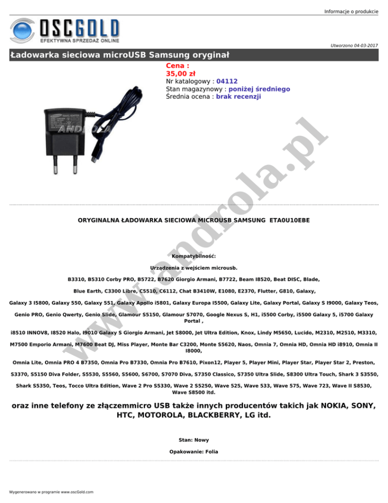 Informacje o produkcie Utworzono 04-03-2017 Ładowarka sieciowa microUSB Samsung oryginał Cena : 35,00 zł ro la .p l Nr katalogowy : 04112 Stan magazynowy : poniżej średniego Średnia ocena : brak recenzji nd ORYGINALNA ŁADOWARKA SIECIOWA MICROUSB SAMSUNG ETA0U10EBE Kompatybilność: w .a Urządzenia z wejściem microusb. B3310, B5310 Corby PRO, B5722, B7620 Giorgio Armani, B7722, Beam I8520, Beat DISC, Blade, Blue Earth, C3300 Libre, C5510, C6112, Chat B3410W, E1080, E2370, Flutter, G810, Galaxy, Galaxy 3 I5800, Galaxy 550, Galaxy 551, Galaxy Apollo i5801, Galaxy Europa I5500, Galaxy Lite, Galaxy Portal, Galaxy S I9000, Galaxy Teos, w Genio PRO, Genio Qwerty, Genio Slide, Glamour S5150, Glamour S7070, Google Nexus S, H1, i5500 Corby, i5500 Galaxy 5, i5700 Galaxy Portal , i8510 INNOV8, I8520 Halo, I9010 Galaxy S Giorgio Armani, Jet S8000, Jet Ultra Edition, Knox, Lindy M5650, Lucido, M2310, M2510, M3310, w M7500 Emporio Armani, M7600 Beat DJ, Miss Player, Monte Bar C3200, Monte S5620, Naos, Omnia 7, Omnia HD, Omnia HD i8910, Omnia II I8000, Omnia Lite, Omnia PRO 4 B7350, Omnia Pro B7330, Omnia Pro B7610, Pixon12, Player 5, Player Mini, Player Star, Player Star 2, Preston, S3370, S5150 Diva Folder, S5530, S5560, S5600, S6700, S7070 Diva, S7350 Classico, S7350 Ultra Slide, S8300 Ultra Touch, Shark 3 S3550, Shark S5350, Teos, Tocco Ultra Edition, Wave 2 Pro S5330, Wave 2 S5250, Wave 525, Wave 533, Wave 575, Wave 723, Wave II S8530, Wave S8500 itd. oraz inne telefony ze złączemmicro USB także innych producentów takich jak NOKIA, SONY, HTC, MOTOROLA, BLACKBERRY, LG itd. Stan: Nowy Opakowanie: Folia Wygenerowano w programie www.oscGold.com