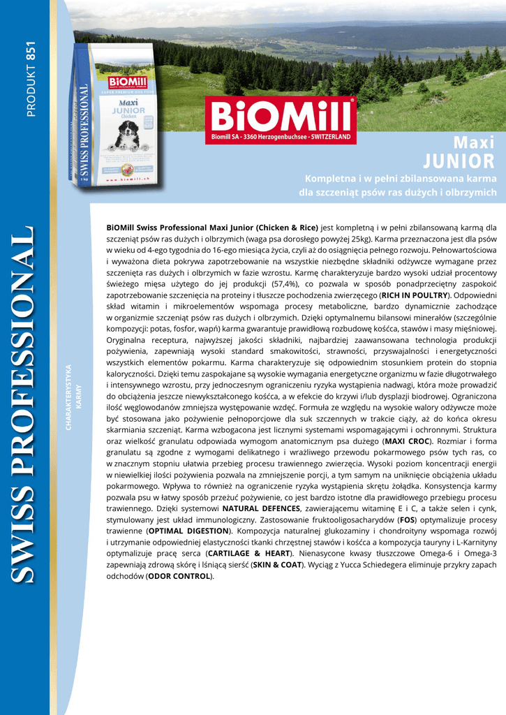 CHARAKTERYSTYKA KARMY Kompletna i w pełni zbilansowana karma dla szczeniąt psów ras dużych i olbrzymich BiOMill Swiss Professional Maxi Junior (Chicken & Rice) jest kompletną i w pełni zbilansowaną karmą dla szczeniąt psów ras dużych i olbrzymich (waga psa dorosłego powyżej 25kg). Karma przeznaczona jest dla psów w wieku od 4-ego tygodnia do 16-ego miesiąca życia, czyli aż do osiągnięcia pełnego rozwoju. Pełnowartościowa i wyważona dieta pokrywa zapotrzebowanie na wszystkie niezbędne składniki odżywcze wymagane przez szczenięta ras dużych i olbrzymich w fazie wzrostu. Karmę charakteryzuje bardzo wysoki udział procentowy świeżego mięsa użytego do jej produkcji (57,4%), co pozwala w sposób ponadprzeciętny zaspokoić zapotrzebowanie szczenięcia na proteiny i tłuszcze pochodzenia zwierzęcego (RICH IN POULTRY). Odpowiedni skład witamin i mikroelementów wspomaga procesy metaboliczne, bardzo dynamicznie zachodzące w organizmie szczeniąt psów ras dużych i olbrzymich. Dzięki optymalnemu bilansowi minerałów (szczególnie kompozycji: potas, fosfor, wapń) karma gwarantuje prawidłową rozbudowę kośćca, stawów i masy mięśniowej. Oryginalna receptura, najwyższej jakości składniki, najbardziej zaawansowana technologia produkcji pożywienia, zapewniają wysoki standard smakowitości, strawności, przyswajalności i energetyczności wszystkich elementów pokarmu. Karma charakteryzuje się odpowiednim stosunkiem protein do stopnia kaloryczności. Dzięki temu zaspokajane są wysokie wymagania energetyczne organizmu w fazie długotrwałego i intensywnego wzrostu, przy jednoczesnym ograniczeniu ryzyka wystąpienia nadwagi, która może prowadzić do obciążenia jeszcze niewykształconego kośćca, a w efekcie do krzywi i/lub dysplazji biodrowej. Ograniczona ilość węglowodanów zmniejsza występowanie wzdęć. Formuła ze względu na wysokie walory odżywcze może być stosowana jako pożywienie pełnoporcjowe dla suk szczennych w trakcie ciąży, aż do końca okresu skarmiania szczeniąt. Karma wzbogacona jest licznymi systemami wspomagającymi i ochronnymi. Struktura oraz wielkość granulatu odpowiada wymogom anatomicznym psa dużego (MAXI CROC). Rozmiar i forma granulatu są zgodne z wymogami delikatnego i wrażliwego przewodu pokarmowego psów tych ras, co w znacznym stopniu ułatwia przebieg procesu trawiennego zwierzęcia. Wysoki poziom koncentracji energii w niewielkiej ilości pożywienia pozwala na zmniejszenie porcji, a tym samym na uniknięcie obciążenia układu pokarmowego. Wpływa to również na ograniczenie ryzyka wystąpienia skrętu żołądka. Konsystencja karmy pozwala psu w łatwy sposób przeżuć pożywienie, co jest bardzo istotne dla prawidłowego przebiegu procesu trawiennego. Dzięki systemowi NATURAL DEFENCES, zawierającemu witaminę E i C, a także selen i cynk, stymulowany jest układ immunologiczny. Zastosowanie fruktooligosacharydów (FOS) optymalizuje procesy trawienne (OPTIMAL DIGESTION). Kompozycja naturalnej glukozaminy i chondroityny wspomaga rozwój i utrzymanie odpowiedniej elastyczności tkanki chrzęstnej stawów i kośćca a kompozycja tauryny i L-Karnityny optymalizuje pracę serca (CARTILAGE & HEART). Nienasycone kwasy tłuszczowe Omega-6 i Omega-3 zapewniają zdrową skórę i lśniącą sierść (SKIN & COAT). Wyciąg z Yucca Schiedegera eliminuje przykry zapach odchodów (ODOR CONTROL). SKIN & COAT – Niezbędne, Nienasycone Kwasy Tłuszczowe Omega – 3 i Omega – 6, wspomagają pracę serca i układu krążenia oraz zapobiegają powstawaniu zmian miażdżycowych. NNKT optymalizują również pracę układu trawiennego, wzmagają pamięć i koncentrację a także perfekcyjnie odżywiają skórę i sierść zwierzęcia CARTILAGE & HEART – kompozycja siarczanu glukozaminy i chondroityny, w formie naturalnego ekstraktu z chrząstki drobiowej, optymalizująca rozwój i utrzymanie na odpowiednim poziomie kondycji tkanki chrzęstnej stawów i kośćca. Formułę charakteryzuje także wysoki poziom aplikacji tauryny, stanowiącej niezbędny aminokwas odpowiedzialny za prawidłowe funkcjonowanie pracy serca, prawidłowy przebieg procesu trawienia tłuszczu a także za równowagę jonową organizmu i funkcjonowanie wzroku ODOR CONTROL – ekstrakt z Yucca Shiedegera, eliminuje nieprzyjemny zapach odchodów, w tym moczu o +/- 30 % i kału o +/70% NATURAL DEFENCES – kompozycja witamin A, E i C, a także selenu i cynku, wzmacniająca i stymulująca układ odpornościowy OPTIMAL DIGESTION – kompozycja probiotyków, fruktooligosacharydów (F.O.S.) i ekstraktów roślinnych dla wzbogacenia flory bakteryjnej i pobudzenia enzymów trawiennych układu pokarmowego zwierzęcia oraz unikalne włókno na bazie akacji afrykańskiej, dla oczyszczania, detoksykacji, i podniesienia kultury pracy układu pokarmowego. MAXI CROC (Duży Krokiet) – wielkość, kształt, struktura i twardość granulatu odpowiadają wymogom anatomicznym i fizjologicznym psa rasy dużej i olbrzymiej Mięso drobiowe (28% dehydratyzowane mięso drobiowe i 4,5% świeżych kawałków kurczaka), ryż, kukurydza, tłuszcz drobiowy, gluten kukurydziany, koncentrat protein sojowych, ekstrudowane siemię lniane, mączka rybna, drożdży piwne, suszona pulpa buraka cukrowego, wątróbka hydrolizowana, lignoceluloza , sól, fruktooligosacharydy (FOS 0,2%), hydrolizowana chrząstka drobiowa (0,2%), lecytyna, proszek Yucca (0,1%). Jednostka /kg 9.0 Białko surowe % 32.0 Witamina D3 /Ul Tłuszcz % 14.0 Witamina E /Ul Włókno surowe % 2.5 Popiół surowy % 7.0 Wapń % 1.0 Fosfor % 0.8 Potas % 0.6 Sód % Magnez % Kwas tłuszczowy Omega-6 % Kwas tłuszczowy Omega-3 % 0.4 0.12 Wartość Witamina A /Ul Jednostka /kg 17.000 1.500 500 Witamina B1 /mg 13 Witamina B2 /mg 25 Witamina C /mg Kwas nikotynowy /mg Kwas pantotenowy /mg Witamina B6 /mg 50 Witamina B12 /mcg 130 3.0 Biotyna /mcg 0.7 Kwas foliowy /mg Wartość Cholina /mg Suplementy żywieniowe Skład