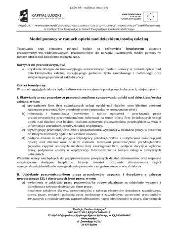 Człowiek – najlepsza inwestycja Projekt „PI – Innowacyjny model GODZENIE PRZEZ KOBIETY ŻYCIA ZAWODOWEGO I RODZINNEGO” współfinansowany ze środków Unii Europejskiej w ramach Europejskiego Funduszu Społecznego Model pomocy w ramach opieki nad dzieckiem/osobą zależną Testowanie tego elementu polegać będzie na całkowicie bezpłatnym dostępie pracodawczyń/ów/oddelegowanych pracownic/ków do narzędzi tworzących model pomocy w ramach opieki nad dzieckiem/osobą zależną. Korzyści dla pracodawczyń/ów: uzyskanie dostępu do innowacyjnego, uniwersalnego modelu pomocy w ramach opieki nad dzieckiem/osobą zależną, sprzyjającego godzeniu życia zawodowego i rodzinnego oraz zwiększającego potencjał zakładu pracy Zakres tematyczny: W ramach modelu działania będą realizowane we wzajemnie powiązanych obszarach, obejmujących: I. Ułatwianie przez pracodawcę pracownicom/kom sprawowania opieki nad dzieckiem/osobą zależną, w tym: a) sporządzenie listy firm świadczących usługi opieki nad dziećmi oraz bliskimi osobami zależnymi pracownic/ków przedsiębiorstw (poprzedzone rozeznaniem ofert) b) informacja i komunikacja (newsletter i tablica ogłoszeń) - przekazanie przez pracodawczynię/cę pracownicom/kom informacji na temat oferty firm świadczących usługi opieki nad dziećmi oraz bliskimi osobami zależnymi pracownic/ków przedsiębiorstw wraz z informacją o warunkach cenowych takiej współpracy. c) wybór grupy pracownic/ków, działu (departamentu, wydziału) w zakładzie pracy, w stosunku do których testowany będzie ten element modelu. d) podjęcie działań w celu podjęcia współpracy przedsiębiorstwa z instytucjami świadczącymi opiekę nad dziećmi oraz bliskimi osobami zależnymi pracownic/ków przedsiębiorstw (wysyłka zapytań cenowych, ustalenie listy rankingowej firm, podjęcie decyzji o wyborze firmy, podpisanie umowy o współpracy). Informowanie na bieżąco załogi o powyższych ustaleniach. Wszelkie wzory niezbędnych do przeprowadzenia powyższych działań dokumentów oraz wsparcie merytoryczne dostępne bezpłatnie. Istnieje również możliwość sfinansowania części wynagrodzenia/dodatku do wynagrodzenia personelu zaangażowanego w ww. działania. II. Udzielanie pracownicom/kom przez pracodawców wsparcia i doradztwa z zakresu nowoczesnego ZZL i elastycznych form pracy, w tym: a) wyłonienie w zakładzie pracy pracownicy/ka odpowiedzialnego za udzielanie wsparcia i doradztwa z zakresu elastycznych form pracy. Bezpłatne szkolenie dla ww. pracownicy/ka z zakresu elementów doradztwa zawodowego, prawa pracy, tematyki godzenia życia osobistego z zawodowym, uprawnień pracowników związanych z rodzicielstwem, usprawiedliwianiem nagłej nieobecności w pracy, elastycznych Fundacja „Fundusz Inicjatyw” NIP 9462553005, REGON 060368615, VI Wydział Gospodarczy Krajowego Rejestru Sądowego, nr KRS 0000306907 Biuro projektu: ul. Żeromskiego 94/115 26-610 Radom Człowiek – najlepsza inwestycja Projekt „PI – Innowacyjny model GODZENIE PRZEZ KOBIETY ŻYCIA ZAWODOWEGO I RODZINNEGO” współfinansowany ze środków Unii Europejskiej w ramach Europejskiego Funduszu Społecznego form pracy (przedstawiciel/ka zakładu pracy weźmie udział w szkoleniu jako członek grupy szkoleniowej - dołączy do otwartej grupy szkoleniowej lub w szkoleniu indywidualnym). b) przekazanie przez pracodawczynię/cę pracownicom/kom informacji o wyłonieniu i przeszkoleniu pracownicy/ka odpowiedzialnej/go za udzielanie wsparcia i doradztwa z zakresu elastycznych form pracy. Informacja i komunikacja (newsletter, tablica ogłoszeń). c) sporządzenie odpowiedniego zakresu obowiązków pracownicy/ka odpowiedzialnego za udzielanie zinstytucjonalizowanego kompleksowego wsparcia i doradztwa z zakresu elastycznych form pracy. Sporządzenie regulaminu doradztwa wewnątrzzakładowego z zakresu elastycznych form pracy i podanie go do wiadomości załogi pracowniczej. Informacja i komunikacja (newsletter, tablica ogłoszeń). Wszelkie wzory niezbędnych do przeprowadzenia powyższych działań dokumentów oraz wsparcie merytoryczne dostępne bezpłatnie, również udział w szkoleniu wydelegowanej/go pracownicy/ka zostanie sfinansowany w ramach projektu. Istnieje także możliwość sfinansowania części wynagrodzenia/dodatku do wynagrodzenia personelu zaangażowanego w ww. działania. III. Wdrażanie wybranych elastycznych form zatrudnienia oraz elastycznej organizacji czasu pracy, jako sprzyjających godzeniu życia osobistego z zawodowym, w tym: a) bezpłatne szkolenia dla kadry zarządzającej z zakresu elastycznych form zatrudnienia oraz elastycznej organizacji czasu pracy. Szkolenia w postaci otwartego szkolenia zewnętrznego lub szkolenia wyłącznie dla kadry danego zakładu pracy, w tym możliwość szkolenia indywidualnego. b) przekazanie przez pracodawczynię/cę pracownicom/kom wiedzy z zakresu elastycznych form zatrudnienia oraz elastycznej organizacji czasu pracy. Spotkanie informacyjne dla pracownic/ków, prowadzone przez przedstawiciela/kę firmy, który/a brał/a udział w szkoleniu. c) Informacja i komunikacja (newsletter, informacja na tablicy ogłoszeń). Podjęcie działań w celu wdrażania wybranych elastycznych form zatrudnienia oraz elastycznej organizacji czasu pracy, tj.: 1. opracowanie i podanie do wiadomości pracownic/ków obwieszczenia w sprawie stosowania elastycznych form pracy lub 2. opracowanie i podanie do wiadomości pracownic/ków Regulaminu pracy (zmian Regulaminie pracy) w sprawie stosowania elastycznych form pracy. Wybór pracownic/ków lub działu (departamentu, wydziału) w zakładzie pracy, w którym wdrażane będą wybrane elastyczne formy zatrudnienia oraz formy elastycznej organizacji czasu pracy. Wszelkie wzory niezbędnych do przeprowadzenia powyższych działań dokumentów oraz wsparcie merytoryczne dostępne bezpłatnie, również udział w szkoleniu kadry zarządzającej zostanie sfinansowany w ramach pr