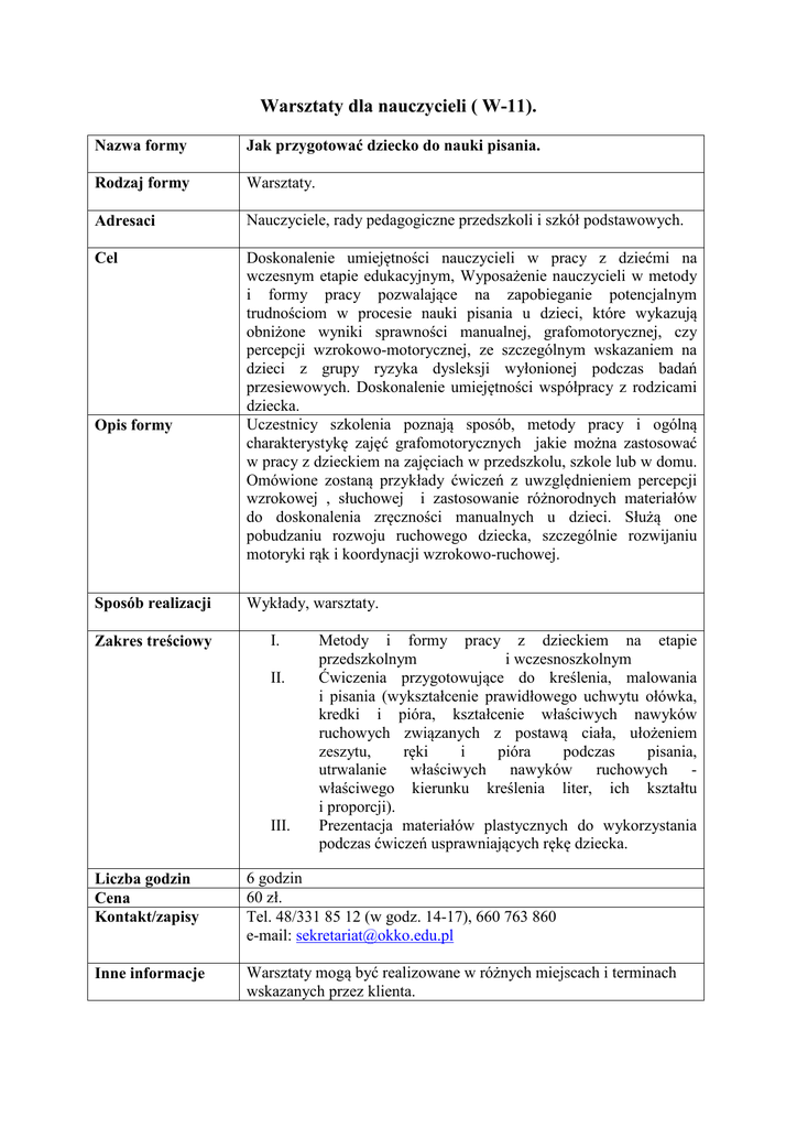 Warsztaty dla nauczycieli ( W-11). Nazwa formy Jak przygotować dziecko do nauki pisania. Rodzaj formy Warsztaty. Adresaci Nauczyciele, rady pedagogiczne przedszkoli i szkół podstawowych. Cel Doskonalenie umiejętności nauczycieli w pracy z dziećmi na wczesnym etapie edukacyjnym, Wyposażenie nauczycieli w metody i formy pracy pozwalające na zapobieganie potencjalnym trudnościom w procesie nauki pisania u dzieci, które wykazują obniżone wyniki sprawności manualnej, grafomotorycznej, czy percepcji wzrokowo-motorycznej, ze szczególnym wskazaniem na dzieci z grupy ryzyka dysleksji wyłonionej podczas badań przesiewowych. Doskonalenie umiejętności współpracy z rodzicami dziecka. Uczestnicy szkolenia poznają sposób, metody pracy i ogólną charakterystykę zajęć grafomotorycznych jakie można zastosować w pracy z dzieckiem na zajęciach w przedszkolu, szkole lub w domu. Omówione zostaną przykłady ćwiczeń z uwzględnieniem percepcji wzrokowej , słuchowej i zastosowanie różnorodnych materiałów do doskonalenia zręczności manualnych u dzieci. Służą one pobudzaniu rozwoju ruchowego dziecka, szczególnie rozwijaniu motoryki rąk i koordynacji wzrokowo-ruchowej. Opis formy Sposób realizacji Zakres treściowy Wykłady, warsztaty. I. II. III. Metody i formy pracy z dzieckiem na etapie przedszkolnym i wczesnoszkolnym Ćwiczenia przygotowujące do kreślenia, malowania i pisania (wykształcenie prawidłowego uchwytu ołówka, kredki i pióra, kształcenie właściwych nawyków ruchowych związanych z postawą ciała, ułożeniem zeszytu, ręki i pióra podczas pisania, utrwalanie właściwych nawyków ruchowych właściwego kierunku kreślenia liter, ich kształtu i proporcji). Prezentacja materiałów plastycznych do wykorzystania podczas ćwiczeń usprawniających rękę dziecka. Liczba godzin Cena Kontakt/zapisy 6 godzin 60 zł. Tel. 48/331 85 12 (w godz. 14-17), 660 763 860 e-mail: [email protected] Inne informacje Warsztaty mogą być realizowane w różnych miejscach i terminach wskazanych przez klienta.