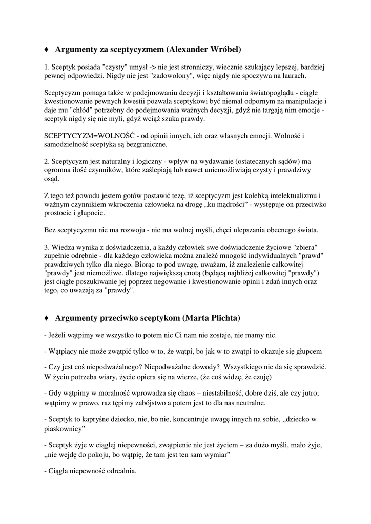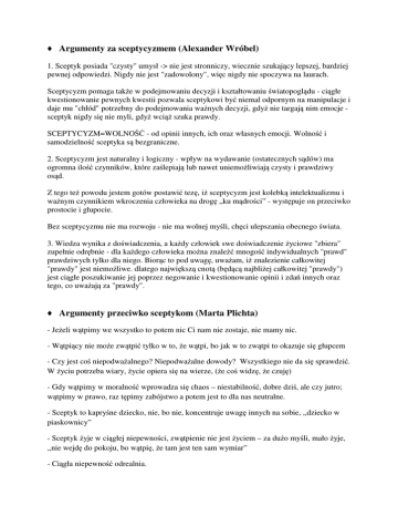 ♦ Argumenty za sceptycyzmem (Alexander Wróbel) 1. Sceptyk posiada "czysty" umysł -> nie jest stronniczy, wiecznie szukający lepszej, bardziej pewnej odpowiedzi. Nigdy nie jest "zadowolony", więc nigdy nie spoczywa na laurach. Sceptycyzm pomaga także w podejmowaniu decyzji i kształtowaniu światopoglądu - ciągłe kwestionowanie pewnych kwestii pozwala sceptykowi być niemal odpornym na manipulacje i daje mu "chłód" potrzebny do podejmowania ważnych decyzji, gdyż nie targają nim emocje sceptyk nigdy się nie myli, gdyż wciąż szuka prawdy. SCEPTYCYZM=WOLNOŚĆ - od opinii innych, ich oraz własnych emocji. Wolność i samodzielność sceptyka są bezgraniczne. 2. Sceptycyzm jest naturalny i logiczny - wpływ na wydawanie (ostatecznych sądów) ma ogromna ilość czynników, które zaślepiają lub nawet uniemożliwiają czysty i prawdziwy osąd. Z tego też powodu jestem gotów postawić tezę, iż sceptycyzm jest kolebką intelektualizmu i ważnym czynnikiem wkroczenia człowieka na drogę „ku mądrości” - występuje on przeciwko prostocie i głupocie. Bez sceptycyzmu nie ma rozwoju - nie ma wolnej myśli, chęci ulepszania obecnego świata. 3. Wiedza wynika z doświadczenia, a każdy człowiek swe doświadczenie życiowe "zbiera" zupełnie odrębnie - dla każdego człowieka można znaleźć mnogość indywidualnych "prawd" prawdziwych tylko dla niego. Biorąc to pod uwagę, uważam, iż znalezienie całkowitej "prawdy" jest niemożliwe. dlatego największą cnotą (będącą najbliżej całkowitej "prawdy") jest ciągłe poszukiwanie jej poprzez negowanie i kwestionowanie opinii i zdań innych oraz tego, co uważają za "prawdy". ♦ Argumenty przeciwko sceptykom (Marta Plichta) - Jeżeli wątpimy we wszystko to potem nic Ci nam nie zostaje, nie mamy nic. - Wątpiący nie może zwątpić tylko w to, że wątpi, bo jak w to zwątpi to okazuje się głupcem - Czy jest coś niepodważalnego? Niepodważalne dowody? Wszystkiego nie da się sprawdzić. W życiu potrzeba wiary, życie opiera się na wierze, (że coś widzę, że czuję) - Gdy wątpimy w moralność wprowadza się chaos – niestabilność, dobre dziś, ale czy jutro; wątpimy w prawo, raz tępimy zabójstwo a potem jest to dla nas neutralne. - Sceptyk to kapryśne dziecko, nie, bo nie, koncentruje uwagę innych na sobie, ,,dziecko w piaskownicy” - Sceptyk żyje w ciągłej niepewności, zwątpienie nie jest życiem – za dużo myśli, mało żyje, ,,nie wejdę do pokoju, bo wątpię, że tam jest ten sam wymiar” - Ciągła niepewność odrealnia. - Po co wątpić w coś, co już wielokrotnie było udowodnione i jest potwierdzone. -Człowiek, który jest optymistą jest szczęśliwszy od sceptyka. - Sceptycy przeczą możliwości uzyskania jakiejkolwiek wiedzy wiarygodnej i uzasadnionej, wątpią w wartość ludzkiego poznania, krytykują sprawy, które zostały już wcześniej określone. To, dlaczego fanatycznie wierzą w moc poznawczą rozumu i nieomylność nauki? -np. W medycynie – będąc ciężko chorym, czy będziemy wątpić w działanie leków i sprawdzać je własnymi zmysłami, bo nie ufamy lekarzom? Czy jednak uwierzymy i poddamy się leczeniu? - Ciągła niepewność o to, czy jakiekolwiek z naszych przekonań jest właściwe sprawia, że życie staje się o wiele trudniejsze. - Skoro każda wiedza jest niepewna, to powinniśmy się powstrzymać od głoszenia czegokolwiek - Sceptycy zrażają do siebie ludzi, gdyż stale podważając opinie, przekonania drugiego człowieka sprawiamy, ze jego pewność siebie i komfort się zmniejszają. Tym samym sceptykom musi być trudno nawiązywać więzi emocjonalne z innymi ludźmi - Osoba wątpiąca we wszystko nigdy nie osiągnie żadnego celu, nie będzie sie rozwijać, bo każda nowa wiedza będzie dla niej niepewna - Osoba wątpiąca nigdy nikomu nie zaufa, a zaufanie, pomimo iż może prowadzić do pecha, prowadzi człowieka do szczęścia - Wiadomo ze trzeba być rozważnym i ostrożnym w wielu dziedzinach, ale trzeba otworzyć sie na to, co dobre i sprawdzone - Jeżeli człowiek cały czas wszystko neguje, to nie potrafi cieszyć się z życia i nigdy nie będzie prawdziwie szczęśliwy. - Osoba wątpiąca wprowadzając złą atmosferę, działa toksycznie na otoczenie, środowisko, w którym przebywa. - Osoba wątpiąca podważając uznane wartości moralne, wprowadza niepokój, obawę i nerwowość w życiu codziennym. ♦ Dlaczego nie warto być sceptykiem? (Kinga Grabarska) 1. Wszystkie teorie naukowe mają swoje uzasadnienie. Jeżeli chcemy podchodzić do danego naukowo, nie powinniśmy brać na poważnie teorii, których nie da się obalić. 2. W obecnych czasach powinniśmy dążyć do poznawania i odkrywania nowych teorii, a nie zastanawiać się nad sensem tych już uzasadnionych. 3. Aby wątpić w coś, powinno mieć się ku temu jakieś przesłanki lub dowody. Sceptycy ich nie mają, tylko gdybają. 4. Wątpienie może wywodzić się z cech charakteru sceptyka, a nie konkretnych dowodów.
