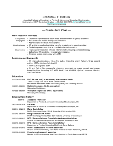 S EBASTIAN F. H OENIG Associate Professor • Department of Physics & Astronomy • University of Southampton Southampton, SO17 1BJ, United Kingdom • +44 (0)23 8059 7370 • [email protected] http://www.sungrazer.org — Curriculum Vitae — Main research interests Extragalactic astrophysics Modeling/theory Observations • Growth of supermassive black holes and connection to galaxy evolution • Active Galactic Nuclei (AGN) and unification • Accretion and feedback mechanisms • 3D and time-resolved radiative transfer simulations in a dusty medium • Radiation pressure on dust and radiation-limited accretion • High-angular resolution infrared interferometry, imaging and spectroscopy • Optical and IR variability / reverberation mapping • Distance scales, cosmology with AGN Academic achievements • 47 refereed publications, 15 as first author (including one in Nature), 12 as second author; 1500+ citations (h-index 23) • 1.9M EUR in grants as PI • PI and CoI of 70+ successful observing proposals on major ground- and spacebased facilities, including VLT, VLTI, Keck, Lick, CHARA, Spitzer, Herschel, Gemini, and GranTeCan Education 11/2004–01/2008 PhD (Dr. rer. nat.) in astronomy summa cum laude Thesis: Clumpy Dust Tori in Active Galactic Nuclei Max-Planck-Institute for Radio Astronomy (MPIfR) and University of Bonn 10/2001–08/2004 Diplom in physics (M.Sc. equivalent) University of Heidelberg 10/1999–09/2001 Vordiplom in physics (B.Sc. equivalent) University of Heidelberg Employment history 03/2016– Associate Professor Department of Physics & Astronomy, University of Southampton, UK 09/2014–02/2016 Lecturer Department of Physics & Astronomy, University of Southampton, UK 03/2014–02/2016 Marie Curie fellow DARK Cosmology Center (DK) & University of Sothampton (UK) 09/2013–08/2014 Independent DARK fellow DARK Cosmology Center, Niels-Bohr-Institute, University of Copenhagen 06/2013–08/2013 DFG (German Science Foundation) reintegration fellow Institute for Theoretical Physics and Astrophysics, University of Kiel 02/2010–05/2013 DFG (German Science Foundation) fellow Department of Physics, University of California Santa Barbara 02/2009–01/2010 Senior postdoctoral research associate Division for IR Interferometry, Max-Planck-Institute for Radio Astronomy (MPIfR) 02/2008–01/2009 Postdoctoral research associate Division for IR Interferometry, Max-Planck-Institute for Radio Astronomy (MPIfR) Sebastian F. Hoenig Curriculum Vitae, Publications, and Observing Record Major awards and distinctions 2015 ERC Starting Grant European Research Council, European Union 2013 Marie Curie fellowship European Commission, European Union 2010 DFG (German Science Foundation) fellowship Department of Physics, University of California Santa Barbara Scientific and teaching grants Scientific grants 2015 ERC Starting Grant DUST-IN-THE-WIND PI S. Hoenig (EUR 1,475,171 / GBP 1,135,000) 2015 STFC New Applicant grant PI S. Hoenig (EUR 46,500 / GBP 35,826) 2014 PhD course teaching grant PI S. Hoenig (DKK 75,000 / EUR 10,000 / GBP 7,600) 2013 Marie Curie fellowship grant (IIF, No. 623804) PI S. Hoenig (EUR 231,000 / GBP 177,000) 2013 DFG (German Science Foundation) reintegration fellowship grant (Ho4368/4-1) PI S. Hoenig (EUR 6,400 / USD 4,920) 2011–2013 Herschel/JPL research grant (OT1 pgandhi 1) Title: Geometrically-thick buried AGN; Science PI P. Gandhi (USD 52,000 / EUR 45,500 / GBP 35,000) 2010–2014 DFG (German Science Foundation) research grant (Ho4368/2-1) Title: The heart of galaxies in the infrared; PI S. Hoenig (EUR 5,800 / GBP 4,450) 2010–2013 DFG (German Science Foundation) fellowship grant (Ho4368/1-1) PI S. Hoenig (EUR 140,000 / GBP 108,000) Selected recent presentations 2016 2016 2015 2015 2015 2015 2015 2015 2014 Invited Speaker — Observatory Seminar, Observatoire de Strasbourg, France Invited Speaker — Astronomy Seminar, University of Leicester, UK Invited Speaker — Astronomy Seminar, University of Warwick, UK Invited Speaker — Astrophysics Seminar, University of Exeter, UK Invited Speaker — Munich Joint Astronomy Colloquium, MPA/MPE/ESO/TU Munich, Germany Invited Lecturer — VLTI Summer School 2015 (September 6-13), Cologne, Germany Invited Speaker — EWASS (June 22-26) special session, La Laguna, Spain Contributing Speaker — conference “ESO in the 2020s” (January 19-22), Munich, Germany Invited Speaker — ESO conference “High-Angular Resolution 2014” (November 24-28, 2014), Garching, Germany 2014 Invited Key Speaker — COSPAR Scientific Assembly Event “Challenges in the Unified Model of AGN” (August 2-10, 2014), Moscov, Russia 2014 Invited Speaker — EWASS (June 30 - July 4) special session, Geneva, Switzerland Teaching experience 2016 2nd year lab marking & viva sessions University of Southampton, UK 2015 Summer School Lecturer University of Cologne, Germany Level: undergraduate and postgrad students 2014– Academic and personal tutor for 1st to 4th year undergraduate students University of Southampton, UK 2 Sebastian F. Hoenig Curriculum Vitae, Publications, and Observing Record Teaching experience (cont.) 2014 Lecturer & teaching grant PI of graduate course From light to dark — the growing phase of supermassive black holes University of Copenhagen, Denmark Level: undergraduate and postgrad students 2012 Astro 1401 honors section guest lecturer (September 26, 2012) Texas Tech University, Lubbock, TX Topic: Energy production in the sun Level: 1st year science and non-science majors 2009 – 2010 Lecturer of Introduction to IDL (Interactive Data Language) Max-Planck-Institute for Radio Astronomy Level: postgraduate course 2009 Supervisor of Astrophysical Seminar University of Bonn Level: undergraduate course 2002 – 2003 Teaching assistant of Analysis I Department of Mathematics, University of Heidelberg Level: 1st year problem class 2002 Teaching assistant of Analysis II Department of Mathematics, University of Heidelberg Level: 1st yea