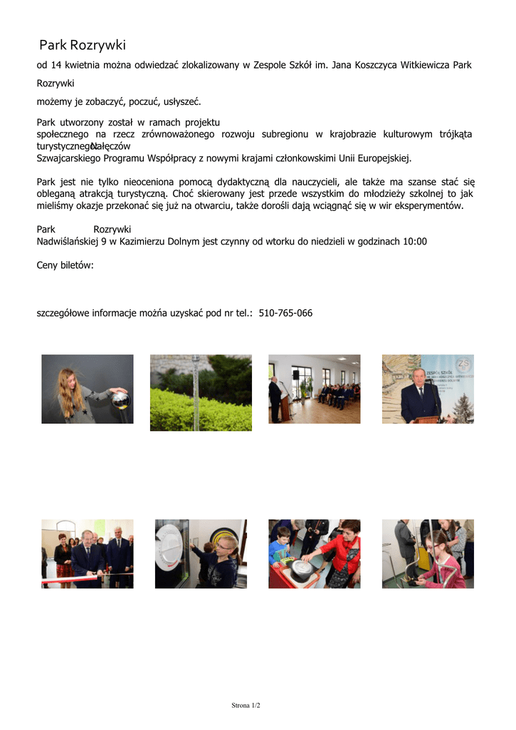 Park Rozrywki od 14 kwietnia można odwiedzać zlokalizowany w Zespole Szkół im. Jana Koszczyca Witkiewicza Park Rozrywki możemy je zobaczyć, poczuć, usłyszeć. Park utworzony został w ramach projektu społecznego na rzecz zrównoważonego rozwoju subregionu w krajobrazie kulturowym trójkąta turystycznego: Nałęczów Szwajcarskiego Programu Współpracy z nowymi krajami członkowskimi Unii Europejskiej. Park jest nie tylko nieoceniona pomocą dydaktyczną dla nauczycieli, ale także ma szanse stać się obleganą atrakcją turystyczną. Choć skierowany jest przede wszystkim do młodzieży szkolnej to jak mieliśmy okazje przekonać się już na otwarciu, także dorośli dają wciągnąć się w wir eksperymentów. Park Rozrywki Nadwiślańskiej 9 w Kazimierzu Dolnym jest czynny od wtorku do niedzieli w godzinach 10:00 Ceny biletów: szczegółowe informacje możńa uzyskać pod nr tel.: 510-765-066 Strona 1/2 Strona 2/2 Powered by TCPDF (www.tcpdf.org)