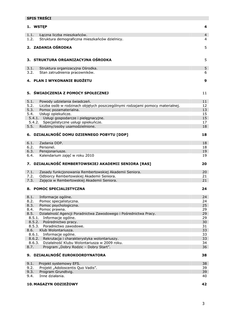 SPIS TREŚCI 1. WSTĘP 4 1.1. 1.2. 4 4 Łączna liczba mieszkańców. Struktura demograficzna mieszkańców dzielnicy. 2. ZADANIA OŚRODKA 5 3. STRUKTURA ORGANIZACYJNA OŚRODKA 5 3.1. 3.2. 5 6 Struktura organizacyjna Ośrodka. Stan zatrudnienia pracowników. 4. PLAN I WYKONANIE BUDŻETU 9 5. ŚWIADCZENIA Z POMOCY SPOŁECZNEJ 11 5.1. Powody udzielania świadczeń. 5.2. Liczba osób w rodzinach objętych poszczególnymi rodzajami pomocy materialnej. 5.3. Pomoc pozamaterialna. 5.4. Usługi opiekuńcze. 5.4.1. Usługi gospodarcze i pielęgnacyjne. 5.4.2. Specjalistyczne usługi opiekuńcze. 5.5. Rodziny/osoby usamodzielnione. 11 12 13 15 15 17 18 6. DZIAŁALNOŚĆ DOMU DZIENNEGO POBYTU [DDP] 18 6.1. 6.2. 6.3. 6.4. 18 18 19 19 Zadania DDP. Personel. Pensjonariusze. Kalendarium zajęć w roku 2010 7. DZIAŁALNOŚĆ REMBERTOWSKIEJ AKADEMII SENIORA [RAS] 20 7.1. 7.2. 7.3. 20 21 21 Zasady funkcjonowania Rembertowskiej Akademii Seniora. Odbiorcy Rembertowskiej Akademii Seniora. Zajęcia w Rembertowskiej Akademii Seniora. 8. POMOC SPECJALISTYCZNA 24 8.1. Informacje ogólne. 8.2. Pomoc specjalistyczna. 8.3. Pomoc psychologiczna. 8.4. Pomoc prawna. 8.5. Działalność Agencji Poradnictwa Zawodowego i Pośrednictwa Pracy. 8.5.1. Informacje ogólne. 8.5.2. Pośrednictwo pracy. 8.5.3. Poradnictwo zawodowe. 8.6. Klub Wolontariusza. 8.6.1. Informacje ogólne. 8.6.2. Rekrutacja i charakterystyka wolontariuszy. 8.6.3. Działalność Klubu Wolontariusza w 2009 roku. 8.7. Program „Dobry Rodzic – Dobry Start”. 24 24 25 29 29 29 30 31 33 33 33 34 36 9. DZIAŁALNOŚĆ EUROKOORDYNATORA 38 9.1. 9.2. 9.3. 9.4. 38 39 39 40 Projekt systemowy EFS. Projekt „Adoloscentis Quo Vadis”. Program Grundtvig. Inne działania. 10. MAGAZYN ODZIEŻOWY 42 3