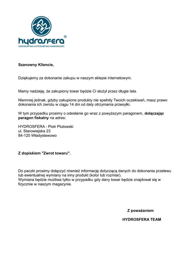 Szanowny Kliencie, Dziękujemy za dokonanie zakupu w naszym sklepie internetowym. Mamy nadzieję, że zakupiony towar będzie Ci służył przez długie lata. Niemniej jednak, gdyby zakupione produkty nie spełniły Twoich oczekiwań, masz prawo dokonania ich zwrotu w ciągu 14 dni od daty otrzymania przesyłki. W tym przypadku prosimy o odesłanie go wraz z powyższym paragonem, dołączając paragon fiskalny na adres: HYDROSFERA - Piotr Plutowski ul. Starowiejska 23 84-120 Władysławowo Z dopiskiem "Zwrot towaru". Do paczki prosimy dołączyć również informację dotyczącą danych do dokonania przelewu lub ewentualnej wymiany na inny produkt (kolor lub rozmiar). Wymiana będzie możliwa tylko w przypadku gdy dany towar będzie znajdował się w fizycznie w naszym magazynie. Z poważaniem HYDROSFERA TEAM Imię, Nazwisko, Adres i Telefon Klienta ................................................. ................................................. ................................................. ................................................. ........................., dn..............….....r. HYDROSFERA ul. Niepodległości 9e/2 83-110 Tczew Formularz zwrotu/wymiany towaru (niepotrzebne skreślić) Oświadczam, że zgodnie z art. 27 ustawy z dnia 30 maja 2014 r. o ochronie niektórych praw konsumentów oraz o odpowiedzialności za szkodę wyrządzoną przez produkt niebezpieczny (Dz.U. 2014., poz. 827) odstępuję od umowy nr. ..................................................... zawartej dnia ............................................................... dotyczącej zakupu towaru: ................................................................................................................................................ ................................................................................................................................................ Zwracam towar, ponieważ: …………………....................................................................................................................... ................................................................................................................................................ ................................................................................................................................................ otrzymany dnia ....................................................................................................................... Proszę o zwrot kwoty ..........................zł (słownie: ...............................................................) Proszę o wymianę na …......................................................................................................... Numer konta oraz adres do zwrotu Imię i Nazwisko....................................................................................................................... Ulica........................................................................................................................................ Kod pocztowy....................Miasto........................................................................................... Razem z odsyłanym towarem wysyłam wypełniony niniejszy formularz oraz paragon fiskalny. ........................................ podpis klienta