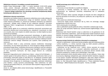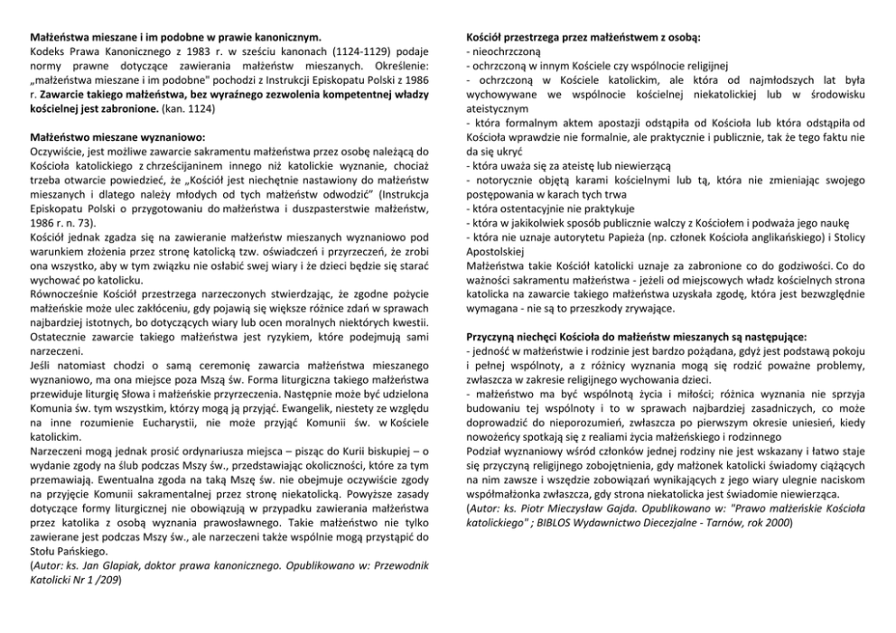 Małżeństwa mieszane i im podobne w prawie kanonicznym. Kodeks Prawa Kanonicznego z 1983 r. w sześciu kanonach (1124-1129) podaje normy prawne dotyczące zawierania małżeństw mieszanych. Określenie: „małżeństwa mieszane i im podobne" pochodzi z Instrukcji Episkopatu Polski z 1986 r. Zawarcie takiego małżeństwa, bez wyraźnego zezwolenia kompetentnej władzy kościelnej jest zabronione. (kan. 1124) Małżeństwo mieszane wyznaniowo: Oczywiście, jest możliwe zawarcie sakramentu małżeństwa przez osobę należącą do Kościoła katolickiego z chrześcijaninem innego niż katolickie wyznanie, chociaż trzeba otwarcie powiedzieć, że „Kościół jest niechętnie nastawiony do małżeństw mieszanych i dlatego należy młodych od tych małżeństw odwodzić” (Instrukcja Episkopatu Polski o przygotowaniu do małżeństwa i duszpasterstwie małżeństw, 1986 r. n. 73). Kościół jednak zgadza się na zawieranie małżeństw mieszanych wyznaniowo pod warunkiem złożenia przez stronę katolicką tzw. oświadczeń i przyrzeczeń, że zrobi ona wszystko, aby w tym związku nie osłabić swej wiary i że dzieci będzie się starać wychować po katolicku. Równocześnie Kościół przestrzega narzeczonych stwierdzając, że zgodne pożycie małżeńskie może ulec zakłóceniu, gdy pojawią się większe różnice zdań w sprawach najbardziej istotnych, bo dotyczących wiary lub ocen moralnych niektórych kwestii. Ostatecznie zawarcie takiego małżeństwa jest ryzykiem, które podejmują sami narzeczeni. Jeśli natomiast chodzi o samą ceremonię zawarcia małżeństwa mieszanego wyznaniowo, ma ona miejsce poza Mszą św. Forma liturgiczna takiego małżeństwa przewiduje liturgię Słowa i małżeńskie przyrzeczenia. Następnie może być udzielona Komunia św. tym wszystkim, którzy mogą ją przyjąć. Ewangelik, niestety ze względu na inne rozumienie Eucharystii, nie może przyjąć Komunii św. w Kościele katolickim. Narzeczeni mogą jednak prosić ordynariusza miejsca – pisząc do Kurii biskupiej – o wydanie zgody na ślub podczas Mszy św., przedstawiając okoliczności, które za tym przemawiają. Ewentualna zgoda na taką Mszę św. nie obejmuje oczywiście zgody na przyjęcie Komunii sakramentalnej przez stronę niekatolicką. Powyższe zasady dotyczące formy liturgicznej nie obowiązują w przypadku zawierania małżeństwa przez katolika z osobą wyznania prawosławnego. Takie małżeństwo nie tylko zawierane jest podczas Mszy św., ale narzeczeni także wspólnie mogą przystąpić do Stołu Pańskiego. (Autor: ks. Jan Glapiak, doktor prawa kanonicznego. Opublikowano w: Przewodnik Katolicki Nr 1 /209) Kościół przestrzega przez małżeństwem z osobą: - nieochrzczoną - ochrzczoną w innym Kościele czy wspólnocie religijnej - ochrzczoną w Kościele katolickim, ale która od najmłodszych lat była wychowywane we wspólnocie kościelnej niekatolickiej lub w środowisku ateistycznym - która formalnym aktem apostazji odstąpiła od Kościoła lub która odstąpiła od Kościoła wprawdzie nie formalnie, ale praktycznie i publicznie, tak że tego faktu nie da się ukryć - która uważa się za ateistę lub niewierzącą - notorycznie objętą karami kościelnymi lub tą, która nie zmieniając swojego postępowania w karach tych trwa - która ostentacyjnie nie praktykuje - która w jakikolwiek sposób publicznie walczy z Kościołem i podważa jego naukę - która nie uznaje autorytetu Papieża (np. członek Kościoła anglikańskiego) i Stolicy Apostolskiej Małżeństwa takie Kościół katolicki uznaje za zabronione co do godziwości. Co do ważności sakramentu małżeństwa - jeżeli od miejscowych władz kościelnych strona katolicka na zawarcie takiego małżeństwa uzyskała zgodę, która jest bezwzględnie wymagana - nie są to przeszkody zrywające. Przyczyną niechęci Kościoła do małżeństw mieszanych są następujące: - jedność w małżeństwie i rodzinie jest bardzo pożądana, gdyż jest podstawą pokoju i pełnej wspólnoty, a z różnicy wyznania mogą się rodzić poważne problemy, zwłaszcza w zakresie religijnego wychowania dzieci. - małżeństwo ma być wspólnotą życia i miłości; różnica wyznania nie sprzyja budowaniu tej wspólnoty i to w sprawach najbardziej zasadniczych, co może doprowadzić do nieporozumień, zwłaszcza po pierwszym okresie uniesień, kiedy nowożeńcy spotkają się z realiami życia małżeńskiego i rodzinnego Podział wyznaniowy wśród członków jednej rodziny nie jest wskazany i łatwo staje się przyczyną religijnego zobojętnienia, gdy małżonek katolicki świadomy ciążących na nim zawsze i wszędzie zobowiązań wynikających z jego wiary ulegnie naciskom współmałżonka zwłaszcza, gdy strona niekatolicka jest świadomie niewierząca. (Autor: ks. Piotr Mieczysław Gajda. Opublikowano w: "Prawo małżeńskie Kościoła katolickiego" ; BIBLOS Wydawnictwo Diecezjalne - Tarnów, rok 2000)