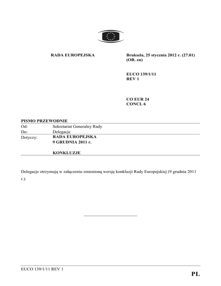 RADA EUROPEJSKA Bruksela, 25 stycznia 2012 r. (27.01) (OR. en) EUCO 139/1/11 REV 1 CO EUR 24 CONCL 6 PISMO PRZEWODNIE Od: Sekretariat Generalny Rady Do: Delegacje RADA EUROPEJSKA Dotyczy: 9 GRUDNIA 2011 r. KONKLUZJE Delegacje otrzymują w załączeniu zmienioną wersję konkluzji Rady Europejskiej (9 grudnia 2011 r.). ________________________ EUCO 139/1/11 REV 1 PL Konkluzje - 9 grudnia 2011 r. W ostatnich 18 miesiącach wiele zostało osiągnięte na rzecz poprawy naszego zarządzania gospodarczego i przezwycięŜenia kryzysu gospodarczego i finansowego. Podjęliśmy waŜne decyzje – przedstawione w niniejszych konkluzjach – które muszą zostać szybko i zdecydowanie wdroŜone. Uzgodniliśmy, Ŝe priorytet naleŜy nadać tym środkom, które mają największy potencjał pobudzenia wzrostu gospodarczego i tworzenia miejsc pracy. Państwa członkowskie uczestniczące w pakcie euro plus uzgodniły podjęcie bardziej konkretnych i wymiernych zobowiązań, a w szczególności przyspieszenie prac dotyczących zatrudnienia. Wyznaczyliśmy kierunki dalszego rozwoju polityki energetycznej, jeŜeli chodzi o ukończenie tworzenia rynku wewnętrznego, zwiększenie efektywności energetycznej, rozwijanie infrastruktury, zapewnienie spójności w unijnych stosunkach zewnętrznych oraz zwiększenie bezpieczeństwa jądrowego i ochrony instalacji jądrowych. Ponadto Rada Europejska z zadowoleniem przyjęła podpisanie z Chorwacją traktatu o przystąpieniu i podjęła decyzje w sprawie procesu rozszerzenia UE w odniesieniu do Serbii i Czarnogóry. ° ° ° I. POLITYKA GOSPODARCZA 1. Zdając sobie sprawę z pogarszającej się sytuacji gospodarczej i finansowej, Rada Europejska omówiła bieŜące wysiłki na rzecz wyprowadzenia Europy z kryzysu. Nowe zasady zarządzania gospodarczego w Unii Europejskiej, określone w punkcie 3, muszą zostać w pełni wdroŜone, tak aby zbudować zaufanie do silnej europejskiej gospodarki. Reformy strukturalne i działania na rzecz konsolidacji fiskalnej muszą być kontynuowane, tak aby stworzyć podstawy powrotu do trwałego wzrostu gospodarczego i tym samym pomóc zwiększyć zaufanie w krótkiej perspektywie. Potrzebne są takŜe środki, które pomogą przywrócić normalną akcję poŜyczkową dla gospodarki, unikając jednocześnie nadmiernego ryzyka i nadmiernego delewarowania, zgodnie z ustaleniami z 26 października 2011 r. 2. Rada Europejska, przywołując kluczowe obszary priorytetowe słuŜące wzrostowi gospodarczemu, które zdefiniowała w październiku 2011 r. – w szczególności Akt o jednolitym rynku, jednolity rynek cyfrowy oraz zmniejszenie obciąŜenia regulacyjnego dla MŚP i mikroprzedsiębiorstw – podkreśliła potrzebę szybkiego przyjęcia środków, które mają największy potencjał pobudzenia wzrostu gospodarczego i tworzenia miejsc pracy. Popiera zatem ideę programu pilnych działań oraz zwraca się do Rady i Parlamentu Europejskiego, aby nadały szczególny priorytet szybkiemu przeanalizowaniu tych propozycji, które m.in. w rocznej analizie wzrostu gospodarczego Komisja oceniła jako mające znaczny potencjał pobudzenia wzrostu gospodarczego. Zatwierdza działania zaproponowane przez Komisję w sprawozdaniu na temat minimalizowania obciąŜeń regulacyjnych dotyczących MŚP. EUCO 139/1/11 REV 1 1 PL Konkluzje - 9 grudnia 2011 r. 3. Roczna analiza wzrostu gospodarczego na rok 2012 stanowi doskonałą podstawę inauguracji kolejnego europejskiego semestru – pierwszego, który będzie realizowany w ramach niedawno wzmocnionego zarządzania gospodarczego, w tym nowej procedury monitorowania i korygowania zakłóceń równowagi makroekonomicznej. Rada Europejska oceni na wiosennym posiedzeniu postępy i przyjmie konieczne wskazówki. W centrum uwagi powinna się pilnie znaleźć realizacja, zwłaszcza wobec faktu, Ŝe postępy odnotowane w tym roku w realizacji celów wyznaczonych w strategii „Europa 2020” i zaleceń dla poszczególnych krajów są nierównomierne. ° ° 4. ° Szefowie państw lub rządów państw członkowskich uczestniczących w pakcie euro plus dokonali przeglądu postępów realizacji swoich zobowiązań na szczeblu krajowym. Zgodzili się co do potrzeby przeprowadzenia w marcu 2012 r. dogłębniejszej oceny krajowych starań słuŜących realizacji celów paktu. Uzgodnili takŜe, Ŝe podejmą bardziej konkretne i wymierne zobowiązania w kaŜdym z obszarów objętych tym paktem oraz Ŝe w krajowych programach reform zdadzą sprawę z postępów w tym zakresie. Nowe zarządzanie gospodarcze trzeba uzupełnić usprawnionym monitorowaniem polityki zatrudnienia i polityki społecznej, w szczególności w aspektach mogących mieć wpływ na stabilność makroekonomiczną i wzrost gospodarczy, zgodnie z konkluzjami Rady z 1 grudnia. 5. W oparciu o informacje zawarte w sprawozdaniu przewodniczącego Rady (EPSCO) i w rocznej analizie wzrostu gospodarczego szefowie państw lub rządów przeprowadzili wstępną wymianę poglądów na temat najlepszych praktyk w zakresie swoich polityk zatrudnienia i zgodzili się co do szczególnej potrzeby, by w pełni mobilizować rynek pracy na rzecz wzrostu gospodarczego. Reformy strukturalne muszą być energicznie kontynuowane, jednak pilnie potrzebne są równieŜ ukierunkowane środki – zarówno na szczeblu krajowym, jak i europejskim – dotyczące grup znajdujących się w najtrudniejszej sytuacji, w szczególności młodych bezrobotnych. Intensywniejszym politykom aktywizacji powinny towarzyszyć starania słuŜące podnoszeniu kwalifikacji, zwłaszcza poprzez dostosowywanie systemów edukacji i szkolenia do potrzeb rynku pracy. Promowanie moŜliwości zatrudnienia i moŜliwości biznesowych dla osób wchodzących na rynek pracy, a takŜe przeanalizowanie nowych wywaŜonych polityk w zakresie modelu flexicurity mogłyby znacznie przyczynić się do poprawienia perspektyw młodzieŜy na rynku pracy. EUCO 139/1/11 REV 1 2 PL Konkluzje - 9 grudnia 2011 r. 6. Z zadowol