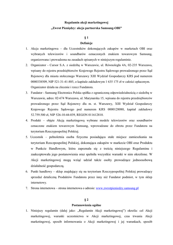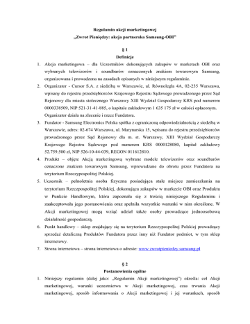 Regulamin akcji marketingowej „Zwrot Pieniędzy: akcja partnerska Samsung-OBI” §1 Definicje 1. Akcja marketingowa – dla Uczestników dokonujących zakupów w marketach OBI oraz wybranych telewizorów i soundbarów oznaczonych znakiem towarowym Samsung, organizowana i prowadzona na zasadach opisanych w niniejszym regulaminie. 2. Organizator - Cursor S.A. z siedzibą w Warszawie, ul. Równoległa 4A, 02-235 Warszawa, wpisany do rejestru przedsiębiorców Krajowego Rejestru Sądowego prowadzonego przez Sąd Rejonowy dla miasta stołecznego Warszawy XIII Wydział Gospodarczy KRS pod numerem 0000338509, NIP 521-31-41-885, o kapitale zakładowym 1 635 175 zł w całości opłaconym. Organizator działa na zlecenie i rzecz Fundatora. 3. Fundator - Samsung Electronics Polska spółka z ograniczoną odpowiedzialnością z siedzibą w Warszawie, adres: 02-674 Warszawa, ul. Marynarska 15, wpisana do rejestru przedsiębiorców prowadzonego przez Sąd Rejonowy dla m. st. Warszawy, XIII Wydział Gospodarczy Krajowego Rejestru Sądowego pod numerem KRS 0000128080, kapitał zakładowy 52.759.500 zł, NIP 526-10-44-039, REGON 011612810. 4. Produkt – objęte Akcją marketingową wybrane modele telewizorów oraz soundbarów oznaczone znakiem towarowym Samsung, wprowadzane do obrotu przez Fundatora na terytorium Rzeczypospolitej Polskiej. 5. Uczestnik – pełnoletnia osoba fizyczna posiadająca stałe miejsce zamieszkania na terytorium Rzeczpospolitej Polskiej, dokonująca zakupów w markecie OBI oraz Produktu w Punkcie Handlowym, która zapoznała się z treścią niniejszego Regulaminu i zaakceptowała jego postanowienia oraz spełniła wszystkie warunki w nim określone. W Akcji marketingowej mogą wziąć udział także osoby prowadzące jednoosobową działalność gospodarczą. 6. Punkt handlowy – sklep znajdujący się na terytorium Rzeczypospolitej Polskiej prowadzący sprzedaż detaliczną Produktów Fundatora przez inny niż Fundator podmiot, w tym sklep internetowy. 7. Strona internetowa – strona internetowa o adresie: www.zwrotpieniedzy.samsung.pl §2 Postanowienia ogólne 1. Niniejszy regulamin (dalej jako: „Regulamin Akcji marketingowej”) określa: cel Akcji marketingowej, warunki uczestnictwa w Akcji marketingowej, czas trwania Akcji marketingowej, sposób informowania o Akcji marketingowej i jej warunkach, sposób składania skarg i wniosków związanych z Akcją marketingową. 2. Celem Akcji marketingowej jest promocja Produktów zgodnie z załącznikiem nr 1 do Regulaminu Akcji marketingowej. 3. Akcja marketingowa prowadzona jest na terytorium Rzeczypospolitej Polskiej w marketach OBI i w wybranych Punktach handlowych w okresie od dnia 10 lipca 2015 r., godz. 00:01 do dnia 3 września 2015 r., godz. 23:59:59 (data dokonania zakupu Produktu w Akcji marketingowej - decyduje data i godzina wysłania zamówienia na serwer sklepu internetowego lub dokonania zakupu w sklepie stacjonarnym) lub do wyczerpania puli przeznaczonej na zwroty. 4. Akcja marketingową obejmuje wyłącznie Produkty wskazane w załączniku nr 1 do Regulaminu Akcji marketingowej. 5. W Akcji marketingowej nie mogą uczestniczyć osoby będące pracownikami Organizatora oraz Fundatora, a także członkowie rodzin tych pracowników. Za członków rodziny uznaje się małżonka, wstępnych, zstępnych, rodzeństwo oraz osoby pozostające w stosunku przysposobienia. 6. Akcja marketingowa nie łączy się z innymi promocjami ogłaszanymi przez Organizatora i Fundatora. §3 Zasady uczestnictwa w Akcji marketingowej 1. Warunkiem wzięcia udziału w Akcji marketingowej jest łączne spełnienie następujących warunków: a) dokonanie przez Uczestnika zakupów w markecie OBI, objętych jednym dowodem sprzedaży, na kwotę nie niższą niż 500,00 zł brutto w okresie trwania Akcji marketingowej, b) dokonanie przez Uczestnika zakupu Produktu w okresie trwania Akcji marketingowej. 2. Zgłoszenie udziału Uczestnika w Akcji marketingowej następuje za pośrednictwem Strony internetowej i polega na przesłaniu w terminie nie później niż do 15 września 2015 r. do godziny 23:59:59.w prawidłowo wypełnionego formularza zgłoszenia wraz z: a) odpowiednim kodem znajdującym się na paragonie potwierdzającym realizację zakupów w markecie OBI (kod znajduje się na froncie dowodu zakupu i składa się z 20 znaków) b) dołączonym skanem dowodu zakupu potwierdzającym dokonanie zakupu Produktu w Punkcie handlowym, zawierającym pełną nazwę Produktu, z zastrzeżeniem, że data i godzina zakupu Produktu, widniejąca na skanie dołączonego dowodu zakupu Produktu nie może być późniejsza niż data rejestracji formularza zgłoszeniowego za pośrednictwem Strony internetowej. 3. Prawidłowo wypełniony formularz powinien zawierać; a) dane osobowe Uczestnika tj. imię, nazwisko, adres; b) numer konta bankowego; c) adres e-mail; d) numer telefonu; e) kod oraz datę zakupu z dowodu zakupu w markecie OBI; f) model oraz datę zakupu nabytego Produktu Fundatora; 4. W oparciu o dane podane przez Uczestnika w zgłoszeniu wraz z potwierdzeniem dokonanych zakupów, Organizator dokonuje weryfikacji prawidłowości wszystkich zgłoszeń. Zgłoszenia wysłane po terminie, nieprawidłowe, niekompletne, niezgodne z niniejszym Regulaminem Akcji marketingowej, zawierające nieprawdziwe dane lub zawierające nieczytelne skany dowodów zakupów, nie uprawniają do udziału w Akcji marketingowej. Organizatorowi przysługuje prawo żądania okazania oryginału dokumentu potwierdzającego zakup Produktu, a także możliwość dodatkowej weryfikacji zgłoszeń. 5. Z tytułu prawidłowego zgłoszenia udziału w Akcji marketingowej potwierdzającego dokonanie zakupów na zasadach określonych w pkt.1 powyżej, Uczestnik może uzyskać zwrot w wysokości: 50, 00 zł brutto (słownie: pięćdziesiąt), 100,00 zł brutto (słownie: sto), 200,00 zł brutto (słownie: dwieście) lub 400,00 zł brutto (słownie: czterysta) - w zależności od model