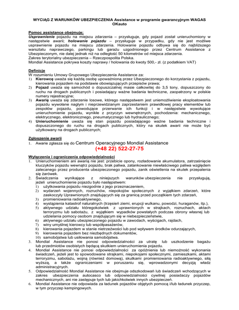 WYCIĄG Z WARUNKÓW UBEZPIECZENIA Assistance w programie gwarancyjnym WAGAS OKauto Pomoc assistance obejmuje; Usprawnienie pojazdu na miejscu zdarzenia – przysługuje, gdy pojazd został unieruchomiony w następstwie awarii; holowanie pojazdu – przysługuje w przypadku, gdy nie jest możliwe usprawnienie pojazdu na miejscu zdarzenia. Holowanie pojazdu odbywa się do najbliższego warsztatu naprawczego, parkingu lub garażu uzgodnionego przez Centrum Assistance z Ubezpieczonym, nie dalej jednak niż na odległość 50 kilometrów od miejsca zdarzenia. Zakres terytorialny ubezpieczenia – Rzeczpospolita Polska. Mondial Assistance pokrywa koszty naprawy / holowania do kwoty 500,- zł. (z podatkiem VAT) Definicje W rozumieniu Umowy Grupowego Ubezpieczenia Assistance za: 1) Kierowcę uważa się każdą osobę upoważnioną przez Ubezpieczonego do korzystania z pojazdu, kierowania pojazdem na podstawie obowiązujących przepisów prawa; 2) Pojazd uważa się samochód o dopuszczalnej masie całkowitej do 3,5 tony, dopuszczony do ruchu na drogach publicznych i posiadający ważne badania techniczne, zaopatrzony w polskie numery rejestracyjne; 3) Awarię uważa się zdarzenie losowe, którego następstwem jest uniemożliwienie eksploatowania pojazdu wywołane nagłym i nieprzewidzianym zaprzestaniem prawidłowej pracy elementów lub zespołów pojazdu, powodujące przerwanie ich funkcji i w następstwie wywołujące unieruchomienie pojazdu, wynikłe z przyczyn wewnętrznych, pochodzenia: mechanicznego, elektrycznego, elektronicznego, pneumatycznego lub hydraulicznego; 4) Unieruchomienie uważa się stan pojazdu posiadającego ważne badania techniczne i dopuszczonego do ruchu na drogach publicznych, który na skutek awarii nie może być użytkowany na drogach publicznych; Zgłoszenie awarii 1. Awarie zgłasza się do Centrum Operacyjnego Mondial Assistance (+48 22) 522-27-75 Wyłączenia i ograniczenia odpowiedzialności 1. Unieruchomieniem ani awarią nie jest: przebicie opony, rozładowanie akumulatora, zatrzaśnięcie kluczyków pojazdu wewnątrz pojazdu, brak paliwa, zatankowanie niewłaściwego paliwa względem zalecanego przez producenta ubezpieczonego pojazdu, zanik oświetlenia na skutek przepalenia się żarówek. 2. Świadczenia wynikające z niniejszych warunków ubezpieczenia nie przysługują, jeżeli unieruchomienie pojazdu było następstwem: 1) użytkowania pojazdu niezgodnie z jego przeznaczeniem, 2) wydarzeń wojennych, rozruchów, niepokojów społecznych z wyjątkiem zdarzeń, które zaskoczyły Uprawnionych znajdujących się za granicą przed początkiem tych zdarzeń, 3) promieniowania radioaktywnego, 4) wystąpienia katastrof naturalnych (trzęsień ziemi, erupcji wulkanu, powodzi, huraganów, itp.), 5) aktywnego udziału któregokolwiek z uprawnionych w strajkach, rozruchach, aktach terroryzmu lub sabotażu, z wyjątkiem wypadków powstałych podczas obrony własnej lub udzielania pomocy osobom znajdującym się w niebezpieczeństwie, 6) aktywnego udziału ubezpieczonego pojazdu w zawodach, wyścigach, rajdach, 7) winy umyślnej kierowcy lub współpasażerów, 8) kierowania pojazdem w stanie nietrzeźwości lub pod wpływem środków odurzających, 9) kierowania pojazdem bez niezbędnych dokumentów, 10) samobójstwa lub usiłowania samobójstwa. 3. Mondial Assistance nie ponosi odpowiedzialności za utratę lub uszkodzenie bagażu lub przedmiotów osobistych będącą skutkiem unieruchomienia pojazdu. 4. Mondial Assistance nie ponosi odpowiedzialności za opóźnienia lub niemożność wykonania świadczeń, jeżeli jest to spowodowane strajkami, niepokojami społecznymi, zamieszkami, aktami terroryzmu, sabotażu, wojną (również domową), skutkami promieniowania radioaktywnego, siłą wyższą, a także ograniczeniami w poruszaniu się, wprowadzonymi decyzją władz administracyjnych. 5. Odpowiedzialność Mondial Assistance nie obejmuje odszkodowań lub świadczeń wchodzących w zakres ubezpieczenia autocasco lub odpowiedzialności cywilnej posiadaczy pojazdów mechanicznych, ani nie zastępuje tych lub jakichkolwiek innych ubezpieczeń. 6. Mondial Assistance nie odpowiada za ładunek pojazdów objętych pomocą i/lub ładunek przyczep, w tym przyczep kempingowych.
