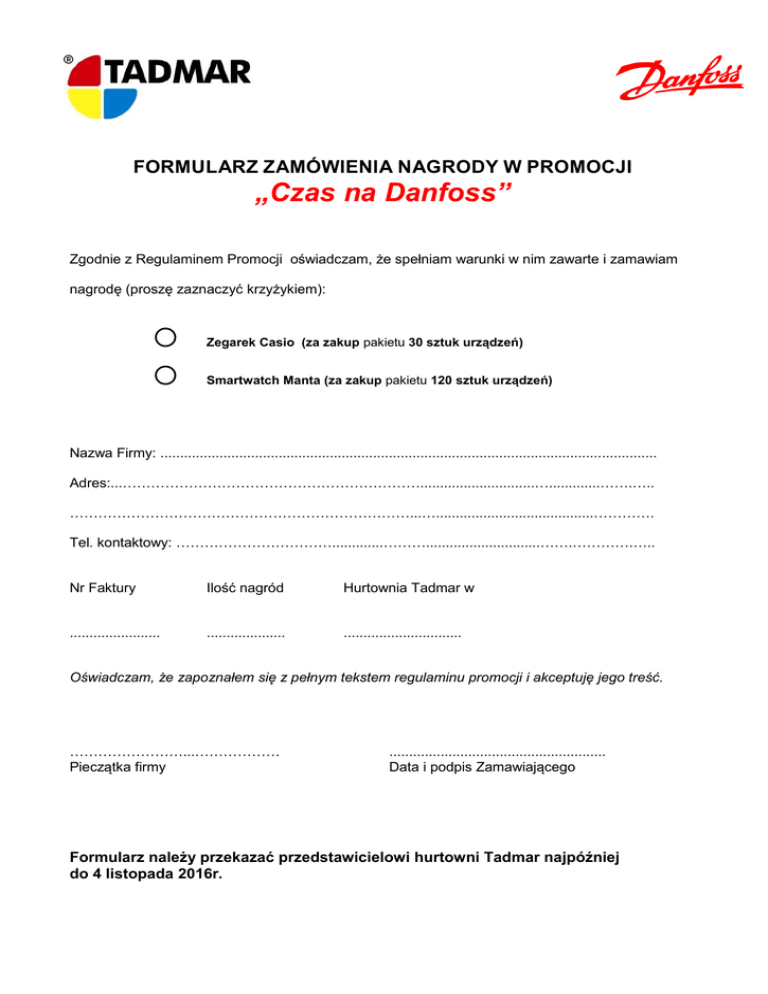 FORMULARZ ZAMÓWIENIA NAGRODY W PROMOCJI „Czas na Danfoss” Zgodnie z Regulaminem Promocji oświadczam, że spełniam warunki w nim zawarte i zamawiam nagrodę (proszę zaznaczyć krzyżykiem): o o Zegarek Casio (za zakup pakietu 30 sztuk urządzeń) Smartwatch Manta (za zakup pakietu 120 sztuk urządzeń) Nazwa Firmy: .............................................................................................................................. Adres:...……………………………………………………….............................….............…….….. ………………………………………………………………...…........................................…………. Tel. kontaktowy: …………………………….............……….............................…….………….….. Nr Faktury Ilość nagród Hurtownia Tadmar w ....................... .................... .............................. Oświadczam, że zapoznałem się z pełnym tekstem regulaminu promocji i akceptuję jego treść. ……………………...……………… Pieczątka firmy ....................................................... Data i podpis Zamawiającego Formularz należy przekazać przedstawicielowi hurtowni Tadmar najpóźniej do 4 listopada 2016r.