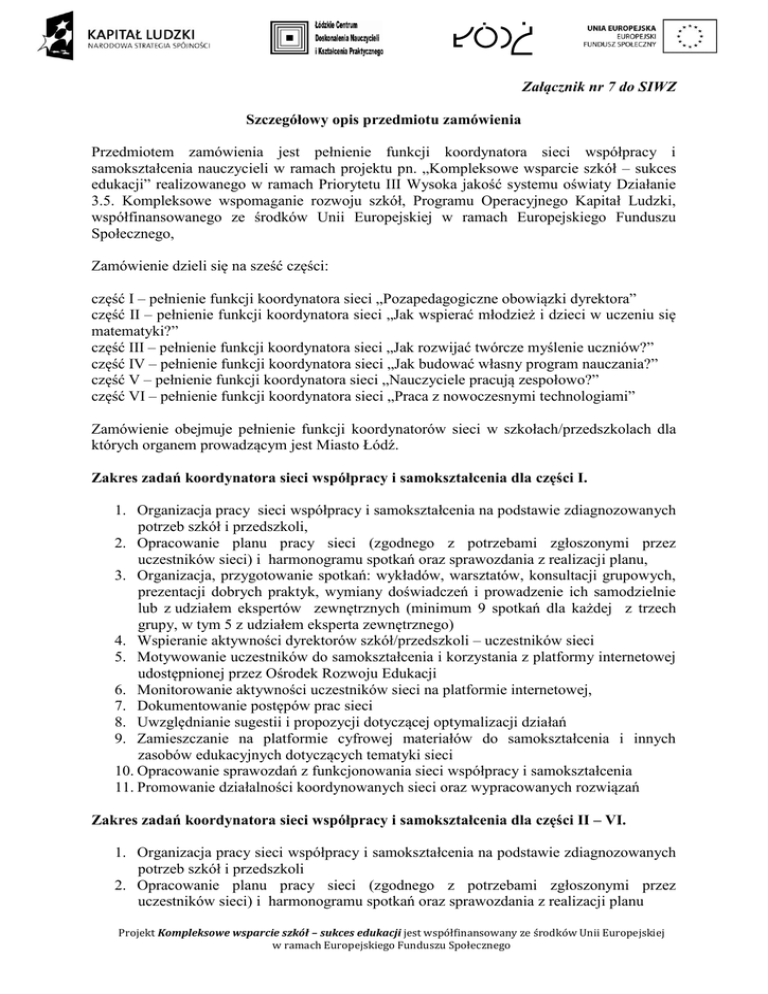 Załącznik nr 7 do SIWZ Szczegółowy opis przedmiotu zamówienia Przedmiotem zamówienia jest pełnienie funkcji koordynatora sieci współpracy i samokształcenia nauczycieli w ramach projektu pn. „Kompleksowe wsparcie szkół – sukces edukacji” realizowanego w ramach Priorytetu III Wysoka jakość systemu oświaty Działanie 3.5. Kompleksowe wspomaganie rozwoju szkół, Programu Operacyjnego Kapitał Ludzki, współfinansowanego ze środków Unii Europejskiej w ramach Europejskiego Funduszu Społecznego, Zamówienie dzieli się na sześć części: część I – pełnienie funkcji koordynatora sieci „Pozapedagogiczne obowiązki dyrektora” część II – pełnienie funkcji koordynatora sieci „Jak wspierać młodzież i dzieci w uczeniu się matematyki?” część III – pełnienie funkcji koordynatora sieci „Jak rozwijać twórcze myślenie uczniów?” część IV – pełnienie funkcji koordynatora sieci „Jak budować własny program nauczania?” część V – pełnienie funkcji koordynatora sieci „Nauczyciele pracują zespołowo?” część VI – pełnienie funkcji koordynatora sieci „Praca z nowoczesnymi technologiami” Zamówienie obejmuje pełnienie funkcji koordynatorów sieci w szkołach/przedszkolach dla których organem prowadzącym jest Miasto Łódź. Zakres zadań koordynatora sieci współpracy i samokształcenia dla części I. 1. Organizacja pracy sieci współpracy i samokształcenia na podstawie zdiagnozowanych potrzeb szkół i przedszkoli, 2. Opracowanie planu pracy sieci (zgodnego z potrzebami zgłoszonymi przez uczestników sieci) i harmonogramu spotkań oraz sprawozdania z realizacji planu, 3. Organizacja, przygotowanie spotkań: wykładów, warsztatów, konsultacji grupowych, prezentacji dobrych praktyk, wymiany doświadczeń i prowadzenie ich samodzielnie lub z udziałem ekspertów zewnętrznych (minimum 9 spotkań dla każdej z trzech grupy, w tym 5 z udziałem eksperta zewnętrznego) 4. Wspieranie aktywności dyrektorów szkół/przedszkoli – uczestników sieci 5. Motywowanie uczestników do samokształcenia i korzystania z platformy internetowej udostępnionej przez Ośrodek Rozwoju Edukacji 6. Monitorowanie aktywności uczestników sieci na platformie internetowej, 7. Dokumentowanie postępów prac sieci 8. Uwzględnianie sugestii i propozycji dotyczącej optymalizacji działań 9. Zamieszczanie na platformie cyfrowej materiałów do samokształcenia i innych zasobów edukacyjnych dotyczących tematyki sieci 10. Opracowanie sprawozdań z funkcjonowania sieci współpracy i samokształcenia 11. Promowanie działalności koordynowanych sieci oraz wypracowanych rozwiązań Zakres zadań koordynatora sieci współpracy i samokształcenia dla części II – VI. 1. Organizacja pracy sieci współpracy i samokształcenia na podstawie zdiagnozowanych potrzeb szkół i przedszkoli 2. Opracowanie planu pracy sieci (zgodnego z potrzebami zgłoszonymi przez uczestników sieci) i harmonogramu spotkań oraz sprawozdania z realizacji planu Projekt Kompleksowe wsparcie szkół – sukces edukacji jest współfinansowany ze środków Unii Europejskiej w ramach Europejskiego Funduszu Społecznego 3. Organizacja, przygotowanie spotkań: wykładów, warsztatów, konsultacji grupowych, lekcji i zajęć modelowych, prezentacji dobrych praktyk, wymiany doświadczeń i prowadzenie ich samodzielnie lub z udziałem ekspertów zewnętrznych (minimum 9 spotkań dla każdej z pięciu grup, w tym 5 z udziałem eksperta zewnętrznego) 4. Wspieranie aktywności nauczycieli szkół/przedszkoli – uczestników sieci 5. Motywowanie uczestników do samokształcenia i korzystania z platformy internetowej udostępnionej przez Ośrodek Rozwoju Edukacji 6. Monitorowanie aktywności nauczycieli-uczestników sieci na platformie internetowej 7. Dokumentowanie postępów prac sieci 8. Uwzględnianie sugestii i propozycji dotyczącej optymalizacji działań 9. Zamieszczanie na platformie cyfrowej materiałów do samokształcenia i innych zasobów edukacyjnych dotyczących tematyki sieci 10. Opracowanie sprawozdań z funkcjonowania sieci współpracy i samokształcenia 11. Promowanie działalności koordynowanych sieci oraz wypracowanych rozwiązań W ramach każdej części zamówienia każdy z koordynatorów sieci zobowiązany będzie do pełnienia obowiązków w wymiarze 80 godzin miesięcznie. W ofercie należy przyjąć, że liczba miesięcy pełnienia funkcji koordynatora wynosi 19. Rozliczenie nastąpi na podstawie liczby miesięcy rzeczywistego pełnienia funkcji koordynatora sieci. Świadczenie usługi odbywać się będzie według wyboru Zamawiającego albo w jego siedzibie albo w szkołach/przedszkolach biorących udział w projekcie. Funkcja koordynatora sieci powinna być pełniona przez osoby wskazane w ofercie Wykonawcy. Zmiana osób wskazanych w ofercie do pełnienia funkcji koordynatora sieci dopuszczalna jest jedynie w przypadku zaistnienia wyjątkowych okoliczności po stronie Wykonawcy jak i Zamawiającego, z zastrzeżeniem, że nowa osoba posiada kwalifikacje i doświadczenie nie mniejsze niż osoba wskazana w ofercie. Zmiana wymaga pisemnej zgody Zamawiającego. Przed rozpoczęciem realizacji umowy, jak i w przypadku zmiany osoby pełniącej funkcję koordynatora sieci Wykonawca zobowiązany jest do przedstawienia dokumentów dotyczących osoby pełniącej funkcję koordynatora sieci potwierdzających jej kwalifikacje oraz doświadczenie. Projekt Kompleksowe wsparcie szkół – sukces edukacji jest współfinansowany ze środków Unii Europejskiej w ramach Europejskiego Funduszu Społecznego