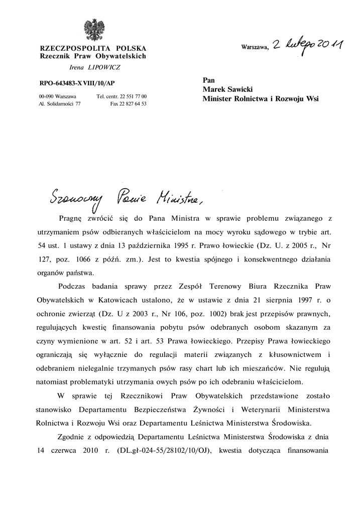 RZECZPOSPOLITA POLSKA Rzecznik Praw Obywatelskich Irena LIPOWICZ Pan Marek Sawicki Minister Rolnictwa i Rozwoju Wsi RPO-643483-X VIII/10/AP 00-090 Warszawa Al. Solidarności 77 Tel. centr. 22 551 77 00 Fax 22 827 64 53 Pragnę zwrócić się do Pana Ministra w sprawie problemu związanego z utrzymaniem psów odbieranych właścicielom na mocy wyroku sądowego w trybie art. 54 ust. 1 ustawy z dnia 13 października 1995 r. Prawo łowieckie (Dz. U. z 2005 r., Nr 127, poz. 1066 z późń. zm.). Jest to kwestia spójnego i konsekwentnego działania organów państwa. Podczas badania sprawy przez Zespół Terenowy Biura Rzecznika Praw Obywatelskich w Katowicach ustalono, że w ustawie z dnia 21 sierpnia 1997 r. o ochronie zwierząt (Dz. U z 2003 r., Nr 106, poz. 1002) brak jest przepisów prawnych, regulujących kwestię finansowania pobytu psów odebranych osobom skazanym za czyny wymienione w art. 52 i art. 53 Prawa łowieckiego. Przepisy Prawa łowieckiego ograniczają się wyłącznie do regulacji materii związanych z kłusownictwem i odebraniem nielegalnie trzymanych psów rasy chart lub ich mieszańców. Nie regulują natomiast problematyki utrzymania owych psów po ich odebraniu właścicielom. W sprawie tej Rzecznikowi Praw Obywatelskich stanowisko Departamentu Bezpieczeństwa Żywności i przedstawione Weterynarii zostało Ministerstwa Rolnictwa i Rozwoju Wsi oraz Departamentu Leśnictwa Ministerstwa Środowiska. Zgodnie z odpowiedzią Departamentu Leśnictwa Ministerstwa Środowiska z dnia 14 czerwca 2010 r. (DL.gł-024-55/28102/10/OJ), kwestia dotycząca finansowania 2 utrzymania tych zwierząt nie może być przedmiotem regulacji ustawy Prawo łowieckie. W odpowiedzi zaznaczono, że oprócz przepisów dotyczących przepadku przedmiotów w szeregu ustaw zawierających przepisy karne, zagadnienie to reguluje kodeks karny. Do tych regulacji pozakodeksowych stosuje się na podstawie art. 116 ustawy konstrukcje prawne z art. 44 k.k. Nadto podniesiono, że orzekanie przepadku przedmiotów służy przede wszystkim realizacji funkcji prewencyjnej, a mianowicie uświadomieniu, zarówno w aspekcie prewencji ogólnej, jak i indywidualnej, nieopłacalności wkraczania na drogę przestępstwa poprzez odebranie uzyskanych z niej "owoców" (przepadek producta sceleris). Na gruncie kodyfikacji karnej z 1997 r. próżno by szukać definicji normatywnej tego pojęcia. Stosownie do art. 45 k.c. rzeczami są bowiem jedynie przedmioty materialne. Analiza przepisów prawnokarnych wskazuje jednak, że przewidują one również orzekanie przepadku przedmiotów niemających "substratu materialnego". Przykładowo, przepadkowi może podlegać program komputerowy lub zwierzę. Uwzględniając powyższe wydaje się uprawnione stanowisko, zgodnie z którym termin "przedmiot" na gruncie art. 44 obejmuje zasadniczo rzeczy, choć nie ogranicza się wyłącznie do nich. Podlegające przepadkowi jako instrumenta sceleris przedmioty nie muszą być wytworzone przez człowieka (np. kamień, gałąź). Mogą być nimi również zwierzęta - art. 54 ust. 1 Prawa łowieckiego przewiduje możliwość orzeczenia przepadku m.in. psów, które służyły do nielegalnego polowania. Reasumując, w udzielonej odpowiedzi Departament Leśnictwa Ministerstwa Środowiska stwierdza, iż ze względu na fakt, że psy są zwierzętami udomowionymi i postępowanie w tym zakresie może regulować ustawa o ochronie zwierząt, kwestie związane z finansowaniem zabezpieczenia dowodów w sprawie, w tym przepadek zwierzęcia np. na rzecz innego podmiotu, o ile rzeczywiście wymagają doprecyzowania regulacji prawnych, to z pewnością nie na gruncie ustawy Prawo łowieckie. Jak wynika natomiast z odpowiedzi udzielonej pismem z dnia 26 kwietnia 2010 r. ŻW sdp/ks-8700-4/2010(1347) przez Departamentu Bezpieczeństwa Żywności i Weterynarii Ministerstwa Rolnictwa i Rozwoju Wsi Minister Rolnictwa i Rozwoju Wsi nie jest właściwym w zakresie składania wyjaśnień w sprawie finansowania utrzymania psów rasy chart lub ich mieszańców odebranych właścicielom na mocy wyroku sądowego w trybie art. 54 ust. 1 Prawa łowieckiego. 3 W wymienionym piśmie wskazano, iż zgodnie z art. 28 ust. 1 ustawy z dnia 4 września 1997 r. o działach administracji rządowej (Dz. U. z 2007 r. Nr 65, poz. 437, z późn. zm.), sprawy łowiectwa, jak również ochrony gatunków zwierząt należą do działu środowisko. Ponadto zgodnie z § 1 ust. 2 pkt 2 rozporządzenia Prezesa Rady Ministrów z dnia 16 listopada 2007 r. w sprawie szczegółowego zakresu działania Ministra Środowiska (Dz. U. Nr 216, poz. 1606), działem administracji rządowej środowisko kieruje Minister Środowiska. W udzielonej odpowiedzi zwrócono uwagę, że właściwość Ministra Środowiska w zakresie interpretacji regulacji zawartych w Prawie łowieckim wynika wprost z art. 6 Prawa łowieckiego zgodnie z którym naczelnym organem administracji rządowej w zakresie łowiectwa jest minister właściwy do spraw środowiska. Mając na uwadze powyższe oraz fakt, że orzeczenie przepadku psów, przy użyciu których dokonano przestępstwa określonego w art. 52 i 53 Prawa łowieckiego następuje na podstawie art. 54 tej ustawy zgodnie ze stanowiskiem Departament Bezpieczeństwa Żywności i Weterynarii Ministerstwa Rolnictwa i Rozwoju Wsi ewentualna regulacja w zakresie finansowania utrzymania psów, wobec których orzeczono przepadek, powinna zostać zamieszczona w ustawie Prawo łowieckie. Ponadto Departament Bezpieczeństwa Żywności i weterynarii Ministerstwa Rolnictwa i Rozwoju Wsi poinformował, że zgodnie z art. 38 ustawy z dnia 21 sierpnia 1997 r. o ochronie zwierząt (Dz. U. z 2003 r. Nr 106, poz. 1002, z późn. zm.) tryb postępowania ze zwierzętami odebranymi na podstawie orzeczenia sądu o ich przepadku dotyczy wyłącznie zwierząt, które zostały odebrane właścicielom na podstawie orzeczenia sądu, zgodnie z art. 35, 37 i 37a ustawy o ochronie zwierząt, tj. w przypadku