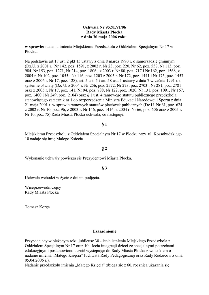 Uchwała Nr 952/LVI/06 Rady Miasta Płocka z dnia 30 maja 2006 roku w sprawie: nadania imienia Miejskiemu Przedszkolu z Oddziałem Specjalnym Nr 17 w Płocku. Na podstawie art.18 ust. 2 pkt 15 ustawy z dnia 8 marca 1990 r. o samorządzie gminnym (Dz.U. z 2001 r. Nr 142, poz. 1591, z 2002 r. Nr 23, poz. 220, Nr 62, poz. 558, Nr 113, poz. 984, Nr 153, poz. 1271, Nr 214, poz. 1806, z 2003 r. Nr 80, poz. 717 i Nr 162, poz. 1568, z 2004 r. Nr 102, poz. 1055 i Nr 116, poz. 1203 z 2005 r. Nr 172, poz. 1441 i Nr 175, poz. 1457 oraz z 2006 r. Nr 17, poz. 128), art. 5 ust. 5 i art. 58 ust. 1 ustawy z dnia 7 września 1991 r. o systemie oświaty (Dz. U. z 2004 r. Nr 256, poz. 2572, Nr 273, poz. 2703 i Nr 281, poz. 2781 oraz z 2005 r. Nr 17, poz. 141, Nr 94, poz. 788, Nr 122, poz. 1020, Nr 131, poz. 1091, Nr 167, poz. 1400 i Nr 249, poz. 2104) oraz § 1 ust. 4 ramowego statutu publicznego przedszkola, stanowiącego załącznik nr 1 do rozporządzenia Ministra Edukacji Narodowej i Sportu z dnia 21 maja 2001 r. w sprawie ramowych statutów placówek publicznych (Dz.U. Nr 61, poz. 624, z 2002 r. Nr 10, poz. 96, z 2003 r. Nr 146, poz. 1416, z 2004 r. Nr 66, poz. 606 oraz z 2005 r. Nr 10, poz. 75) Rada Miasta Płocka uchwala, co następuje: §1 Miejskiemu Przedszkolu z Oddziałem Specjalnym Nr 17 w Płocku przy ul. Kossobudzkiego 10 nadaje się imię Małego Księcia. §2 Wykonanie uchwały powierza się Prezydentowi Miasta Płocka. §3 Uchwała wchodzi w życie z dniem podjęcia. Wiceprzewodniczący Rady Miasta Płocka Tomasz Korga Uzasadnienie Przypadający w bieżącym roku jubileusz 30 - lecia istnienia Miejskiego Przedszkola z Oddziałem Specjalnym Nr 17 oraz 10 - lecia integracji dzieci ze specjalnymi potrzebami edukacyjnymi postanowiono uczcić występując do Rady Miasta Płocka z wnioskiem o nadanie imienia „Małego Księcia” (uchwała Rady Pedagogicznej oraz Rady Rodziców z dnia 05.04.2006 r.). Nadanie przedszkolu imienia „Małego Księcia” zbiega się z 60. rocznicą ukazania się pierwszego wydania książki Antoine'a de Saint – Exupery, przetłumaczonej na 160 języków, której nakład na całym świecie przekroczył 80 milionów egzemplarzy. Ta opowieść jest przykładem niezwykłej komunikacji wychowawczej i uświadamia nam prawdę związaną z wychowaniem człowieka. Miłość łączy się z odpowiedzialnością i poświęceniem za życie tych ludzi, z którymi związaliśmy dobrowolnie swój los. Mały Książę to jedna z najbardziej zagadkowych i niezwykłych postaci literackich. Główny i tytułowy bohater książki - tajemniczy przybysz z planety B- 612 wyrusza w podróż w poszukiwaniu przyjaciela. Szuka także odpowiedzi na pytanie, jak powinien traktować ukochaną Różę. Mały Książę jest dzieckiem, które nieskażone wiedzą i wpływem innych poznaje Ziemię, ludzi i uczy nazywać się uczucia. Poznaje wartość przyjaźni, zaprzyjaźnia się z Pilotem i „oswaja” lisa. Odczuwa strach lecz mimo to jest odważny. Przeżywa radość i smutek. Potrafi odróżniać dobro od zła. Kocha i umie się poświęcać, dba o swój dom i Różę. Dopiero na Ziemi poznając wiele innych róż zrozumie, że Róża, którą kocha jest dla niego jedyna. Antoine de Saint – Exupery obdarzył Małego Księcia takimi przymiotami jak: mądrość, dojrzałość, odpowiedzialność, delikatność, wrażliwość, szczerość, otwartość, cierpliwość, wyrozumiałość. Wychowawcy przedszkola pragną, aby poprzez tę postać, która jest bardzo bliska dzieciom, uczyć je od najmłodszych lat rozumienia tego, że ”dobrze widzi się tylko sercem, najważniejsze jest niewidzialne dla oczu.” To ponadczasowe przesłanie jest istotne w procesie wychowania dziecka zarówno w adomu, jak i w placówce oświatowej. Głęboki sens i wartość miłości, przyjaźni oraz poświęcenia odkrywają dzieci właśnie w tym przedszkolu, które jako pierwsze w Płocku rozpoczęło 10 lat temu edukację dzieci ze sprzężonymi niepełnosprawnościami w systemie częściowej integracji. Mały Książę to postać, od której także my dorośli możemy się wiele nauczyć. Przypomina, że świat często z naszej winy jest zły i zakłamany. Jednocześnie ożywia nasze marzenia i ideały, może pomóc każdemu z nas ocalić w sobie dziecko, którym kiedyś byliśmy: dobre, wrażliwe, otwarte na ludzi i świat. Niezależnie do tego czy mamy lat kilka, kilkanaście, czy kilkadziesiąt Mały Książę ukazuje nam ponadczasowe prawdy o tajemnicy człowieka i o tym, co w życiu jest najważniejsze. Mały Książę to idealny bohater. Uosabia to, co w człowieku jest najpiękniejsze i najwartościowsze. Niniejsza uchwała jest realizacją ustawowego wymogu nałożonego na organ prowadzący przedszkole.