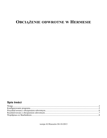 OBCIĄŻENIE ODWROTNE W HERMESIE Spis treści Wstęp...............................................................................................................................................................2 Konfigurowanie programu...............................................................................................................................2 Przychód towaru z obciążeniem odwrotnym...................................................................................................6 Rozchód towaru z obciążeniem odwrotnym....................................................................................................7 Współpraca ze Skarbnikiem............................................................................................................................8 wersja 4.0 Rzeszów 04-10-2013 OBCIĄŻENIE ODWROTNE W HERMESIE wersja 4.0 Str. 2 Wstęp W związku z nowelizacją ustawy o VAT oraz Ordynacji podatkowej wprowadzono mechanizm tzw. „odwrotnego obciążenia” w handlu niektórymi towarami (m.in. stalą). Dokładny wykaz towarów podlegających temu mechanizmowi znajduje się w załączniku nr 1 do ustawy z dnia 26 lipca 2013 r (poz. 1027). Firma Syriusz przygotowała program Hermes w wersji 6.48.6.6 zawierający stosowne zmiany. Niniejsza instrukcja wyjaśnia jakich zmian i w jakich opcjach należy dokonać aby sprzedawać i kupować towary z tzw. „odwrotnym obciążeniem”. Konfigurowanie programu Aby skonfigurować Hermesa do wystawiania dokumentów z tzw „Odwrotnym obciążeniem” należy: 1. Zainstalować Hermesa w wersji co najmniej 6.48.6.6 (nowa wersja jest zawsze dostępna na stronie www.syriusz.eu w dziale Download) 2. na liście stawek VAT (Inne → Stawki VAT → Stawki VAT) założyć (za pomocą klawisza Insert) nową stawkę XX z opisem jak na poniższym rysunku: 3. W konfiguracji ogólnej (Inne → Konfiguracja → Ogólna) należy założyć (lub ustawić jeśli takowy istnieje) parametr PKWIUMASKA wg poniższego rysunku: OBCIĄŻENIE ODWROTNE W HERMESIE wersja 4.0 Str. 3 4. W opcji Inne → Symbolika → P – Faktury powiązane nacisnąć Insert i założyć nowy typ dokumentu (dwuliterowy symbol typu dokumentu można nadać własny – na poniższym przykładzie będzie to FW). Opis to: DOKUMENT WENWĘTRZNY, Atrybut: FVO (UWAGA – O to jest litera a nie cyfra!). 5. Pozostajemy nadal w oknie definiowania dokumentów powiązanych. Z menu wybieramy opcję Druk 6. W nowo otwartym oknie „Typy dokumentów, faktury do paragonów, wzory wydruków” naciskamy ikonę Import wzorca OBCIĄŻENIE ODWROTNE W HERMESIE wersja 4.0 Str. 4 7. W nowo otwartym oknie z podkatalogu w którym jest zainstalowany Hermes wybieramy katalog WZORY a w nim wybieramy plik roz1.wzr i naciskamy Otwórz 8. Następnie naciskamy ikonę Dodaj wzór Otworzy się okno w którym wpisujemy opis tego wzoru. UWAGA – wzór doda się z kolejnym numerem. Numer ten należy wpisać w rubryce wzór w oknie z punktu 4. 9. W opcji Analiza → Rozchód → Dokumenty → Cała sprzedaż wczytujemy nowy wzór wydruku rejestru sprzedaży VAT zawierający stawkę XX (aby to zrobić naciskamy klawisze Alt – P, w oknie z wzorem wydruku wybieramy ikonę „wczytaj wzór” i z podkatalogu WZORY wybieramy plik o nazwie: rej_spr_nowe_stawki.wzr i naciskamy ikonę „popraw wzór” 10. Analogicznie wczytujemy rejestr zakupu VAT (w opcji Analiza → Dostawa → Dokumenty → Zakupy z pliku: rej_zak_nowe_stawki.wzr) OBCIĄŻENIE ODWROTNE W HERMESIE wersja 4.0 Str. 5 11. Wchodzimy do opcji Magazyn → Kartoteki i wszystkim kartotekom które będą podlegać procedurze odwrotnego obciążenia zaznaczamy opcję „Odwrotny” a w polu ze stawką VAT wybieramy 23. 12. Jeśli korzystaliśmy z rozwiązania tymczasowego (opisanego w poprzednich wersjach instrukcji) usuwamy z definicji faktur VAT informację o wydruku tekstu dodatkowego (Inne → Symbolika → D – rozchody, edytujemy dokument FV i z pola UWAGI usuwamy zapis typu TXT01) OBCIĄŻENIE ODWROTNE W HERMESIE wersja 4.0 Str. 6 Przychód towaru z obciążeniem odwrotnym 1. W trakcie przyjmowania na stan magazynu towaru zaznaczonego jako podlegający „obciążeniu odwrotnemu” program Hermes SAM zastosuje stawkę XX (UWAGA – towar na kartotece magazynowej MUSI BYĆ ze stawką 23 ale do dokumentu przychodu program wstawi stawkę XX). 2. Po wystawieniu dokumentu przychodu przechodzimy do opcji Magazyn → Rozchód → Dokument powiązany → VAT odwrotny wybieramy dokument wewnętrzny zdefiniowany w trakcie konfigurowania programu. Jako kontrahenta wybieramy dane naszego dostawcy (ponieważ w tej klasie dokumentów przeglądamy listę odbiorców może zaistnieć konieczność założenia odbiorcy z danymi kontrahenta z dokumentu przychodu). W rubryce Dotyczy na tym dokumencie wybieramy dokument przychodu do którego chcemy wystawić dokument wewnętrzny. Po zatwierdzeniu nagłówka dokumentu Hermes automatycznie przygotuje pozycje dokumentu podlegające „obciążeniu odwrotnemu”. Wystarczy jedynie zatwierdzić ten dokument (za pomocą Ctrl-Q) i wydrukować. Jest to dokument potrzeby działowi księgowości. OBCIĄŻENIE ODWROTNE W HERMESIE wersja 4.0 Str. 7 Rozchód towaru z obciążeniem odwrotnym W trakcie wystawiania dokumentu rozchodu gdy wybierzemy artykuł zaznaczony w kartotece jako podlegający tzw. „odwrotnemu obciążeniu” program sam zastosuje odpowiednią stawkę VAT: - XX jeżeli odbiorcą jest firma - 23% jeśli odbiorcą jest osoba fizyczna Na wydruku dokumentu rozchodu artykuł będzie ze stawką XX, a pod kwotą do zapłaty będzie wydrukowana informacja o odwrotnym obciążeniu. OBCIĄŻENIE ODWROTNE W HERMESIE wersja 4.0 Str. 8 Współpraca ze Skarbnikiem W chwili obecnej trwają prace dzięki którym mechanizm „odwrotnego obciążenia” będzie również przekazywany do programu Skarbnik. Nowa wersja Skarbnika powinny być dostępna do 15 października 2013 r.