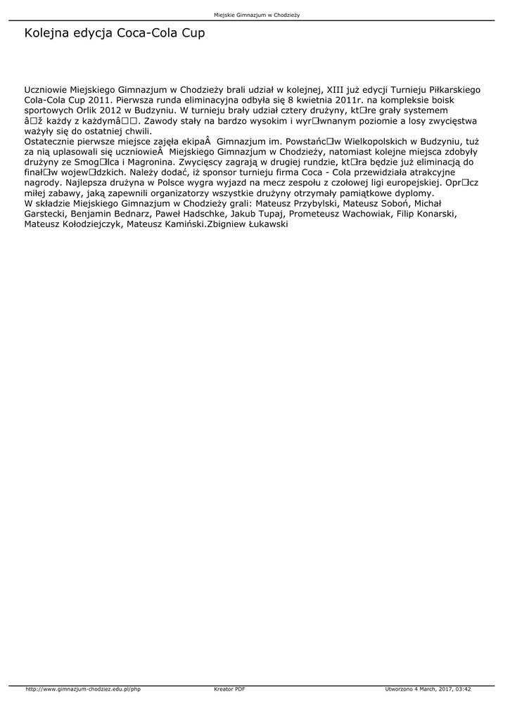 Miejskie Gimnazjum w Chodzieży Kolejna edycja Coca-Cola Cup Uczniowie Miejskiego Gimnazjum w Chodzieży brali udział w kolejnej, XIII już edycji Turnieju Piłkarskiego Cola-Cola Cup 2011. Pierwsza runda eliminacyjna odbyła się 8 kwietnia 2011r. na kompleksie boisk sportowych Orlik 2012 w Budzyniu. W turnieju brały udział cztery drużyny, ktÃłre grały systemem „każdy z każdym―. Zawody stały na bardzo wysokim i wyrÃłwnanym poziomie a losy zwycięstwa ważyły się do ostatniej chwili. Ostatecznie pierwsze miejsce zajęła ekipa Gimnazjum im. PowstańcÃłw Wielkopolskich w Budzyniu, tuż za nią uplasowali się uczniowie Miejskiego Gimnazjum w Chodzieży, natomiast kolejne miejsca zdobyły drużyny ze SmogÃłlca i Magronina. Zwycięscy zagrają w drugiej rundzie, ktÃłra będzie już eliminacją do finałÃłw wojewÃłdzkich. Należy dodać, iż sponsor turnieju firma Coca - Cola przewidziała atrakcyjne nagrody. Najlepsza drużyna w Polsce wygra wyjazd na mecz zespołu z czołowej ligi europejskiej. OprÃłcz miłej zabawy, jaką zapewnili organizatorzy wszystkie drużyny otrzymały pamiątkowe dyplomy. W składzie Miejskiego Gimnazjum w Chodzieży grali: Mateusz Przybylski, Mateusz Soboń, Michał Garstecki, Benjamin Bednarz, Paweł Hadschke, Jakub Tupaj, Prometeusz Wachowiak, Filip Konarski, Mateusz Kołodziejczyk, Mateusz Kamiński.Zbigniew Łukawski http://www.gimnazjum-chodziez.edu.pl/php Kreator PDF Utworzono 4 March, 2017, 03:42
