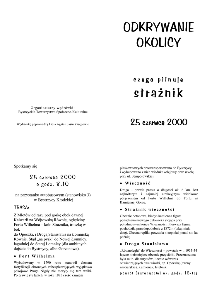 ODKRYWANIE OKOLICY czego pilnuje strażnik Or ganizato r zy węd r ó wki: Bystrzyckie Towarzystwo Społeczno-Kulturalne Wędrówkę poprowadzą Lidia Agata i Jasiu Zasępowie Spotkamy się 25 cze rwca 2000 o g o dz. 8 .10 na przystanku autobusowym (stanowisko 3) w Bystrzycy Kłodzkiej TRASA: Z Młotów od razu pod górkę obok dawnej Kalwarii na Wójtowską Równię, oględziny Fortu Wilhelma – koło StraŜnika, troszkę w bok do Opoczki, i Drogą Stanisława na Łomnicką Równię. Stąd „na pysk” do Nowej Łomnicy, łagodniej do Starej Łomnicy (dla ambitnych dojście do Bystrzycy, albo Gorzanowa). • Fort Wilhelma Wybudowany w 1790 roku stanowił element fortyfikacji obronnych zabezpieczających wyjątkowo pokojowe Prusy. Nigdy nie toczyły się tam walki. Po prawie stu latach, w roku 1875 część kamieni 25 czerwca 2000 piaskowcowych przetransportowano do Bystrzycy i wybudowano z nich wiadukt kolejowy oraz szkołę przy ul. Sempołowskiej. • Wieczność Droga – prawie prosta o długości ok. 6 km. Jest najkrótszym i najmniej atrakcyjnym widokowo połączeniem od Fortu Wilhelma do Fortu na Kamiennej Górze. • StraŜnik wieczności Obecnie betonowa, kiedyś kamienna figura ponadwymiarowego człowieka stojąca przy południowym końcu Wieczności. Pierwsza figura pochodziła prawdopodobnie z 1872 r. (taką miała datę). Obecna replika powstała nieopodal ponad sto lat później. • Droga Stanisława „Równoległa” do Wieczności – powstała w l. 1933-34 łącząc nieistniejące obecnie przysiółki. Przeznaczona była m.in. dla turystów, licznie wówczas odwiedzających owe wioski, np. Opoczkę (tereny narciarskie), Kamionek, Istebnik. powrót (autobusem) ok. godz. 16-tej