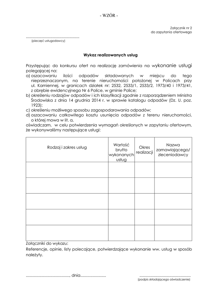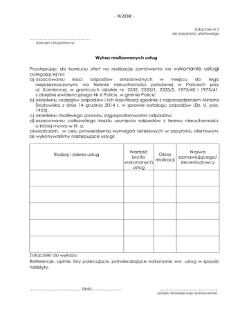 - WZÓR Załącznik nr 2 do zapytania ofertowego ................................................ (pieczęć usługodawcy) Wykaz realizowanych usług Przystępując do konkursu ofert na realizację zamówienia na wykonanie usługi polegającej na: a) oszacowaniu ilości odpadów składowanych w miejscu do tego nieprzeznaczonym, na terenie nieruchomości położonej w Policach przy ul. Kamiennej, w granicach działek nr: 2532, 2533/1, 2533/2, 1973/40 i 1973/41, z obrębie ewidencyjnego Nr 6 Police, w gminie Police; b) określeniu rodzajów odpadów i ich klasyfikacji zgodnie z rozporządzeniem Ministra Środowiska z dnia 14 grudnia 2014 r. w sprawie katalogu odpadów (Dz. U. poz. 1923); c) określeniu możliwego sposobu zagospodarowania odpadów; d) oszacowaniu całkowitego kosztu usunięcia odpadów z terenu nieruchomości, o której mowa w lit. a, oświadczam, w celu potwierdzenia wymagań określonych w zapytaniu ofertowym, że wykonywaliśmy następujące usługi: Rodzaj i zakres usług Wartość Nazwa Okres brutto zamawiającego/ realizacji wykonanych zleceniodawcy usług Załączniki do wykazu: Referencje, opinie, listy polecające, potwierdzające wykonanie ww. usług w sposób należyty. ......................................., dnia....................... .............................................. (podpis składającego oświadczenie) - WZÓR -