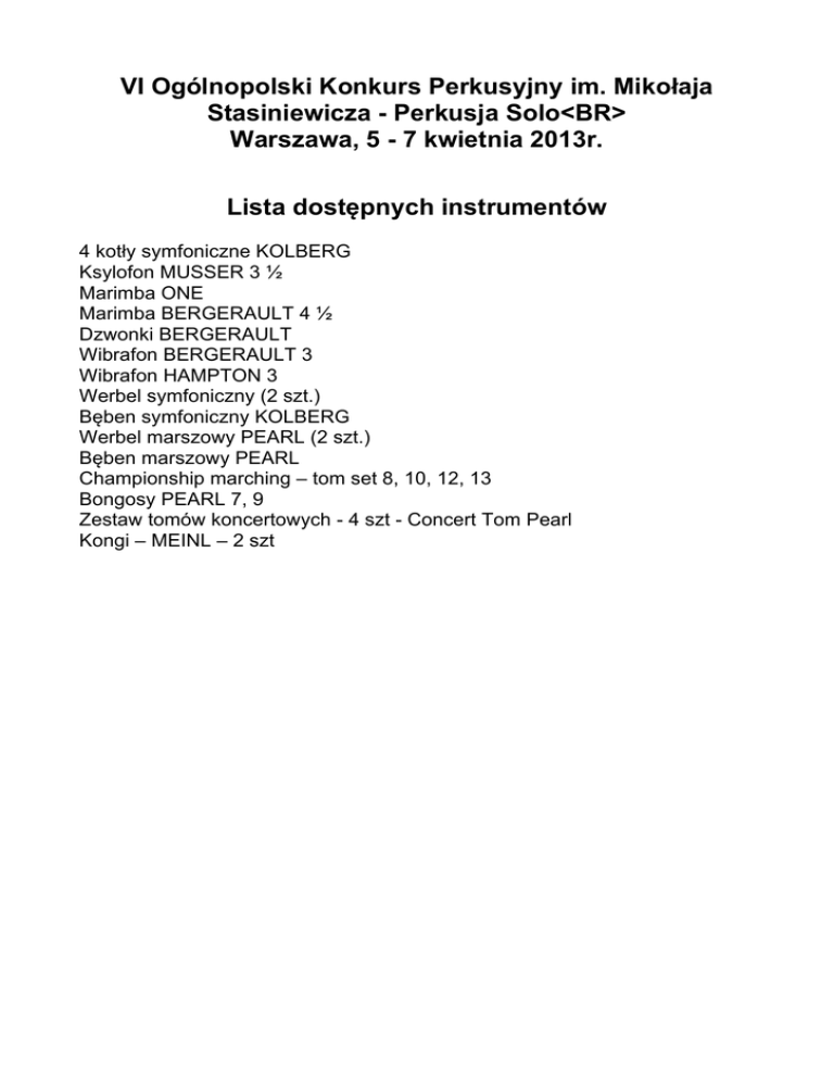 VI Ogólnopolski Konkurs Perkusyjny im. Mikołaja Stasiniewicza - Perkusja Solo<BR> Warszawa, 5 - 7 kwietnia 2013r. Lista dostępnych instrumentów 4 kotły symfoniczne KOLBERG Ksylofon MUSSER 3 ½ Marimba ONE Marimba BERGERAULT 4 ½ Dzwonki BERGERAULT Wibrafon BERGERAULT 3 Wibrafon HAMPTON 3 Werbel symfoniczny (2 szt.) Bęben symfoniczny KOLBERG Werbel marszowy PEARL (2 szt.) Bęben marszowy PEARL Championship marching – tom set 8, 10, 12, 13 Bongosy PEARL 7, 9 Zestaw tomów koncertowych - 4 szt - Concert Tom Pearl Kongi – MEINL – 2 szt