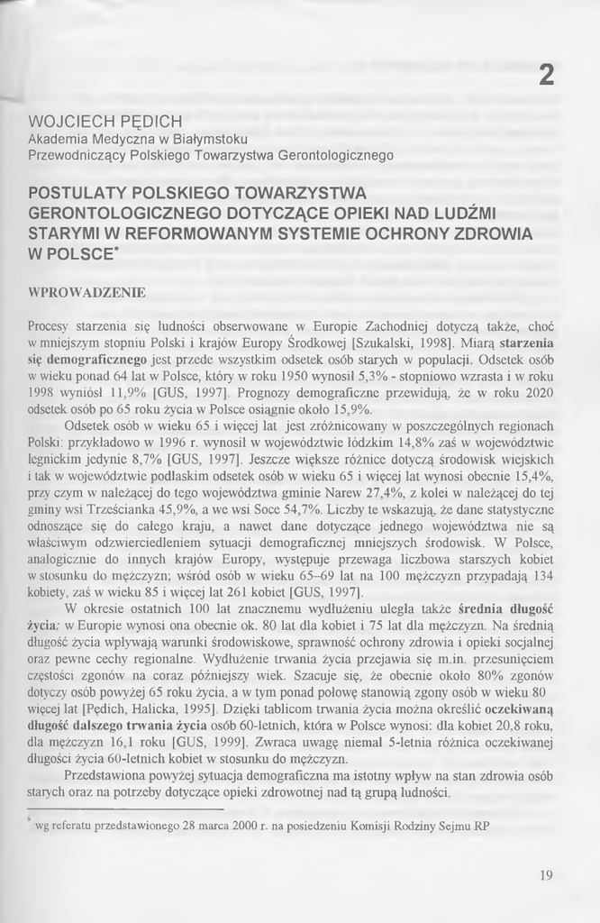2 WOJCIECH PĘDICH Akademia Medyczna w Białymstoku Przewodniczący Polskiego Towarzystwa Gerontologicznego POSTULATY POLSKIEGO TOWARZYSTWA GERONTOLOGICZNEGO DOTYCZĄCE OPIEKI NAD LUDŹMI STARYMI W REFORMOWANYM SYSTEMIE OCHRONY ZDROWIA W POLSCE* WPROWADZENIE Procesy starzenia się ludności obserwowane w Europie Zachodniej dotyczą także, choć w mniejszym stopniu Polski i krajów Europy Środkowej [Szukalski, 1998], Miarą starzenia się demograficznego jest przede wszystkim odsetek osób starych w populacji. Odsetek osób w wieku ponad 64 lat w Polsce, który w roku 1950 wynosił 5,3% - stopniowo wzrasta i w roku 1998 wyniósł 11,9% [GUS, 1997], Prognozy demograficzne przewidują, że w roku 2020 odsetek osób po 65 roku życia w Polsce osiągnie około 15,9%. Odsetek osób w wieku 65 i więcej lat jest zróżnicowany w poszczególnych regionach Polski: przykładowo w 1996 r. wynosił w województwie łódzkim 14,8% zaś w województwie legnickim jedynie 8,7% [GUS, 1997], Jeszcze większe różnice dotyczą środowisk wiejskich i tak w województwie podlaskim odsetek osób w wieku 65 i więcej lat wynosi obecnie 15,4%, przy czym w należącej do tego województwa gminie Narew 27,4%, z kolei w należącej do tej gminy wsi Trześcianka 45,9%, a we wsi Soce 54,7%. Liczby te wskazują, że dane statystyczne odnoszące się do całego kraju, a nawet dane dotyczące jednego województwa nie są właściwym odzwierciedleniem sytuacji demograficznej mniejszych środowisk. W Polsce, analogicznie do innych krajów Europy, występuje przewaga liczbowa starszych kobiet w stosunku do mężczyzn; wśród osób w wieku 65-69 lat na 100 mężczyzn przypadają 134 kobiety, zaś w wieku 85 i więcej lat 261 kobiet [GUS, 1997], W okresie ostatnich 100 lat znacznemu wydłużeniu uległa także średnia długość życia; w Europie wynosi ona obecnie ok. 80 lat dla kobiet i 75 lat dla mężczyzn. Na średnią długość życia wpływają warunki środowiskowe, sprawność ochrony zdrowia i opieki socjalnej oraz pewne cechy regionalne. Wydłużenie trwania życia przejawia się m.in. przesunięciem częstości zgonów na coraz późniejszy wiek. Szacuje się, że obecnie około 80% zgonów dotyczy osób powyżej 65 roku życia, a w tym ponad połowę stanowią zgony osób w wieku 80 więcej lat [Pędich, Halicka, 1995], Dzięki tablicom trwania życia można określić oczekiwaną długość dalszego trwania życia osób 60-letnich, która w Polsce wynosi: dla kobiet 20,8 roku, dla mężczyzn 16,1 roku [GUS, 1999], Zwraca uwagę niemal 5-letnia różnica oczekiwanej długości życia 60-letnich kobiet w stosunku do mężczyzn. Przedstawiona powyżej sytuacja demograficzna ma istotny wpływ na stan zdrowia osób starych oraz na potrzeby dotyczące opieki zdrowotnej nad tą grupą ludności. wg referatu przedstawionego 28 marca 2000 r. na posiedzeniu Komisji Rodziny Sejmu RP 19 STAROŚĆ I JEJ NASTĘPSTWA W rozważaniach dotyczących szczególnie zjawisk biologicznych, związanych z procesami starzenia się, nieodzowne jest ścisłe zdefiniowanie używanych pojęć. Starzenie się jest to naturalny, długotrwały i nieodwracalny proces fizjologiczny, zachodzący w osobniczym rozwoju żywych organizmów, w tym także człowieka. Starzenie się ma charakter dynamiczny, może ulegać przyśpieszaniu i zwalnianiu. W procesie starzenia występują złożone uwarunkowania genetyczne, biologiczne i środowiskowe. W przeciwieństwie do starzenia się starość ma charakter statyczny i oznacza końcowy okres życia. Początek starości określany jest umownie, zależnie od celów. W zastosowaniu do badań biologicznych za początek starości przyjmuje się 60 lub 65 rok życia. Dla celów demograficznych i społecznoekonomicznych starość bywa utożsamiana z pojęciem wieku emerytalnego. Synonimami pojęcia starość są: wiek starczy lub wiek starszy oraz wiek trzeci. Określenia te są mało precyzyjne i mają na celu w sposób „łagodny” określać starość. Podokresy wieku starszego. Zarówno bieg czasu, jak i zachodzące procesy starzenia się powoduję, że ludzie starzy nie stanowią jednolitej grupy pod względem stanu zdrowia, sprawności fizycznej i psychicznej, a także pod względem sytuacji życiowej, społecznej i ekonomicznej. Uzasadnia to potrzebę podziału czasu starości na mniejsze okresy. Współcześnie stosuje się najczęściej podział na dwa okresy: wczesną starość (wiek podeszły, „młodsi starzy”) i późną starość (starość właściwa, „starsi starzy”) z granicą w 75 roku życia. Z biologicznego punktu widzenia uzasadnione jest wyodrębnienie grupy osób długowiecznych (powyżej 90 roku życia) jako grupy o szczególnych cechach biologicznych i dziedzicznej predyspozycji do długiego życia. Badania gerontologiczne - niezależnie od ich charakteru - powinny uwzględniać podział wieku starszego na podgrupy, aby uniknąć nieuzasadnionych i błędnych uogólnień [Pędich, 1998], Podane podziały odnoszą się do wieku kalendarzowego (wieku metrykalnego), więc mogą być łatwo konfrontowane z dokumentami stwierdzającymi datę urodzenia. Jednakże przebieg i zaawansowanie procesów starzenia nie zawsze są zgodne z wiekiem kalen darzowym. Z tego względu w gerontologii wyróżnia się takie pojęcia; jak wiek biologiczny (określający zaawansowanie starzenia) oraz wiek czynnościowy (określający stopień utraty sprawności). Wiek biologiczny oraz wiek czynnościowy ustala się na podstawie konfrontacji biologicznych i sprawnościowych mierników, określających badanego osobnika, z normami fizjologicznymi, ustalonymi dla poszczególnych przedziałów wieku starczego. Porównując wiek metrykalny z wiekiem biologicznym (lub czynnościowym) można wyróżnić starzenie fizjologiczne (przebiegające zgodnie z wiekiem metrykalnym), starzenie przedwczesne (przebiegające szybciej niż wskazuje wiek metrykalny) oraz starzenie opóźnione (cha rakterystyczne dla os