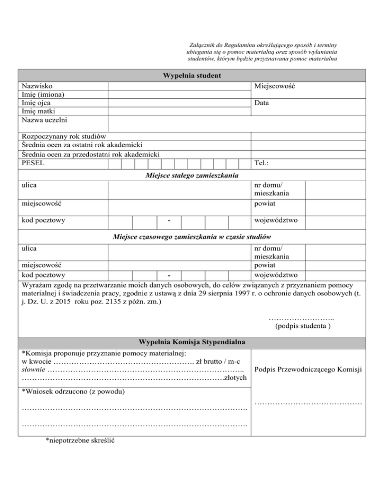 Załącznik do Regulaminu określającego sposób i terminy ubiegania się o pomoc materialną oraz sposób wyłaniania studentów, którym będzie przyznawana pomoc materialna Wypełnia student Miejscowość Nazwisko Imię (imiona) Imię ojca Imię matki Nazwa uczelni Data Rozpoczynany rok studiów Średnia ocen za ostatni rok akademicki Średnia ocen za przedostatni rok akademicki PESEL Tel.: Miejsce stałego zamieszkania ulica nr domu/ mieszkania powiat miejscowość kod pocztowy - województwo Miejsce czasowego zamieszkania w czasie studiów ulica nr domu/ mieszkania miejscowość powiat kod pocztowy województwo Wyrażam zgodę na przetwarzanie moich danych osobowych, do celów związanych z przyznaniem pomocy materialnej i świadczenia pracy, zgodnie z ustawą z dnia 29 sierpnia 1997 r. o ochronie danych osobowych (t. j. Dz. U. z 2015 roku poz. 2135 z późn. zm.) …………………….. (podpis studenta ) Wypełnia Komisja Stypendialna *Komisja proponuje przyznanie pomocy materialnej: w kwocie ………………………………………………. zł brutto / m-c słownie ………………………………………………………………….. Podpis Przewodniczącego Komisji …………………………………………………………………….złotych *Wniosek odrzucono (z powodu) ……………………………………………………………………………. ……………………………………………………………………………. *niepotrzebne skreślić ……………………………………