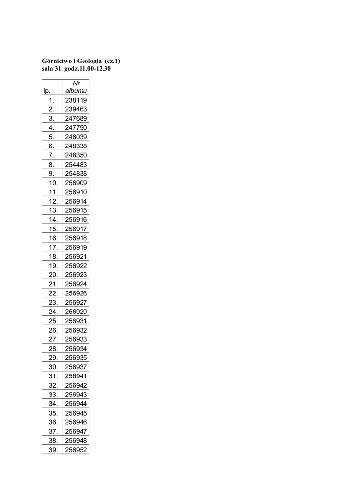 Górnictwo i Geologia (cz.1) sala 31, godz.11.00-12.30 lp. 1. 2. 3. 4. 5. 6. 7. 8. 9. 10. 11. 12. 13. 14. 15. 16. 17. 18. 19. 20. 21. 22. 23. 24. 25. 26. 27. 28. 29. 30. 31. 32. 33. 34. 35. 36. 37. 38. 39. Nr albumu 238119 239463 247689 247790 248039 248338 248350 254483 254838 256909 256910 256914 256915 256916 256917 256918 256919 256921 256922 256923 256924 256926 256927 256929 256931 256932 256933 256934 256935 256937 256941 256942 256943 256944 256945 256946 256947 256948 256952 40. 41. 42. 43. 44. 45. 46. 47. 48. 49. 50. 256953 256954 256955 256956 256957 257180 261297 264564 264565 264566 265490 Górnictwo i Geologia (cz.2) sala 213, godz.11.00-12.30 Nr. Lp. albumu 1. 234839 2. 247822 3. 256960 4. 256961 5. 256962 6. 256963 7. 256964 8. 256966 9. 256967 10. 256968 11. 256969 12. 256970 13. 256971 14. 256972 15. 256973 16. 256974 17. 256975 18. 256976 19. 256977 20. 256978 21. 256979 22. 256980 23. 256982 24. 256984 25. 256986 26. 256988 27. 256990 28. 256991 29. 256993 30. 256994 31. 256995 32. 256996 33. 256998 34. 256999 35. 257000 36. 257001 37. 257003 38. 257005 39. 257006 40. 257008 41. 42. 43. 44. 45. 46. 47. 48. 49. 50. 257009 257011 257012 257013 257015 257016 257018 257019 257020 264568 Górnictwo i Geologia (cz.3) sala 216, godz.11.00-12.30 Lp. Nr albumu 1 257023 2 238207 3 257025 4 247542 5 257027 6 247645 7 257029 8 257031 9 262293 10 257032 11 257033 12 238218 13 257230 14 257034 15 257036 16 257038 17 257039 18 238224 19 257042 20 257043 21 257044 22 257045 23 257046 24 238413 25 257047 26 257048 27 257050 28 250192 29 250987 30 264570 31 257052 32 257053 33 257054 34 256886 35 247659 36 257055 37 257056 38 257057 39 264571 40 257058 Górnictwo i Geologia (cz.4) sala 115, godz.12.30-14.00 Lp. 1. 2. 3. 4. 5. 6. 7. 8. 9. 10. 11. 12. 13. 14. 15. 16. 17. 18. 19. 20. 21. 22. 23. 24. 25. 26. 27. 28. 29. 30. nr albumu 238520 247734 247963 254618 257059 257060 257062 257063 257065 257067 257069 257071 257072 257073 257075 257076 257078 257079 257080 257081 257083 257086 257087 257089 257090 257091 257092 257093 264573 264598 Górnictwo i Geologia (cz.5) sala 213, godz.12.30-14.00 Lp. Nr albumu 1. 229753 2. 230359 3. 238533 4. 247340 5. 248019 6. 257094 7. 257097 8. 257098 9. 257099 10. 257100 11. 257101 12. 257102 13. 257104 14. 257106 15. 257107 16. 257108 17. 257109 18. 257110 19. 257112 20. 257113 21. 257114 22. 257115 23. 257116 24. 257117 25. 257118 26. 257119 27. 257120 28. 257122 29. 257124 30. 257125 31. 257126 32. 257128 33. 257129 34. 257130 35. 257132 36. 257133 37. 257135 38. 257136 39. 257139 Geofizyka sala 213, godz.8.00-9.30 lp. 1. 2. 3. 4. 5. 6. 7. 8. 9. 10. 11. 12. 13. 14. 15. 16. 17. 18. 19. 20. 21. 22. 23. 24. 25. 26. 27. 28. 29. 30. 31. 32. 33. 34. 35. 36. 37. 38. 39. 40. Nr albumu 237923 238094 247863 256853 256855 256856 256857 256859 256860 256861 256862 256863 256864 256865 256866 256867 256868 256870 256871 256872 256873 256877 256878 256879 256880 256882 256883 256884 256885 256888 256889 256892 256893 256895 256896 256899 256900 256901 256905 256906 41. 42. 43. 44. 45. 256907 256912 257068 260389 263243