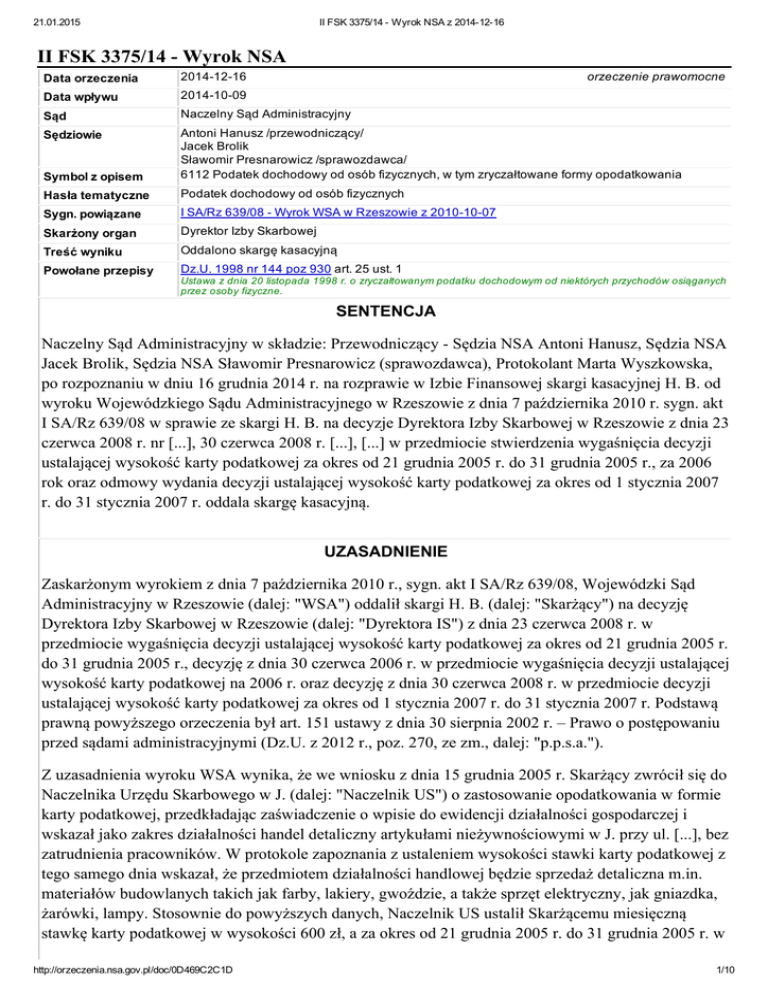 21.01.2015 II FSK 3375/14 Wyrok NSA z 20141216 II FSK 3375/14 Wyrok NSA Data orzeczenia 20141216 orzeczenie prawomocne Data wpływu 20141009 Sąd Naczelny Sąd Administracyjny Sędziowie Symbol z opisem Antoni Hanusz /przewodniczący/ Jacek Brolik Sławomir Presnarowicz /sprawozdawca/ 6112 Podatek dochodowy od osób fizycznych, w tym zryczałtowane formy opodatkowania Hasła tematyczne Podatek dochodowy od osób fizycznych Sygn. powiązane I SA/Rz 639/08 Wyrok WSA w Rzeszowie z 20101007 Skarżony organ Dyrektor Izby Skarbowej Treść wyniku Oddalono skargę kasacyjną Powołane przepisy Dz.U. 1998 nr 144 poz 930 art. 25 ust. 1 Ustawa z dnia 20 listopada 1998 r. o zryczałtowanym podatku dochodowym od niektórych przychodów osiąganych przez osoby fizyczne. SENTENCJA Naczelny Sąd Administracyjny w składzie: Przewodniczący Sędzia NSA Antoni Hanusz, Sędzia NSA Jacek Brolik, Sędzia NSA Sławomir Presnarowicz (sprawozdawca), Protokolant Marta Wyszkowska, po rozpoznaniu w dniu 16 grudnia 2014 r. na rozprawie w Izbie Finansowej skargi kasacyjnej H. B. od wyroku Wojewódzkiego Sądu Administracyjnego w Rzeszowie z dnia 7 października 2010 r. sygn. akt I SA/Rz 639/08 w sprawie ze skargi H. B. na decyzje Dyrektora Izby Skarbowej w Rzeszowie z dnia 23 czerwca 2008 r. nr [...], 30 czerwca 2008 r. [...], [...] w przedmiocie stwierdzenia wygaśnięcia decyzji ustalającej wysokość karty podatkowej za okres od 21 grudnia 2005 r. do 31 grudnia 2005 r., za 2006 rok oraz odmowy wydania decyzji ustalającej wysokość karty podatkowej za okres od 1 stycznia 2007 r. do 31 stycznia 2007 r. oddala skargę kasacyjną. UZASADNIENIE Zaskarżonym wyrokiem z dnia 7 października 2010 r., sygn. akt I SA/Rz 639/08, Wojewódzki Sąd Administracyjny w Rzeszowie (dalej: "WSA") oddalił skargi H. B. (dalej: "Skarżący") na decyzję Dyrektora Izby Skarbowej w Rzeszowie (dalej: "Dyrektora IS") z dnia 23 czerwca 2008 r. w przedmiocie wygaśnięcia decyzji ustalającej wysokość karty podatkowej za okres od 21 grudnia 2005 r. do 31 grudnia 2005 r., decyzję z dnia 30 czerwca 2006 r. w przedmiocie wygaśnięcia decyzji ustalającej wysokość karty podatkowej na 2006 r. oraz decyzję z dnia 30 czerwca 2008 r. w przedmiocie decyzji ustalającej wysokość karty podatkowej za okres od 1 stycznia 2007 r. do 31 stycznia 2007 r. Podstawą prawną powyższego orzeczenia był art. 151 ustawy z dnia 30 sierpnia 2002 r. – Prawo o postępowaniu przed sądami administracyjnymi (Dz.U. z 2012 r., poz. 270, ze zm., dalej: "p.p.s.a."). Z uzasadnienia wyroku WSA wynika, że we wniosku z dnia 15 grudnia 2005 r. Skarżący zwrócił się do Naczelnika Urzędu Skarbowego w J. (dalej: "Naczelnik US") o zastosowanie opodatkowania w formie karty podatkowej, przedkładając zaświadczenie o wpisie do ewidencji działalności gospodarczej i wskazał jako zakres działalności handel detaliczny artykułami nieżywnościowymi w J. przy ul. [...], bez zatrudnienia pracowników. W protokole zapoznania z ustaleniem wysokości stawki karty podatkowej z tego samego dnia wskazał, że przedmiotem działalności handlowej będzie sprzedaż detaliczna m.in. materiałów budowlanych takich jak farby, lakiery, gwoździe, a także sprzęt elektryczny, jak gniazdka, żarówki, lampy. Stosownie do powyższych danych, Naczelnik US ustalił Skarżącemu miesięczną stawkę karty podatkowej w wysokości 600 zł, a za okres od 21 grudnia 2005 r. do 31 grudnia 2005 r. w http://orzeczenia.nsa.gov.pl/doc/0D469C2C1D 1/10 21.01.2015 II FSK 3375/14 Wyrok NSA z 20141216 wysokości 220 zł. Przeprowadzona kontrola podatkowa i postępowanie kontrolne ujawniły, że we wspomnianym wniosku Skarżący podał dane niezgodne ze stanem faktycznym. W trakcie przeprowadzonego postępowania podatkowego Naczelnik US ustalił, że Skarżący prowadził działalność w zakresie handlu artykułami nieżywnościowymi w B. przy ul. [...] i faktu tego nie zgłosił organowi podatkowemu. Rodzaj i rozmiar prowadzonej działalności wskazywały na to, że w istocie Skarżący nie prowadził sprzedaży detalicznej, lecz hurtową, która jest wyłączona z opodatkowania w tej formie, a ponadto w prowadzonej działalności korzystał z usług J. B., który nie był zatrudniony na podstawie umowy o pracę. W piśmie z dnia 1 lutego 2007 r. Skarżący powiadomił Naczelnika US, że z dniem 1 lutego 2007 r. zmienia miejsce prowadzenia działalności na B. ul. [...]. Naczelnik US decyzjami z dnia 29 lutego 2008 r. i 10 marca 2008 r. stwierdził wygaśnięcie decyzji w sprawie ustalenia wysokości karty podatkowej na okres od 21 grudnia 2005 r. do 31 grudnia 2005 r. i na 2006 r., zaś decyzją z dnia 11 marca 2008 r. odmówił wydania decyzji ustalającej wysokość podatku dochodowego w formie karty podatkowej na okres od 1 stycznia 2007 r. do 31 stycznia 2007 r. Organ stwierdził brak podstaw do opodatkowania działalności handlowej prowadzonej przez Skarżącego w formie karty podatkowej na podstawie art. 40 ust. 1 pkt 1 i pkt 3 ustawy z dnia 20 listopada 1998 r. o zryczałtowanym podatku dochodowym od niektórych przychodów osiąganych przez osoby fizyczne (Dz.U. Nr 44, poz. 930 ze zm., dalej: "u.z.p.d."). Po rozpatrzeniu odwołań Skarżącego Dyrektor IS decyzjami z dnia 23 czerwca 2008 r. oraz z dnia 30 czerwca 2008 r. utrzymał w mocy decyzje organu pierwszej instancji. W uzasadnieniu organ stwierdził, że dowody zgromadzone w postępowaniu podatkowym wykazały brak podstaw do opodatkowania działalności Skarżącego w formie karty podatkowej. Zgodnie z wnioskiem Skarżący powinien prowadzić handel detaliczny artykułami nieżywnościowymi w sklepie położonym w J. przy ul. [...]. Tymczasem prowadzona faktycznie działalność w zakresie handlu nie spełniała kryterium uznania jej za handel detaliczny, bo nie polegała na sprzedaży towarów bezpośrednio klientom lub konsumentom w punkcie (sklepie) zgłoszonym w urzędzie skarbowym. Przedmiotem sprzedaży były przeciww
