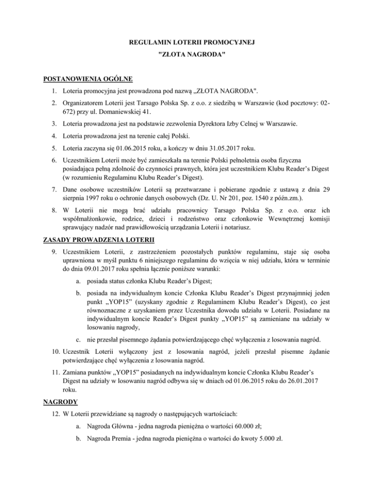 REGULAMIN LOTERII PROMOCYJNEJ "ZŁOTA NAGRODA" POSTANOWIENIA OGÓLNE 1. Loteria promocyjna jest prowadzona pod nazwą „ZŁOTA NAGRODA". 2. Organizatorem Loterii jest Tarsago Polska Sp. z o.o. z siedzibą w Warszawie (kod pocztowy: 02672) przy ul. Domaniewskiej 41. 3. Loteria prowadzona jest na podstawie zezwolenia Dyrektora Izby Celnej w Warszawie. 4. Loteria prowadzona jest na terenie całej Polski. 5. Loteria zaczyna się 01.06.2015 roku, a kończy w dniu 31.05.2017 roku. 6. Uczestnikiem Loterii może być zamieszkała na terenie Polski pełnoletnia osoba fizyczna posiadająca pełną zdolność do czynności prawnych, która jest uczestnikiem Klubu Reader’s Digest (w rozumieniu Regulaminu Klubu Reader’s Digest). 7. Dane osobowe uczestników Loterii są przetwarzane i pobierane zgodnie z ustawą z dnia 29 sierpnia 1997 roku o ochronie danych osobowych (Dz. U. Nr 201, poz. 1540 z późn.zm.). 8. W Loterii nie mogą brać udziału pracownicy Tarsago Polska Sp. z o.o. oraz ich współmałżonkowie, rodzice, dzieci i rodzeństwo oraz członkowie Wewnętrznej komisji sprawujący nadzór nad prawidłowością urządzania Loterii i notariusz. ZASADY PROWADZENIA LOTERII 9. Uczestnikiem Loterii, z zastrzeżeniem pozostałych punktów regulaminu, staje się osoba uprawniona w myśl punktu 6 niniejszego regulaminu do wzięcia w niej udziału, która w terminie do dnia 09.01.2017 roku spełnia łącznie poniższe warunki: a. posiada status członka Klubu Reader’s Digest; b. posiada na indywidualnym koncie Członka Klubu Reader’s Digest przynajmniej jeden punkt „YOP15” (uzyskany zgodnie z Regulaminem Klubu Reader’s Digest), co jest równoznaczne z uzyskaniem przez Uczestnika dowodu udziału w Loterii. Posiadane na indywidualnym koncie Reader’s Digest punkty „YOP15” są zamieniane na udziały w losowaniu nagrody, c. nie przesłał pisemnego żądania potwierdzającego chęć wyłączenia z losowania nagród. 10. Uczestnik Loterii wyłączony jest z losowania nagród, jeżeli przesłał pisemne żądanie potwierdzające chęć wyłączenia z losowania nagród. 11. Zamiana punktów „YOP15” posiadanych na indywidualnym koncie Członka Klubu Reader’s Digest na udziały w losowaniu nagród odbywa się w dniach od 01.06.2015 roku do 26.01.2017 roku. NAGRODY 12. W Loterii przewidziane są nagrody o następujących wartościach: a. Nagroda Główna - jedna nagroda pieniężna o wartości 60.000 zł; b. Nagroda Premia - jedna nagroda pieniężna o wartości do kwoty 5.000 zł. 13. Maksymalna wartość puli nagród w Loterii wynosi 65.000 zł brutto. 14. Zwycięzcom nagród nie przysługuje prawo do zastrzeżenia szczególnych właściwości nagrody. LOSOWANIE NAGRÓD 15. Jeden punkt „YOP15” posiadany na indywidualnym koncie Członka Klubu Reader’s Digest zamieniany jest na jeden udział w losowaniu Nagrody Głównej. 16. Losowanie Nagrody Głównej jest przeprowadzane w siedzibie Organizatora w dniu 30.01.2017 roku. Dodatkowo podczas losowania, oprócz Zwycięzcy losowany jest również Zwycięzca Zapasowy. Losowanie Nagrody Głównej w Loterii dokonywane są przy użyciu urządzenia do gier, które posiada pozytywną opinię techniczną jednostki badającej i jest zarejestrowane przez właściwy urząd celny albo ręcznie. O sposobie losowania decyduje Wewnętrzna Komisja Nadzoru, o której mowa w pkt 28 Regulaminu. W przypadku sposobu ręcznego do każdego Uczestnika dopuszczonego do losowania, przypisywana jest liczba porządkowa. Liczby porządkowe Uczestników są umieszczane na liście uprawnionych do losowania Uczestników. Organizator przygotowuje odpowiednią liczbę losów – losy zawierają liczby porządkowe przypisane do danego Uczestnika uprawnionego do losowania. Losowanie nagrody odbywa się poprzez ręczne wylosowanie losów przez osobę wybraną przez Wewnętrzną Komisję Nadzoru, o której mowa w pkt 28 Regulaminu. ZASADY PRZYZNAWANIA NAGRODY PREMII 17. Nagroda Premia jest przyznawana odpowiednio Zwycięzcy Nagrody Głównej, jeżeli udział Zwycięzcy, którego wylosowano, posiada przyporządkowany punkt premia „YOP15” przydzielony zgodnie z Regulaminem Klubu Reader’s Digest. Dodatkowo Nagroda Premia jest przyznawana Zwycięzcy Zapasowemu (pod warunkiem, iż posiada on przyporządkowany punkt premia „YOP15”). W przypadku Zwycięzcy Zapasowego, przyznana nagroda Premia obowiązuje wyłącznie w sytuacji, w której Zwycięzca nie spełnia warunków pkt 21 regulaminu i utracił prawo do nagrody. 18. Nagroda Premia jest przyznawana w siedzibie Organizatora najpóźniej do dnia 30.01.2017 roku. 19. Warunkiem koniecznym otrzymania Nagrody Premia jest fakt by zwycięski udział w losowaniu Nagrody Głównej miał przyporządkowany punkt premia „YOP15”. W takim przypadku łączna wartość nagrody w Loterii wynosi 65.000 zł. INFORMACJA O NAGRODACH I WYDAWANIE NAGRÓD 20. Zwycięzca jest powiadamiany o wygranej listem poleconym wysłanym do dnia 09.02.2017 roku. List zawiera informacje o wygranej oraz sposobie je odbioru oraz formularz danych, który jest zobowiązany wypełnić Zwycięzca. Prawidłowo wypełniony formularz zawiera: dane osobowe, pisemne oświadczenie, że Zwycięzca nie należy do grona osób wyłączonych z Loterii, które wskazane są w pkt 8 Regulaminu oraz wskazać sposób wydania nagrody (przelew lub przekaz pocztowy). W przypadku wyboru przelewu, Zwycięzca jest zobowiązany podać dane konta bankowego, na które jest przelewana nagroda. 21. Zwycięzca zobowiązany jest dostarczyć (przesyłką pocztową lub kurierską lub osobiście) wypełnione zgodnie z pkt 20 Regulaminu formularze na adres Organizatora: Tarsago Polska Sp. z o.o. ul. Domaniewska 41, 02-672 Warszawa lub na numer faksu Organizatora wskazany w zawiadomieniu do dnia 24.02.2017 roku. O dochowaniu terminu dostarczenia formularza decyduje: a. w przypadku przesyłki pocztowej lub kurierskiej data nadania, z zastrzeżeniem, iż pod uwagę brane są przesyłki zaw