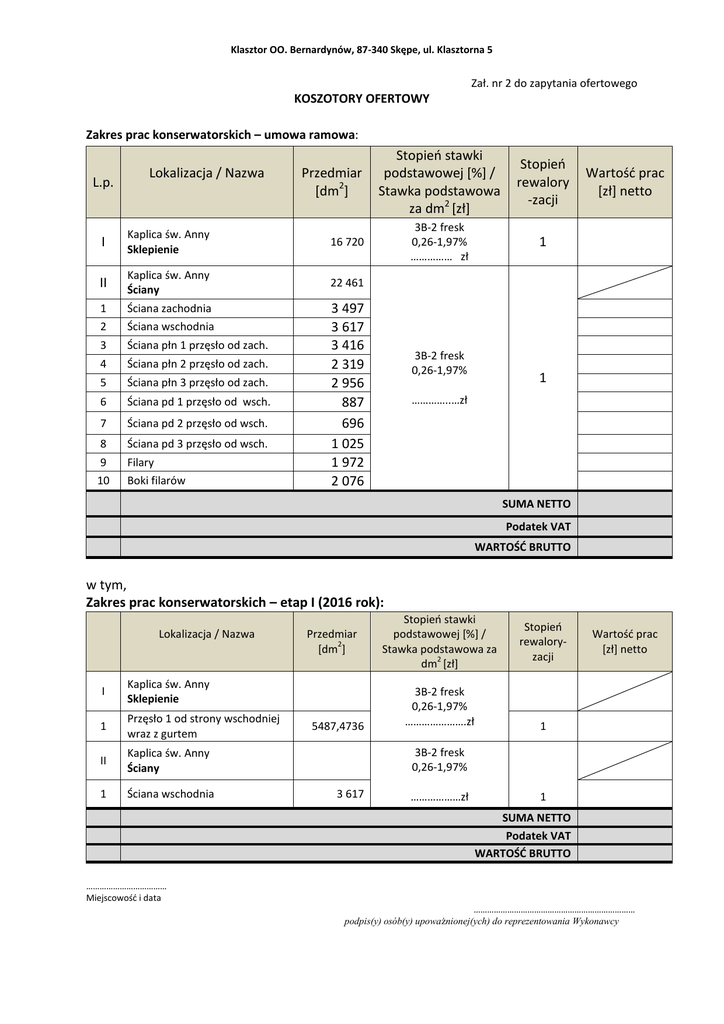 Klasztor OO. Bernardynów, 87-340 Skępe, ul. Klasztorna 5 Zał. nr 2 do zapytania ofertowego KOSZOTORY OFERTOWY Zakres prac konserwatorskich – umowa ramowa: L.p. Lokalizacja / Nazwa Przedmiar [dm2] I Kaplica św. Anny Sklepienie 16 720 II Kaplica św. Anny Ściany 22 461 1 Ściana zachodnia 2 Ściana wschodnia 3 Ściana płn 1 przęsło od zach. 4 Ściana płn 2 przęsło od zach. 5 Ściana płn 3 przęsło od zach. 6 Ściana pd 1 przęsło od wsch. 7 Ściana pd 2 przęsło od wsch. 8 Ściana pd 3 przęsło od wsch. 9 Filary 10 Boki filarów Stopień stawki podstawowej [%] / Stawka podstawowa za dm2 [zł] Stopień rewalory -zacji 3B-2 fresk 0,26-1,97% …………… zł 1 3 497 3 617 3 416 2 319 2 956 887 696 1 025 1 972 2 076 3B-2 fresk 0,26-1,97% Wartość prac [zł] netto 1 …………..…zł SUMA NETTO Podatek VAT WARTOŚĆ BRUTTO w tym, Zakres prac konserwatorskich – etap I (2016 rok): Lokalizacja / Nazwa I Kaplica św. Anny Sklepienie 1 Przęsło 1 od strony wschodniej wraz z gurtem II Kaplica św. Anny Ściany 1 Ściana wschodnia Przedmiar 2 [dm ] 5487,4736 Stopień stawki podstawowej [%] / Stawka podstawowa za 2 dm [zł] 3B-2 fresk 0,26-1,97% ………………….zł Stopień rewaloryzacji Wartość prac [zł] netto 1 3B-2 fresk 0,26-1,97% 3 617 ………………zł 1 SUMA NETTO Podatek VAT WARTOŚĆ BRUTTO ……………………………… Miejscowość i data ……………………………………………………………… podpis(y) osób(y) upoważnionej(ych) do reprezentowania Wykonawcy