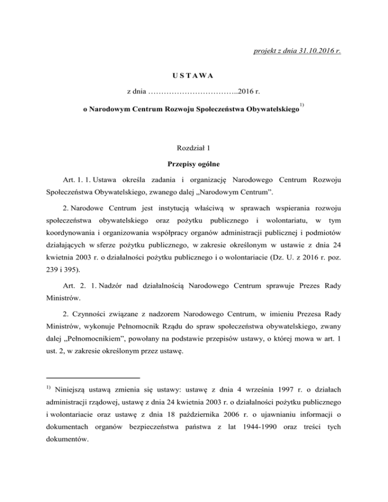 projekt z dnia 31.10.2016 r. U S T AWA z dnia ……………………………..2016 r. o Narodowym Centrum Rozwoju Społeczeństwa Obywatelskiego 1) Rozdział 1 Przepisy ogólne Art. 1. 1. Ustawa określa zadania i organizację Narodowego Centrum Rozwoju Społeczeństwa Obywatelskiego, zwanego dalej „Narodowym Centrum”. 2. Narodowe Centrum jest instytucją właściwą w sprawach wspierania rozwoju społeczeństwa obywatelskiego oraz pożytku publicznego i wolontariatu, w tym koordynowania i organizowania współpracy organów administracji publicznej i podmiotów działających w sferze pożytku publicznego, w zakresie określonym w ustawie z dnia 24 kwietnia 2003 r. o działalności pożytku publicznego i o wolontariacie (Dz. U. z 2016 r. poz. 239 i 395). Art. 2. 1. Nadzór nad działalnością Narodowego Centrum sprawuje Prezes Rady Ministrów. 2. Czynności związane z nadzorem Narodowego Centrum, w imieniu Prezesa Rady Ministrów, wykonuje Pełnomocnik Rządu do spraw społeczeństwa obywatelskiego, zwany dalej „Pełnomocnikiem”, powołany na podstawie przepisów ustawy, o której mowa w art. 1 ust. 2, w zakresie określonym przez ustawę. 1) Niniejszą ustawą zmienia się ustawy: ustawę z dnia 4 września 1997 r. o działach administracji rządowej, ustawę z dnia 24 kwietnia 2003 r. o działalności pożytku publicznego i wolontariacie oraz ustawę z dnia 18 października 2006 r. o ujawnianiu informacji o dokumentach organów bezpieczeństwa państwa z lat 1944-1990 oraz treści tych dokumentów. –2– 3. Narodowe Centrum jest agencją wykonawczą w rozumieniu ustawy z dnia 27 sierpnia 2009 r. o finansach publicznych (Dz. U. z 2013 r. poz. 885, z późn. zm. 2)) powołaną do realizacji zadań z zakresu rozwoju społeczeństwa obywatelskiego. 4. Siedzibą Narodowego Centrum jest miasto stołeczne Warszawa. 5. Prezes Rady Ministrów nadaje, w drodze zarządzenia, statut, który określa organizację wewnętrzną Narodowego Centrum. Rozdział 2 Organy i organizacja Narodowego Centrum Art. 3. Organami Narodowego Centrum są: 1) Prezes Narodowego Centrum; 2) Rada Narodowego Centrum. Art. 4. 1. Prezes Narodowego Centrum jest powoływany przez Prezesa Rady Ministrów na pięcioletnią kadencję, spośród osób, które: 1) posiadają obywatelstwo polskie; 2) korzystają z pełni praw publicznych; 3) posiadają wyższe wykształcenie magisterskie lub równorzędne; 4) posiadają odpowiednią wiedzę w zakresie działalności pożytku publicznego i wolontariatu w Rzeczypospolitej Polskiej, posiadają co najmniej 5-letnie doświadczenie w sektorze obywatelskim; 5) nie były skazane prawomocnym wyrokiem za umyślne przestępstwo lub umyślne przestępstwo skarbowe; 6) cieszą się nieposzlakowaną opinią i dają rękojmię prawidłowego wykonywania powierzonych zadań; 2) Zmiany tekstu jednolitego wymienionej ustawy zostały ogłoszone w Dz. U. z 2013 r. poz. 938 i 1646, z 2014 r. poz. 379, 911, 1146, 1626 i 1877, z 2015 r. poz. 238, 532 , 1117, 1045, 1130, 1189, 1190 , 1269, 1358, 1513, 1830, 1854, 1890 i 2150, z 2016 r. poz. 195. –3– 7) posiadają znajomość języka angielskiego w stopniu umożliwiającym swobodne porozumiewanie się w zakresie działalności Narodowego Centrum. 2. Prezes Narodowego Centrum pełni obowiązki do dnia powołania swego następcy. Art. 5. 1. Prezes Rady Ministrów odwołuje Prezesa Narodowego Centrum przed upływem kadencji wyłącznie w przypadku: 1) zaprzestania spełniania któregokolwiek z wymagań określonych w art. 4 ust. 1 pkt 1, 2, 5, lub 2) rezygnacji ze stanowiska, lub 3) utraty zdolności do pełnienia powierzonych obowiązków na skutek długotrwałej choroby, trwającej dłużej niż 6 miesięcy, lub 4) działania niezgodnego z prawem, zasadami rzetelności, gospodarności, celowości a także etyki zawodowej; 5) niezatwierdzenia rocznego sprawozdania z działalności Narodowego Centrum lub jego nieprzedstawienia w terminie określonym w art. 7 ust. 6; 6) niezatwierdzenia rocznego sprawozdania finansowego lub jego nieprzedstawienia w terminie określonym w art. 7 ust. 7. 2. Kadencja Prezesa Narodowego Centrum wygasa w razie jego śmierci lub odwołania. 3. W razie wygaśnięcia kadencji Prezesa Narodowego Centrum, o którym mowa w ust. 2, do czasu powołania nowego Prezesa Narodowego Centrum, jego obowiązki pełni Zastępca Prezesa Narodowego Centrum wskazany przez Prezesa Rady Ministrów. Art. 6. 1 Zastępców Prezesa Narodowego Centrum powołuje Prezes Rady Ministrów na wniosek Prezesa Narodowego Centrum. Zastępcą Prezesa Narodowego Centrum może być osoba, która spełnia wymogi określone w art. 4 ust. 1. 2. Prezes Rady Ministrów, na wniosek Prezesa Narodowego Centrum, odwołuje zastępców Prezesa Narodowego Centrum. Art. 7. 1. Prezes Narodowego Centrum kieruje działalnością Narodowego Centrum, w szczególności podejmuje decyzje we wszystkich sprawach niezastrzeżonych dla Rady Narodowego Centrum. 2. Prezes Narodowego Centrum przygotowuje i przedstawia do zatwierdzenia Pełnomocnikowi do dnia 30 sierpnia każdego roku projekt rocznego planu działalności –4– Narodowego Centrum na rok kolejny, pozytywnie zaopiniowany przez Radę Narodowego Centrum. 3. Prezes Narodowego Centrum jest uprawniony do samodzielnego dokonywania czynności prawnych w imieniu Narodowego Centrum i reprezentuje je na zewnątrz. 4. Prezes Narodowego Centrum jest odpowiedzialny za gospodarkę finansową Narodowego Centrum oraz za zarządzanie i gospodarowanie majątkiem Narodowego Centrum. 5. Prezes Narodowego Centrum przygotowuje: 1) projekt rocznego planu finansowego Narodowego Centrum; 2) projekt rocznego planu działalności Narodowego Centrum; 3) okresowe i końcowe sprawozdania z realizacji programów Narodowego Centrum; 4) roczne sprawozdanie z działalności Narodowego Centrum; 5) roczne sprawozdania finansowe Narodowego Centrum. 6. W terminie do dnia 31 marca każdego roku Prezes Narodowego Centrum przedstawia Pełnomocnikowi do