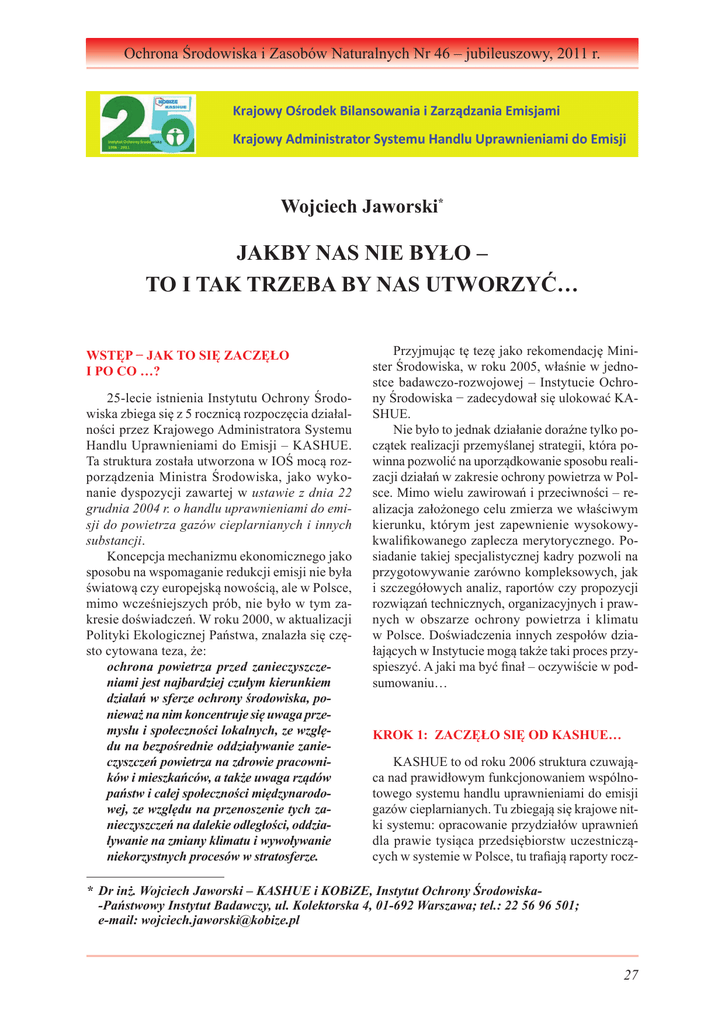 Ochrona Środowiska i Zasobów Naturalnych Nr 46 – jubileuszowy, 2011 r. Wojciech Jaworski* Jakby nas nie było – to i tak trzeba by nas utworzyć… Wstęp − jak to się zaczęło i po co …? 25-lecie istnienia Instytutu Ochrony Środowiska zbiega się z 5 rocznicą rozpoczęcia działalności przez Krajowego Administratora Systemu Handlu Uprawnieniami do Emisji – KASHUE. Ta struktura została utworzona w IOŚ mocą rozporządzenia Ministra Środowiska, jako wykonanie dyspozycji zawartej w ustawie z dnia 22 grudnia 2004 r. o handlu uprawnieniami do emisji do powietrza gazów cieplarnianych i innych substancji. Koncepcja mechanizmu ekonomicznego jako sposobu na wspomaganie redukcji emisji nie była światową czy europejską nowością, ale w Polsce, mimo wcześniejszych prób, nie było w tym zakresie doświadczeń. W roku 2000, w aktualizacji Polityki Ekologicznej Państwa, znalazła się często cytowana teza, że: ochrona powietrza przed zanieczyszczeniami jest najbardziej czułym kierunkiem działań w sferze ochrony środowiska, ponieważ na nim koncentruje się uwaga przemysłu i społeczności lokalnych, ze względu na bezpośrednie oddziaływanie zanieczyszczeń powietrza na zdrowie pracowników i mieszkańców, a także uwaga rządów państw i całej społeczności międzynarodowej, ze względu na przenoszenie tych zanieczyszczeń na dalekie odległości, oddziaływanie na zmiany klimatu i wywoływanie niekorzystnych procesów w stratosferze. Przyjmując tę tezę jako rekomendację Minister Środowiska, w roku 2005, właśnie w jednostce badawczo-rozwojowej – Instytucie Ochrony Środowiska − zadecydował się ulokować KASHUE. Nie było to jednak działanie doraźne tylko początek realizacji przemyślanej strategii, która powinna pozwolić na uporządkowanie sposobu realizacji działań w zakresie ochrony powietrza w Polsce. Mimo wielu zawirowań i przeciwności – realizacja założonego celu zmierza we właściwym kierunku, którym jest zapewnienie wysokowykwalifikowanego zaplecza merytorycznego. Posiadanie takiej specjalistycznej kadry pozwoli na przygotowywanie zarówno kompleksowych, jak i szczegółowych analiz, raportów czy propozycji rozwiązań technicznych, organizacyjnych i prawnych w obszarze ochrony powietrza i klimatu w Polsce. Doświadczenia innych zespołów działających w Instytucie mogą także taki proces przyspieszyć. A jaki ma być finał – oczywiście w podsumowaniu… Krok 1: zaczęło się od KASHUE… KASHUE to od roku 2006 struktura czuwająca nad prawidłowym funkcjonowaniem wspólnotowego systemu handlu uprawnieniami do emisji gazów cieplarnianych. Tu zbiegają się krajowe nitki systemu: opracowanie przydziałów uprawnień dla prawie tysiąca przedsiębiorstw uczestniczących w systemie w Polsce, tu trafiają raporty rocz- * Dr inż. Wojciech Jaworski – KASHUE i KOBiZE, Instytut Ochrony Środowiska- -Państwowy Instytut Badawczy, ul. Kolektorska 4, 01-692 Warszawa; tel.: 22 56 96 501; e-mail: [email protected] 27 Wojciech Jaworski ne wskazujące na wielkość emisji CO2 i tu wreszcie jest prowadzony rejestr uprawnień, w którym są zgromadzone informacje o transakcjach pomiędzy uczestnikami systemu. To w tym rejestrze są dokonywane roczne rozliczenia emisji poszczególnych podmiotów uprawnieniami (EUA – European Union Allowances). w dyspozycji NFOŚiGW. I te gwarancje finansowe to jeden z bardzo ważnych elementów stabilizacji zaplecza merytorycznego w tym obszarze. Handel uprawnieniami do emisji dwutlenku węgla został utworzony w państwach Unii Europejskiej w roku 2005, jako narzędzie, które miało pomóc krajom wspólnoty w wywiązaniu się ze zobowiązań redukcji emisji gazów cieplarnianych określonych w Protokole z Kioto do Ramowej Konwencji Narodów Zjednoczonych w sprawie Zmian Klimatu (UNFCCC). Trudno dziś jednoznacznie ocenić, co legło u podstaw podjęcia takiej decyzji. Polska weszła do Unii Europejskiej dopiero od 1 maja 2004 r. i nie uczestniczyła w spotkaniach politycznych Unii, a więc nie mogła współtworzyć koncepcji całego systemu. Dlatego dziś, po 5 latach, mamy do systemu wiele zastrzeżeń i wątpliwości. Nie zmienia to jednak naszego podejścia do realizacji wszystkich zadań związanych z jego funkcjonowaniem dziś i w przyszłości, a przede wszystkim do konieczności dalszej redukcji emisji gazów cieplarnianych. Najważniejszym na starcie funkcjonowania KASHUE zadaniem było wydanie uprawnień do emisji gazów cieplarnianych na lata 2005 i 2006, rozliczenie emisji i uprawnień za rok 2005 oraz opracowanie i przedstawienie już w połowie 2006 r. do Komisji Europejskiej projektu Krajowego Planu Rozdziału Uprawnień na drugi okres rozliczeniowy 2008−2012. Wszystkie te zadania wykonano zgodnie z regułami i wymaganiami prawa międzynarodowego, wspólnotowego i krajowego. Był to okres „szybkiego uczenia się” młodej ekipy ekspertów, którzy stali się pracownikami IOŚ i w przeważającej liczbie pracowali ze sobą po raz pierwszy. W strukturach KASHUE od początku znalazł się też zespół Krajowego Centrum Inwentaryzacji Emisji (KCIE), utworzony w IOŚ w roku 2000. Zadania te, niektóre dodatkowo uszczegółowione, były następnie przedmiotem rozliczania się z działań KASHUE w ramach porozumienia pomiędzy Ministerstwem Środowiska, Narodowym Funduszem Ochrony Środowiska i Gospodarki Wodnej oraz Instytutem Ochrony Środowiska. Dzięki temu porozumieniu od początku mamy zabezpieczone finansowanie ze środków będących Końcówka prac nad KPRU-2 miała miejsce na początku roku 2008. Tak jak poprzednio, Komisja Europejska zdecydowanie obcięła liczbę uprawnień, na jakie mogły liczyć krajowe instalacje w tym rozdaniu (2008−2012). Trzeba więc było dokonać istotnych cięć, które nie podobały się zarówno energetyce, jak i ciepłownictwu, a jeszcze bardziej operatorom instalacji technologicznych. To był także kolejny etap ankietyzacji przedsięb