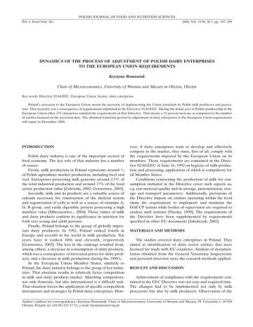POLISH JOURNAL OF FOOD AND NUTRITION SCIENCES Pol. J. Food Nutr. Sci. 2006, Vol. 15/56, SI 1, pp. 187–189 DYNAMICS OF THE PROCESS OF ADJUSTMENT OF POLISH DAIRY ENTERPRISES TO THE EUROPEAN UNION REQUIREMENTS Krystyna Romaniuk Chair of Microeconomics, University of Warmia and Mazury in Olsztyn, Olsztyn Key words: Directive 92/46/EEC, European Union, license, dairy enterprises Poland’s accession to the European Union meant the necessity of implementing the Union standards by Polish milk producers and processors. That necessity was a consequence of requirements stipulated in the Directive 92/46/EEC. During the initial year of Polish membership in the European Union other 235 enterprises satisfied the requirements of that Directive. That means a 15 percent increase as compared to the number of entities licensed on the accession date. The obtained transition period for adjustment of dairy enterprises to the European Union requirements will expire in December 2006. INTRODUCTION Polish dairy industry is one of the important sectors of food economy. The key role of that industry has a number of causes. Firstly, milk production in Poland represents around 1/4 of Polish agriculture market production, including beef and veal. Enterprises processing milk generate around 2.5% of the total industrial production and around 17% of the food sector production value [Zalewski, 2002; Gornowicz, 2003]. Secondly, milk and its products are a valuable source of calcium necessary for construction of the skeletal system and regeneration of cells as well as a source of vitamins A, D, B group, and easily digestible protein possessing a high nutritive value [Mleczarstwo... 2004]. Those values of milk and dairy products confirm its significance in nutrition for both very young and adult persons. Finally, Poland belongs to the group of globally important dairy producers. In 1991, Poland ranked fourth in Europe and seventh in the world in milk production. Ten years later it ranked fifth and eleventh, respectively [Gornowicz, 2003]. The loss in the rankings resulted from, among others, a decrease in consumption of dairy products, which was a consequence of increased prices for dairy products, and a decrease in milk production during the 1990’s. In the European Union Member States, similarly to Poland, the dairy industry belongs to the group of key industries. That situation results in relatively fierce competition in milk and dairy products market. Matching competitors, not only domestic, but also international is a difficult task. That situation forces the application of specific competition instruments and strategies by Polish dairy enterprises. How- ever, if dairy enterprises want to develop and effectively compete in the market, they must, first of all, comply with the requirements imposed by the European Union on its members. Those requirements are contained in the Directive 92/46/EEC of June 16, 1992 on hygiene of milk production and processing, application of which is compulsory for all Member States. Conditions concerning the production of milk for consumption included in the Directive cover such aspects as, e.g. raw material quality and its storage, pasteurisation, storage and transport parameters. Additionally, provisions of the Directive impose on entities operating within the food chain the requirement to implement and maintain the HACCP system while bodies of supervision are required to analyse such systems [Niecka, 1999]. The requirements of the Directive have been supplemented by requirements specified in other EU documents [Jakubczyk, 2002]. MATERIALS AND METHODS The studies covered dairy enterprises in Poland. They aimed at identification of dairy sector entities that were licensed for trade with EU countries. Analysis of documentation obtained from the General Veterinary Inspectorate and personal interview were the research methods applied. RESULTS AND DISCUSSION Achievement of compliance with the requirements contained in the EEC Directive was not easy and required time. The changes had to be implemented not only by milk processors but also by milk producers. Observation of the Author’s address for correspondence: Krystyna Romaniuk, Chair of Microeconomics, University of Warmia and Mazury, Pl. Cieszyñski 1, 10-950 Olsztyn, Poland; tel. (48 89) 523 37 55; e-mail: [email protected] 188 K. Romaniuk dairy sector enables concluding that the acceleration of work involved in implementation of the EU standards occurred immediately before accession and immediately after it. The transition periods achieved by Poland during negotiations should be seen as the main reason for that development of the situation. The transition period will finally termiante with the end of December 2006. On the date of Poland’s accession to the European Union the total number of enterprises processing milk that were compliant with the Directive 92/46/EEC was 204 (a year later 235) while further 144 entities were granted transition period. The largest numbers of dairy enterprises complying with the EU standards are located in provinces of: Wielkopolskie, Mazowieckie, £ódzkie and Kujawsko-Pomorskie. The total number of such enterprises in those provinces is 109, representing around 46% of all entities licensed to trade with the European Union countries. That means that almost every second dairy enterprise licensed to export its products to the EU countries is located in those provinces. The second area leading in the number of entities compliant with the Directive is the area of provinces: Opolskie, Podlaskie and Warmiñsko-Mazurskie. In those provinces 47 enterprises are licensed representing around 20% of their total number. On the other hand provinces of Podkarpackie, Zachodniopomorskie and Œwiêtokrzyskie are those with the smallest numbers of enterprises with implemented EU standards (Table 1). The above data does not reflect the situation in the dairy industry in full. We should compare it with the total number of da