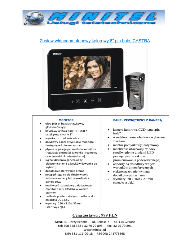 Zestaw wideodomofonowy kolorowy 8" pin hole, CASTRA MONITOR ultra płaski, bezsłuchawkowy, głośnomówiący kolorowy wyświetlacz TFT-LCD o przekątnej ekranu 8" wysoka rozdzielczość obrazu dotykowy panel przycisków monitora dostępny w kolorze czarnym płynna regulacja parametrów monitora (regulacja głośności dzwonka i rozmowy oraz jasności i kontrastu barw) sygnał dzwonka generowany elektronicznie (8 dźwięków dzwonka do wyboru) dodatkowe sterowanie bramą podgląd tego co się dzieje w polu widzenia kamery bez wywołania z panela zew. możliwość rozbudowy o dodatkowy monitor z serii CASTRA w kolorze czarnym zasilanie prądem stałym z zasilacza do gniazdka DC 13,5V wymiary: 250 x 210 x 35 mm (szer./wys./gł.) PANEL ZEWNĘTRZNY Z KAMERĄ kamera kolorowa CCD typu „pinhole” wandaloodporna obudowa wykonana z żeliwa montaż podtynkowy, natynkowy możliwość obserwacji w nocy (podświetlenie diodami LED pracującymi w zakresie promieniowania podczerwonego) odporny na szkodliwy wpływ warunków atmosferycznych elektrozaczep nie wymaga dodatkowego zasilania wymiary: 70 x 160 x 27 mm (szer./wys./gł.) Cena zestawu : 999 PLN MINITEL - Jerzy Rzepka ul. Bekasa 7 44-114 Gliwice tel: 600 328 338 / 32 79 79 895 fax: 32 79 79 891 www.minitel.pl NIP: 631-111-00-18 REGON: 241775668