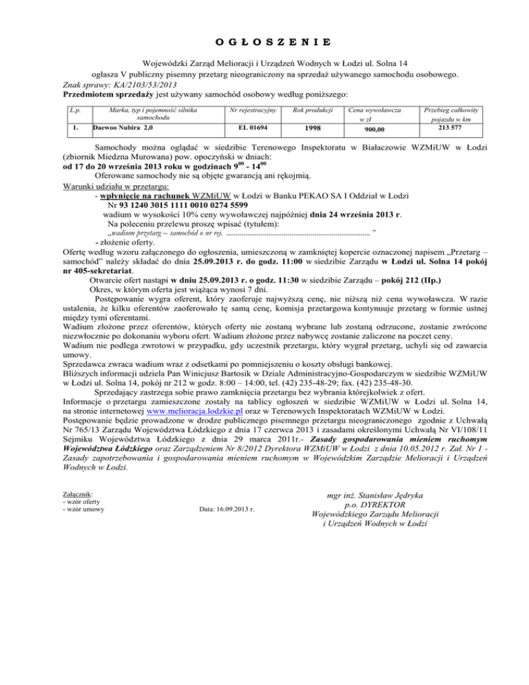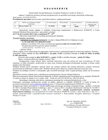 O G Ł O S Z E N I E Wojewódzki Zarząd Melioracji i Urządzeń Wodnych w Łodzi ul. Solna 14 ogłasza V publiczny pisemny przetarg nieograniczony na sprzedaż używanego samochodu osobowego. Znak sprawy: KA/2103/53/2013 Przedmiotem sprzedaży jest używany samochód osobowy według poniższego: Marka, typ i pojemność silnika samochodu L.p. 1. Daewoo Nubira 2,0 Nr rejestracyjny Rok produkcji Cena wywoławcza w zł EL 01694 1998 900,00 Przebieg całkowity pojazdu w km 213 577 Samochody można oglądać w siedzibie Terenowego Inspektoratu w Białaczowie WZMiUW w Łodzi (zbiornik Miedzna Murowana) pow. opoczyński w dniach: od 17 do 20 września 2013 roku w godzinach 900 - 1400 Oferowane samochody nie są objęte gwarancją ani rękojmią. Warunki udziału w przetargu: - wpłynięcie na rachunek WZMiUW w Łodzi w Banku PEKAO SA I Oddział w Łodzi Nr 93 1240 3015 1111 0010 0274 5599 wadium w wysokości 10% ceny wywoławczej najpóźniej dnia 24 września 2013 r. Na poleceniu przelewu proszę wpisać (tytułem): „wadium przetarg – samochód o nr rej. ........................................................................... ” - złożenie oferty. Ofertę według wzoru załączonego do ogłoszenia, umieszczoną w zamkniętej kopercie oznaczonej napisem „Przetarg – samochód” należy składać do dnia 25.09.2013 r. do godz. 11:00 w siedzibie Zarządu w Łodzi ul. Solna 14 pokój nr 405-sekretariat. Otwarcie ofert nastąpi w dniu 25.09.2013 r. o godz. 11:30 w siedzibie Zarządu – pokój 212 (IIp.) Okres, w którym oferta jest wiążąca wynosi 7 dni. Postępowanie wygra oferent, który zaoferuje najwyższą cenę, nie niższą niż cena wywoławcza. W razie ustalenia, że kilku oferentów zaoferowało tę samą cenę, komisja przetargowa kontynuuje przetarg w formie ustnej między tymi oferentami. Wadium złożone przez oferentów, których oferty nie zostaną wybrane lub zostaną odrzucone, zostanie zwrócone niezwłocznie po dokonaniu wyboru ofert. Wadium złożone przez nabywcę zostanie zaliczone na poczet ceny. Wadium nie podlega zwrotowi w przypadku, gdy uczestnik przetargu, który wygrał przetarg, uchyli się od zawarcia umowy. Sprzedawca zwraca wadium wraz z odsetkami po pomniejszeniu o koszty obsługi bankowej. Bliższych informacji udziela Pan Winicjusz Bartosik w Dziale Administracyjno-Gospodarczym w siedzibie WZMiUW w Łodzi ul. Solna 14, pokój nr 212 w godz. 8:00 – 14:00, tel. (42) 235-48-29; fax. (42) 235-48-30. Sprzedający zastrzega sobie prawo zamknięcia przetargu bez wybrania którejkolwiek z ofert. Informacje o przetargu zamieszczone zostały na tablicy ogłoszeń w siedzibie WZMiUW w Łodzi ul. Solna 14, na stronie internetowej www.melioracja.lodzkie.pl oraz w Terenowych Inspektoratach WZMiUW w Łodzi. Postępowanie będzie prowadzone w drodze publicznego pisemnego przetargu nieograniczonego zgodnie z Uchwałą Nr 765/13 Zarządu Województwa Łódzkiego z dnia 17 czerwca 2013 i zasadami określonymi Uchwałą Nr VI/108/11 Sejmiku Województwa Łódzkiego z dnia 29 marca 2011r.- Zasady gospodarowania mieniem ruchomym Województwa Łódzkiego oraz Zarządzeniem Nr 8/2012 Dyrektora WZMiUW w Łodzi z dnia 10.05.2012 r. Zał. Nr 1 Zasady zapotrzebowania i gospodarowania mieniem ruchomym w Wojewódzkim Zarządzie Melioracji i Urządzeń Wodnych w Łodzi. Załącznik: - wzór oferty - wzór umowy Data: 16.09.2013 r. mgr inż. Stanisław Jędryka p.o. DYREKTOR Wojewódzkiego Zarządu Melioracji i Urządzeń Wodnych w Łodzi